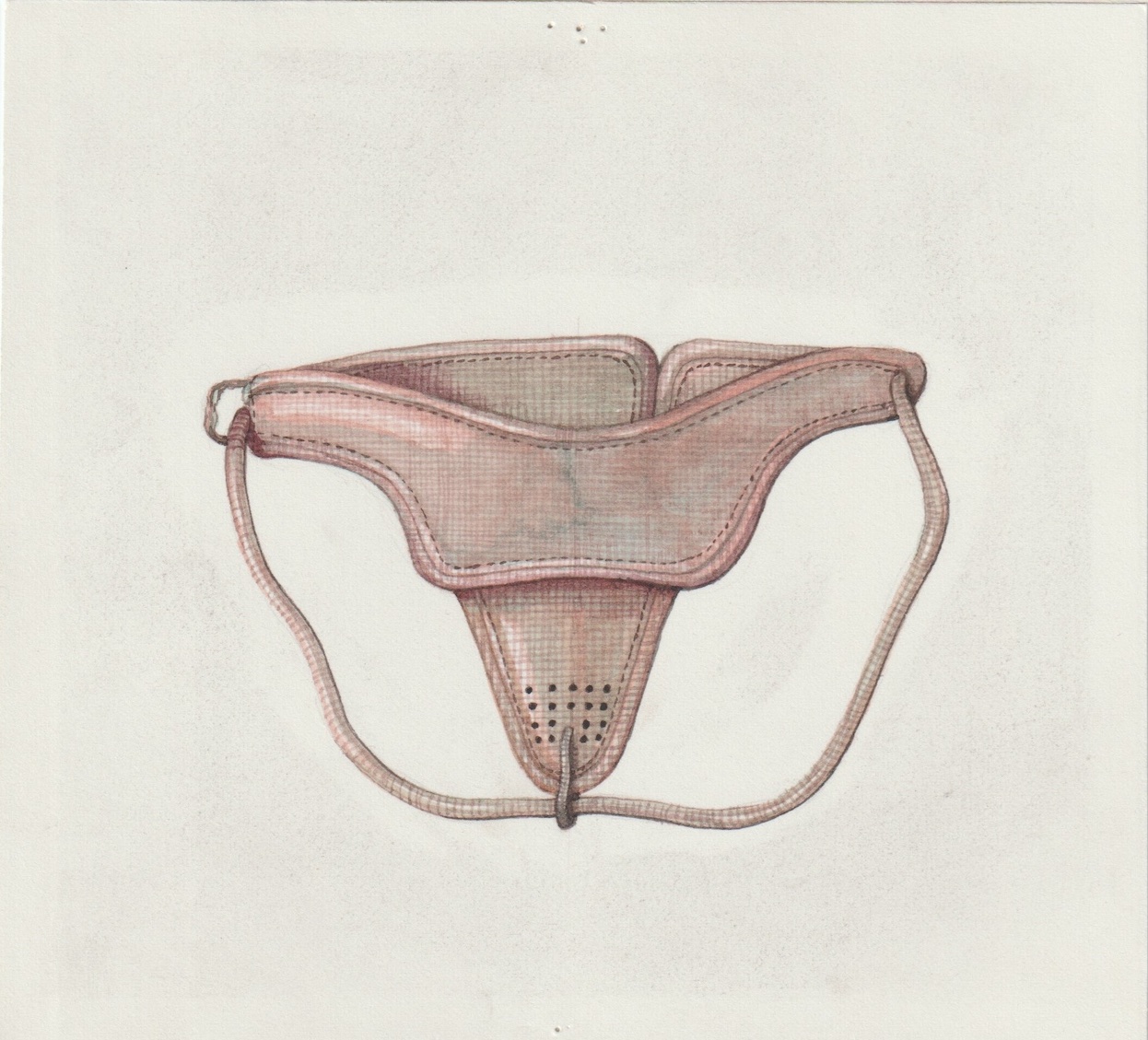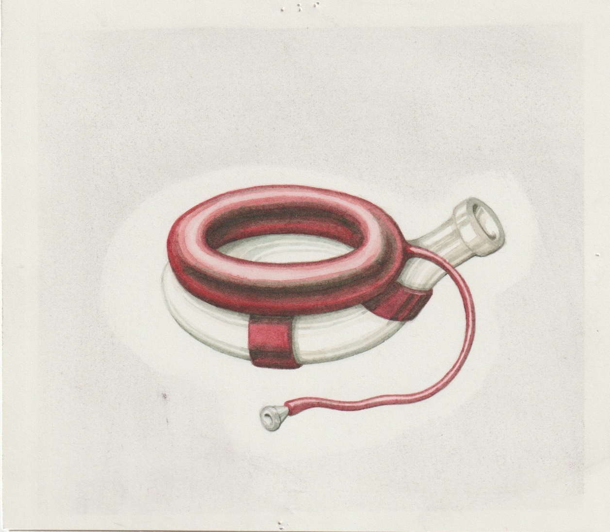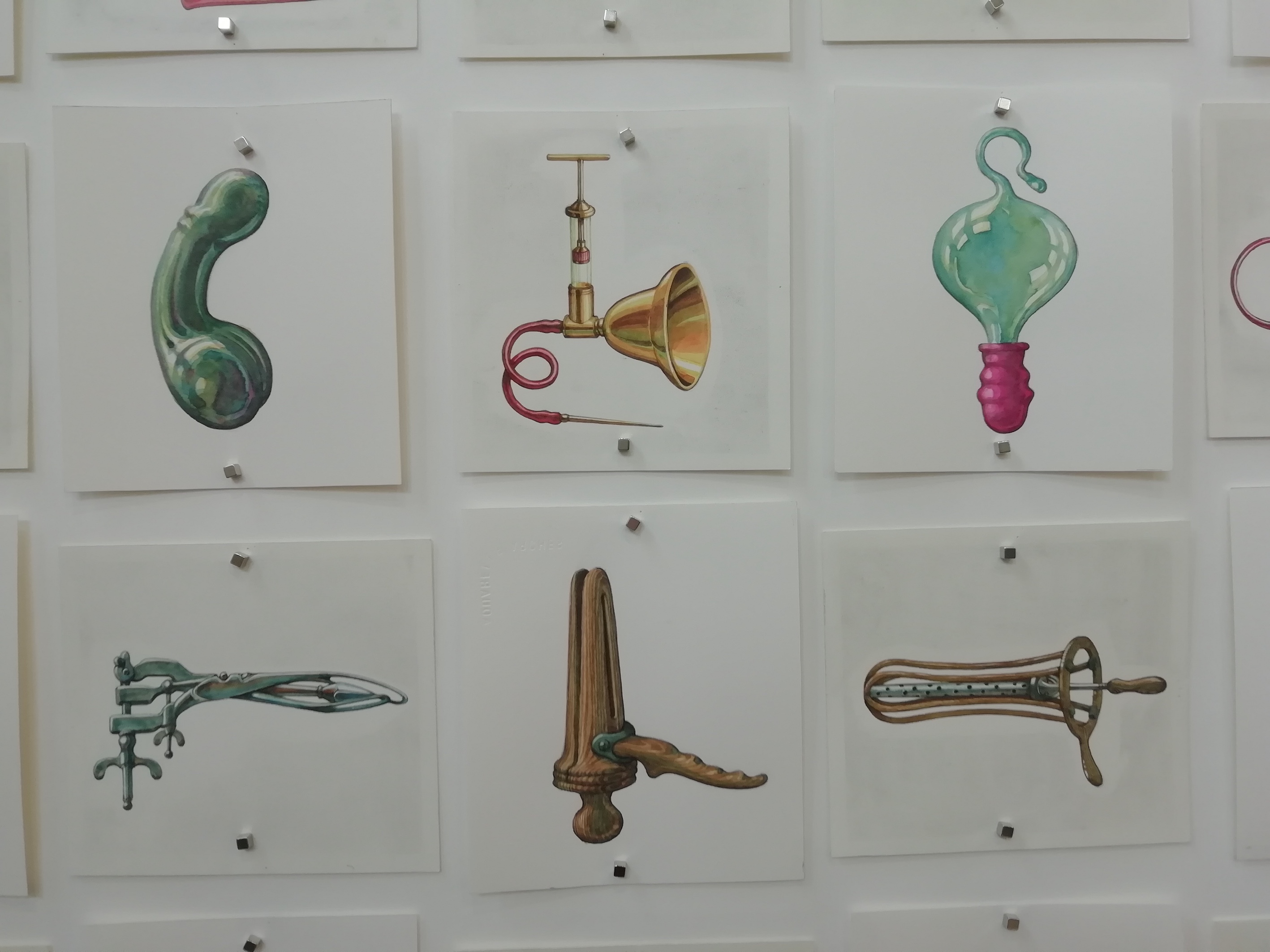 Dans la série « Chair à canon », j’ai repris à l’aquarelle des images issues d’un manuel de médecine des années 1920. Cette série a d’abord été présentée dans un lieu nommé « La Cage », une exposition installée dans une cage d’escalier et intitulée « A. Biet montant un escalier ».