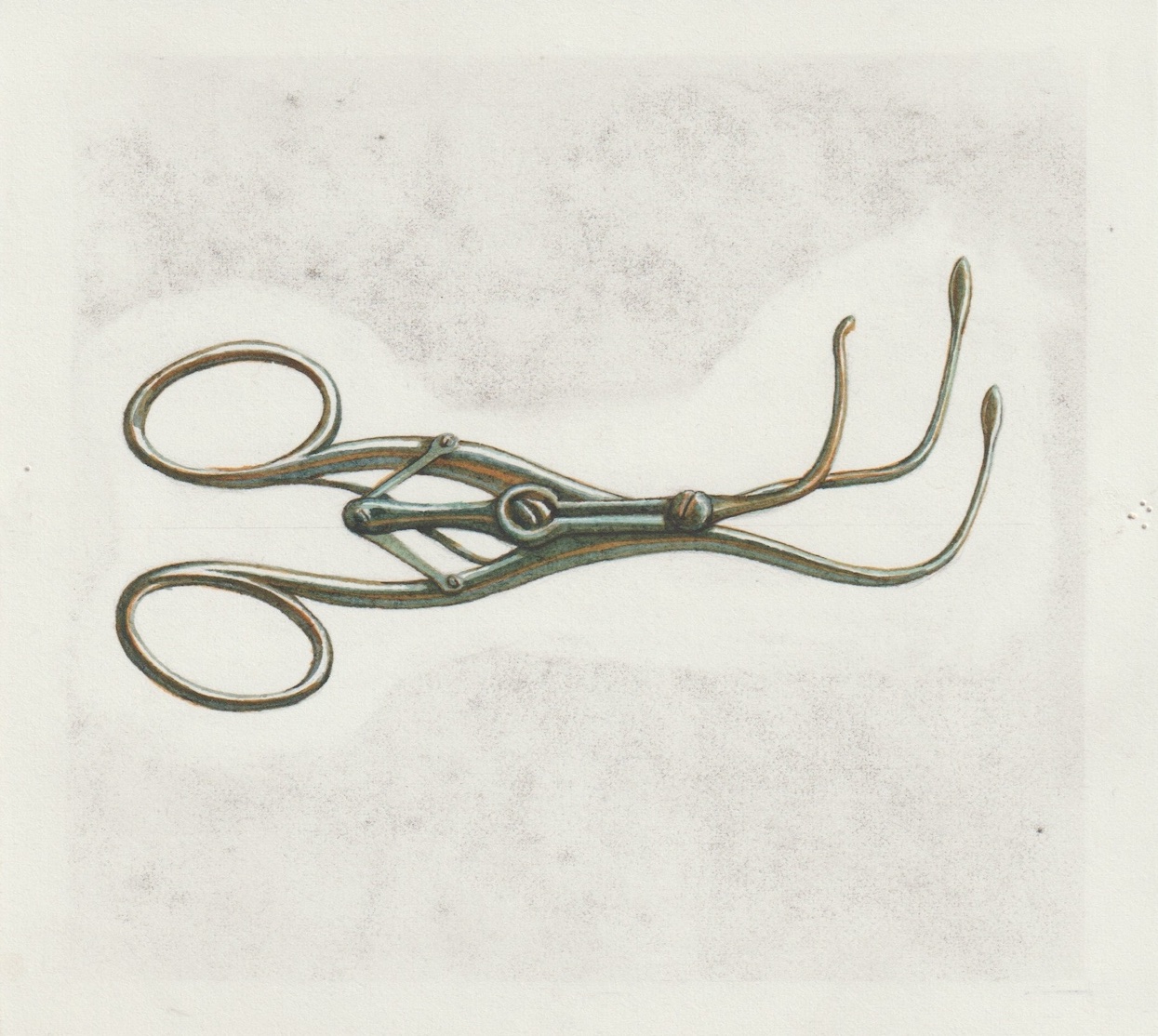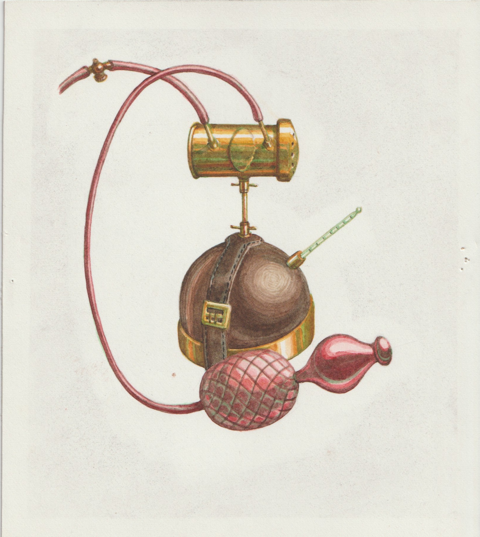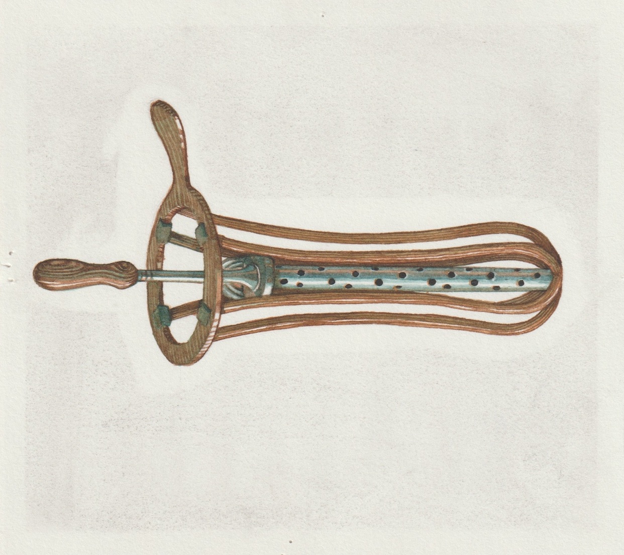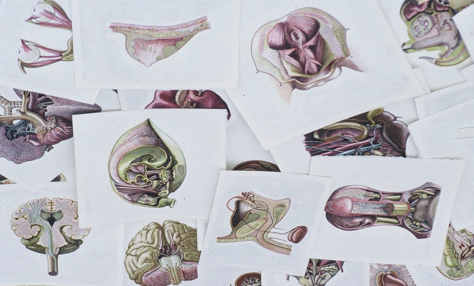 Dans la série « Chair à canon », j’ai repris à l’aquarelle des images issues d’un manuel de médecine des années 1920. Cette série a d’abord été présentée dans un lieu nommé « La Cage », une exposition installée dans une cage d’escalier et intitulée « A. Biet montant un escalier ».