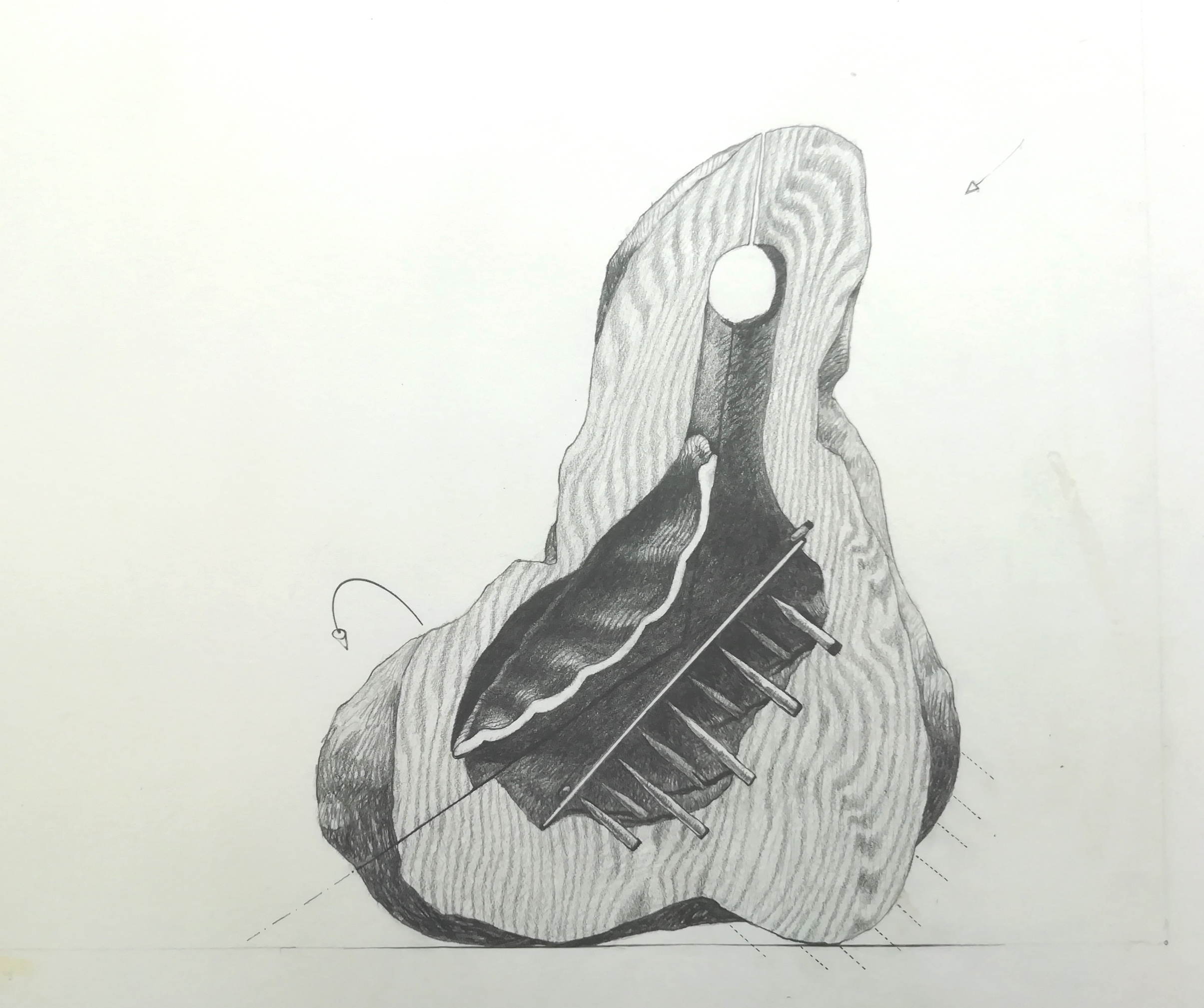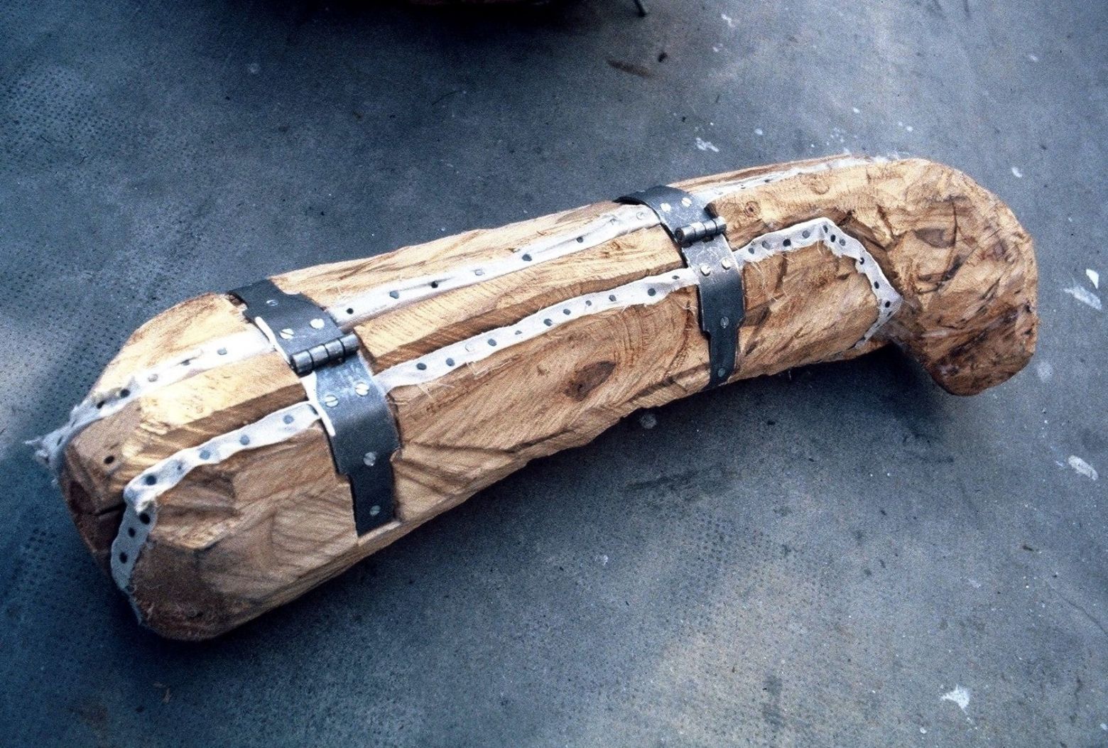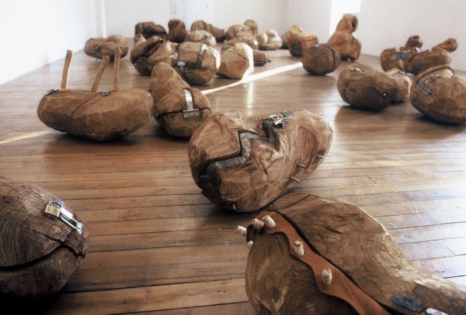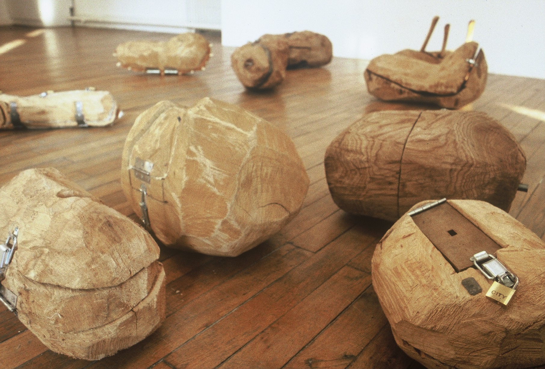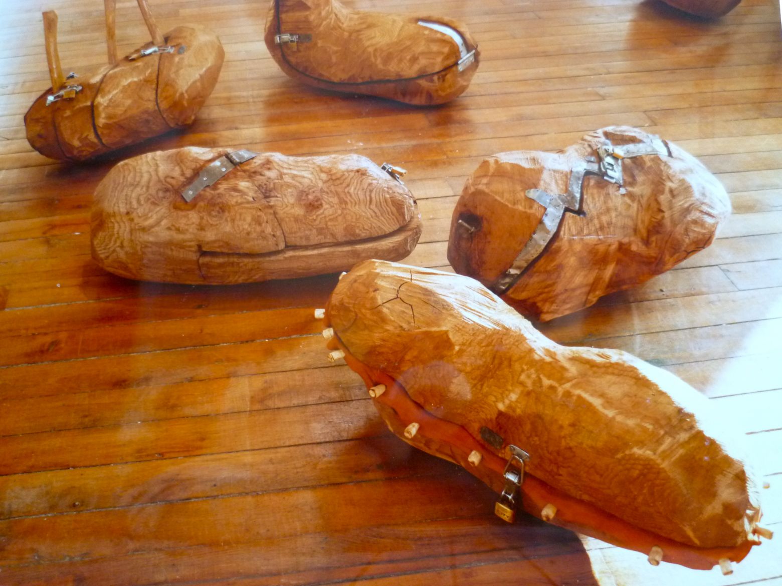 Chaque forme en bois est creusée, enferme des objets confectionnés ou récoltés et ensuite cadenassée.