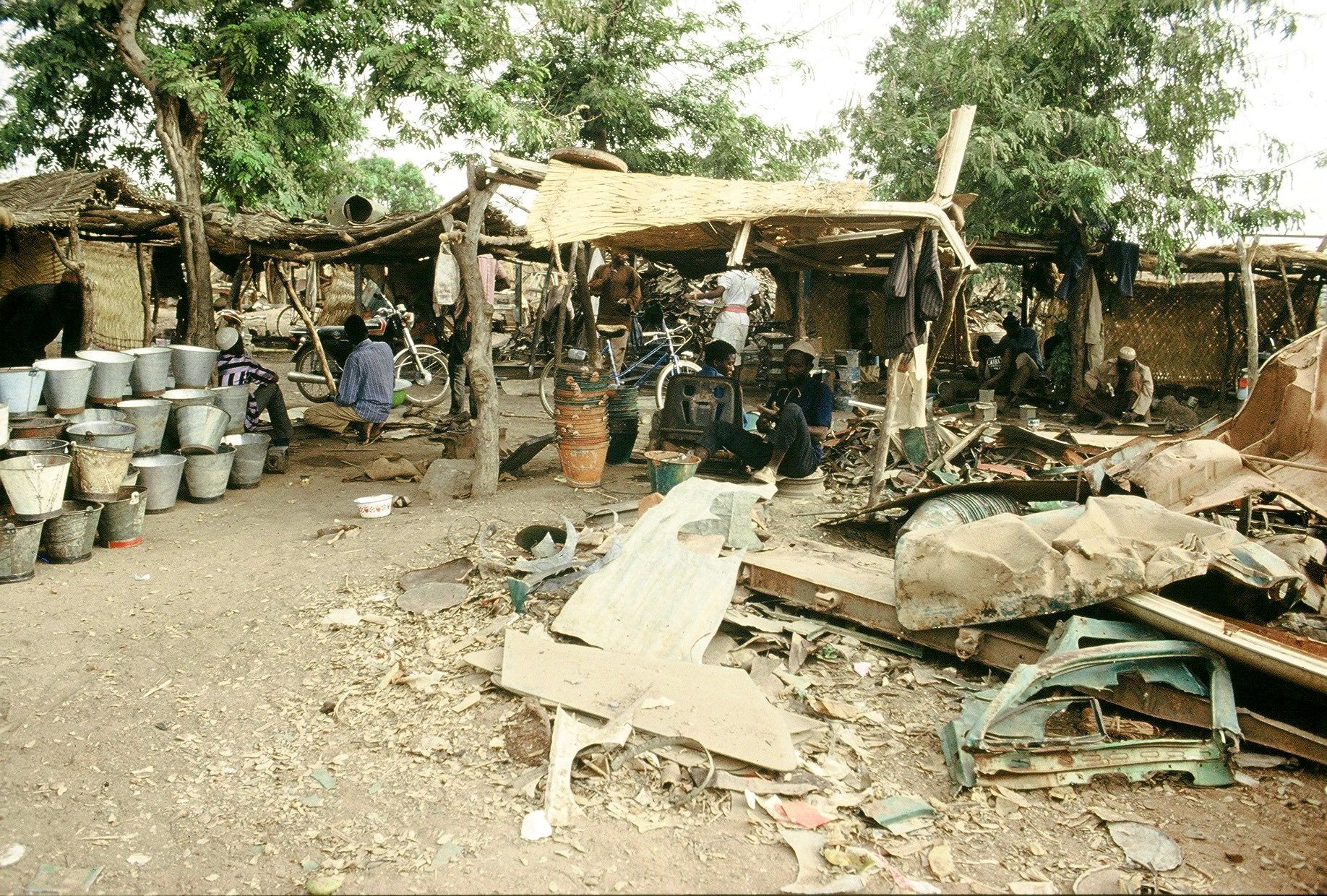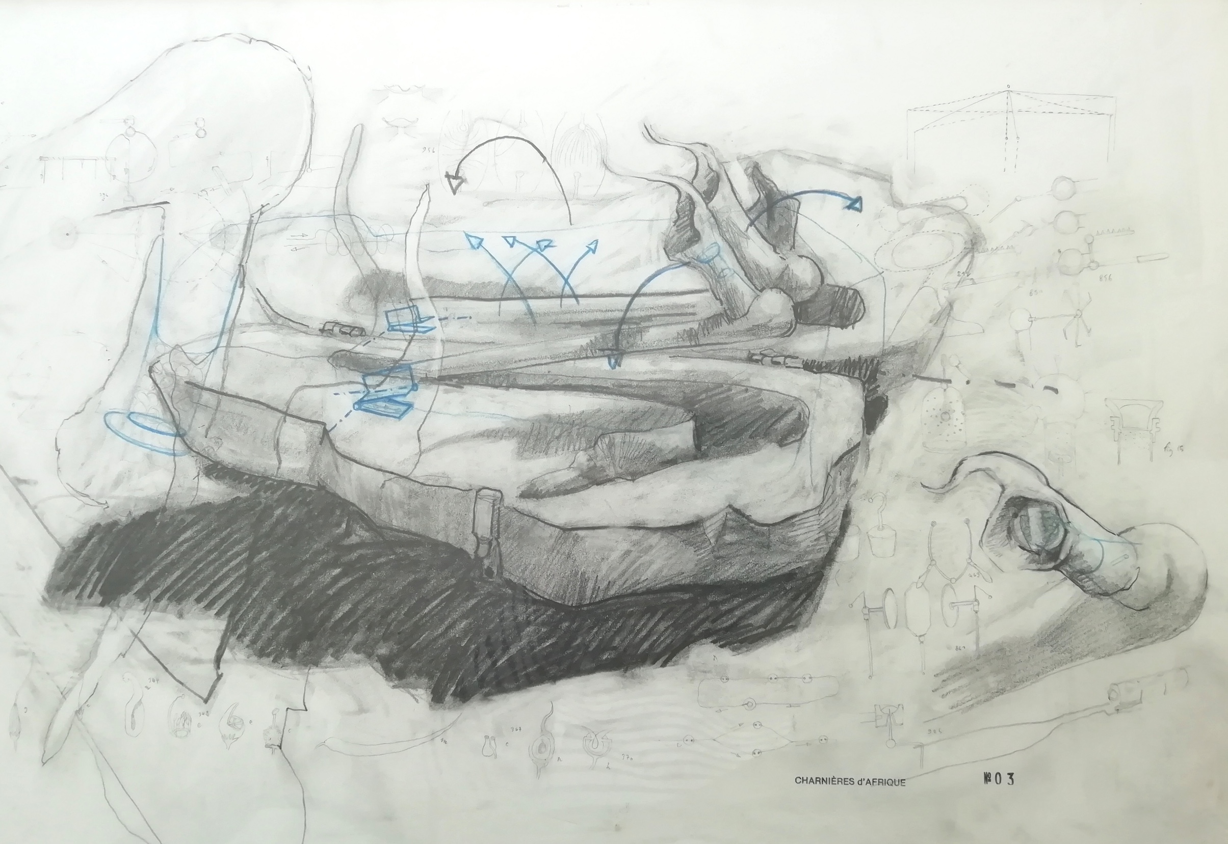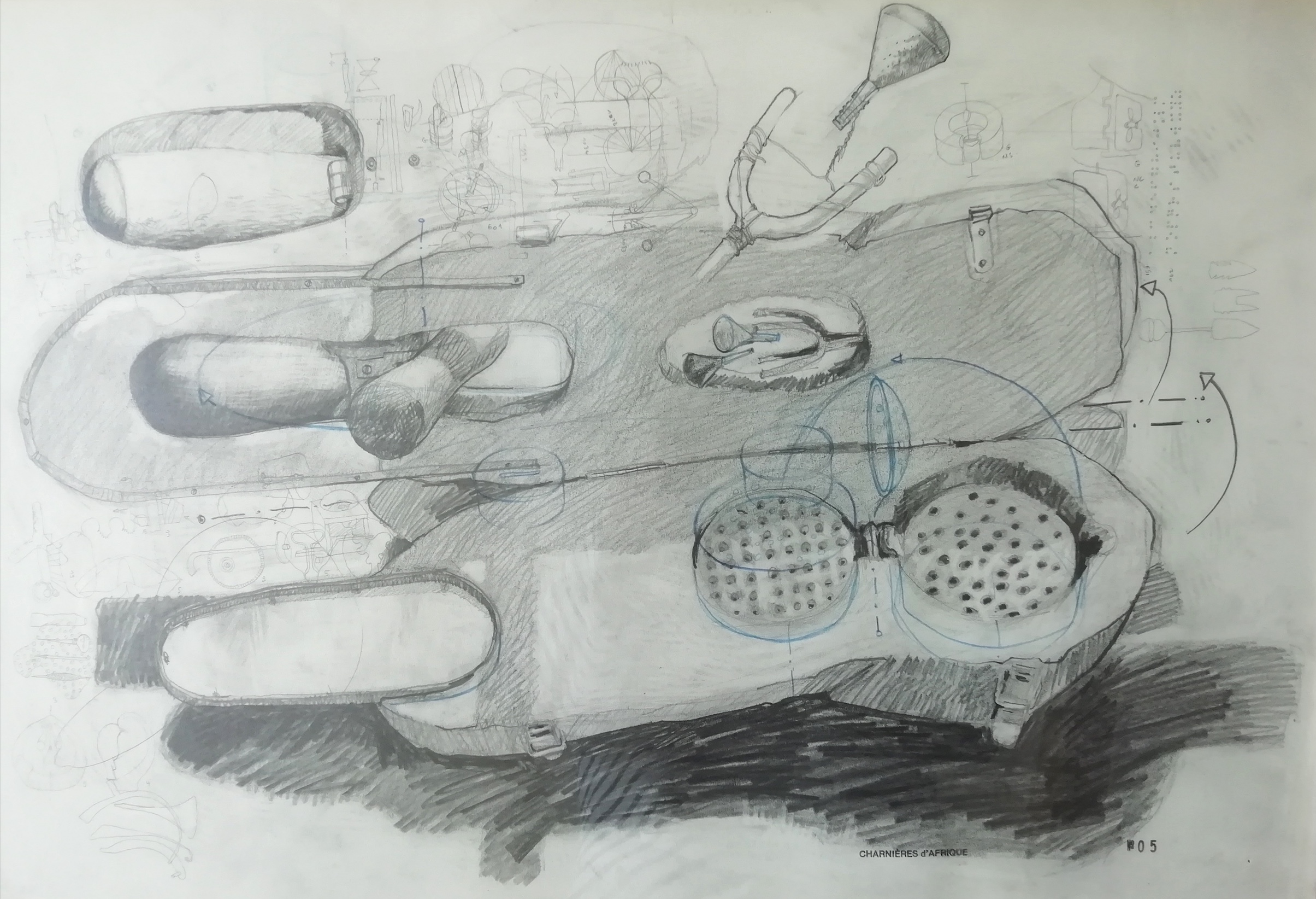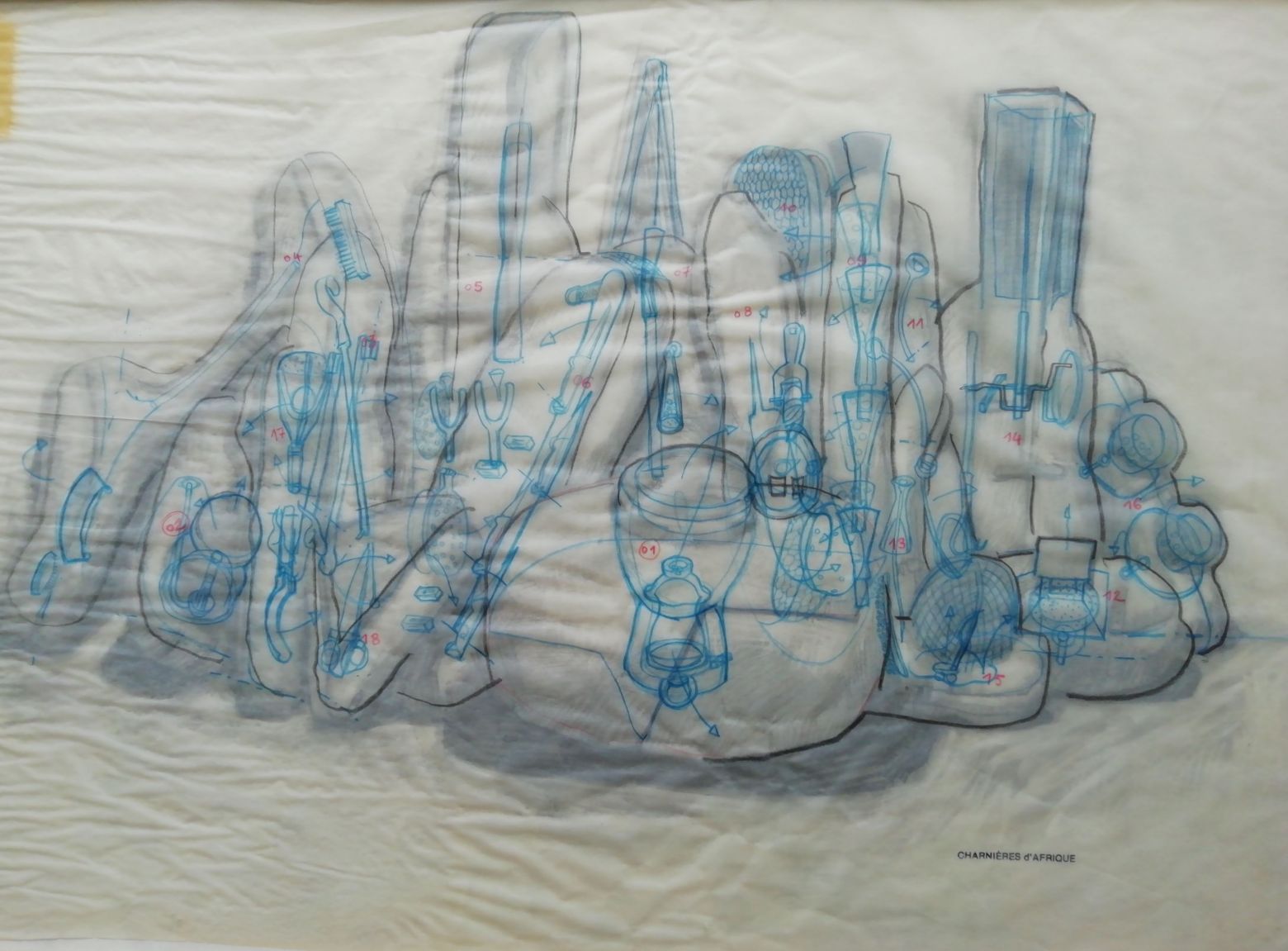 L’expérience des Charnières s’est poursuivie lors d’un séjour à Ouagadougou au Burkina Fasso en Afrique. À partir d’objets que j’ai récoltés et réalisés avec de multiples artisans Burkinabés (ferblantiers, bronziers, forgerons, sculpteurs sur bois …) l’ensemble fut terminé au retour, plombé, puis dessiné, 18 sculptures, 60 dessins.