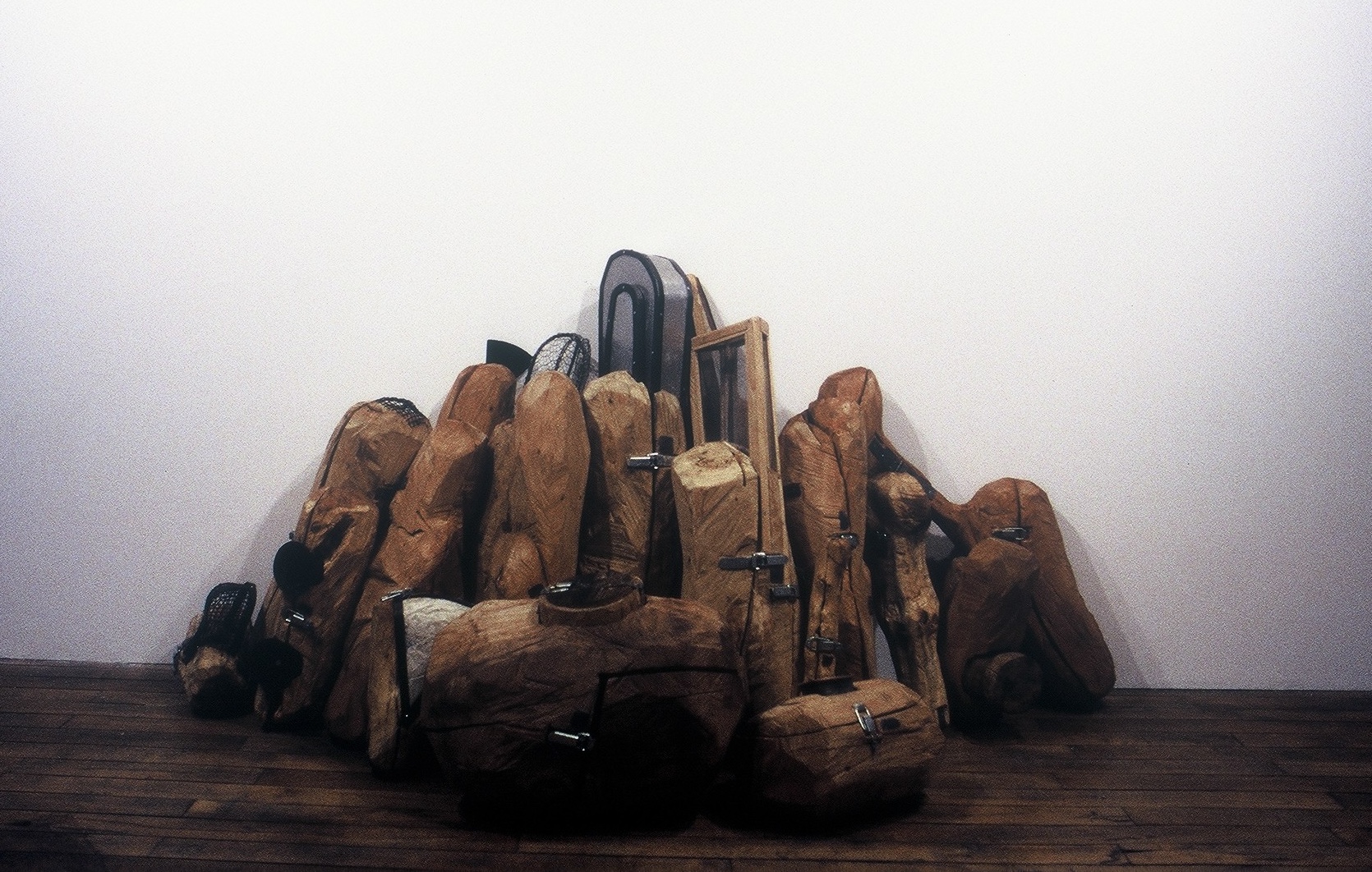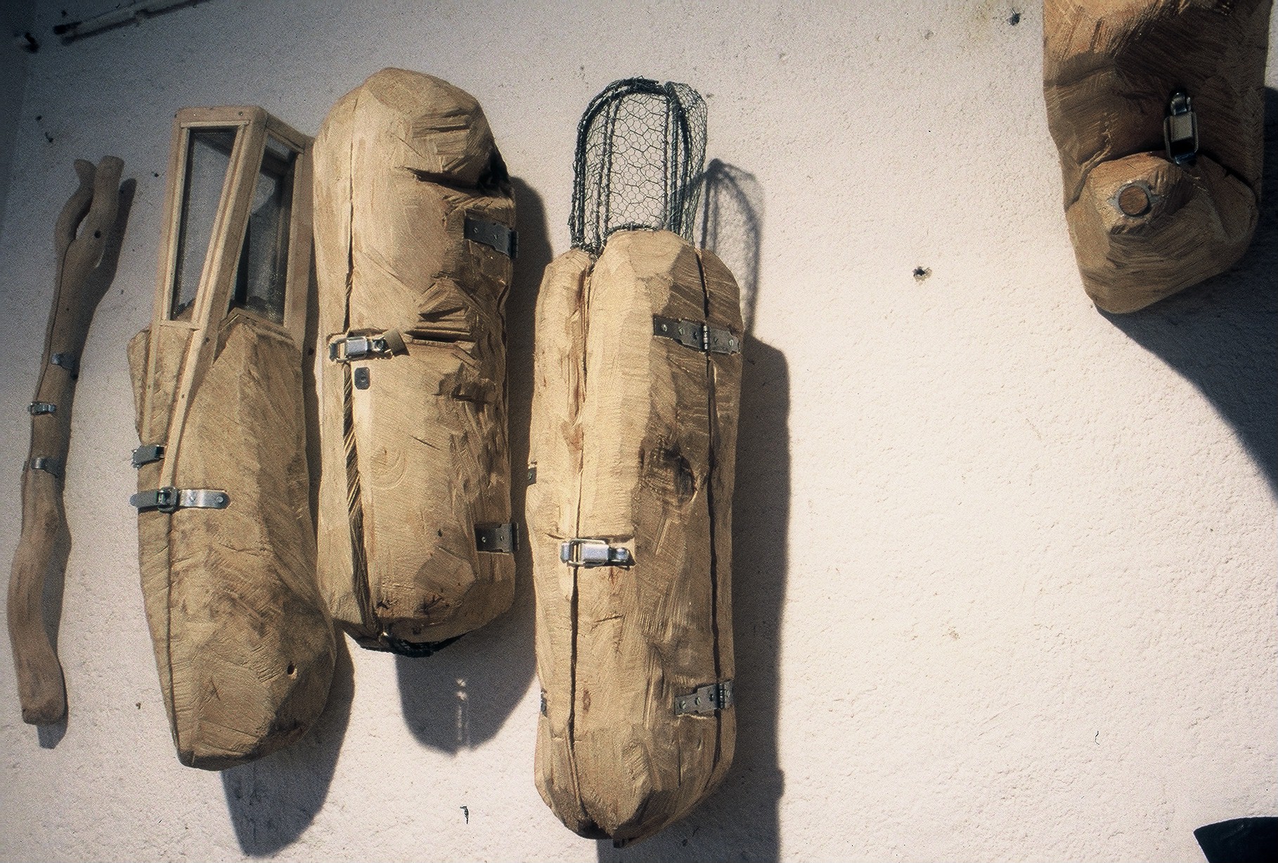 Des "Charnières", le spectateur ne voit donc pas que des formes brutes, étranges, en bois mal dégrossi. Elles ne sont pas sans rappeler les moules qui, dans les ateliers de fondeurs, enferment déjà en leur sein une sculpture encore à naître, un peu comme la graine contient déjà un arbre. Elles évoquent aussi des caisses qui sont comme autant de consignes par les ouvertures desquelles il nous est seulement permis d'apercevoir des fragments des objets qu'elles contiennent. Il y a là une certaine perversion, inhérente à tout souvenir de voyage : celle de donner à voir l'effet plutôt que la chose.