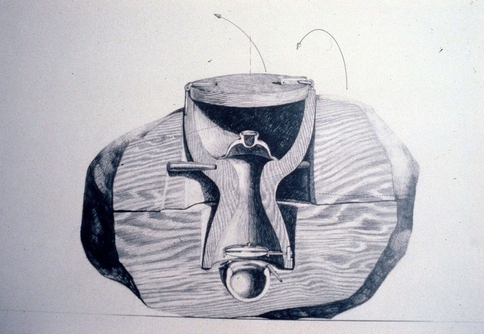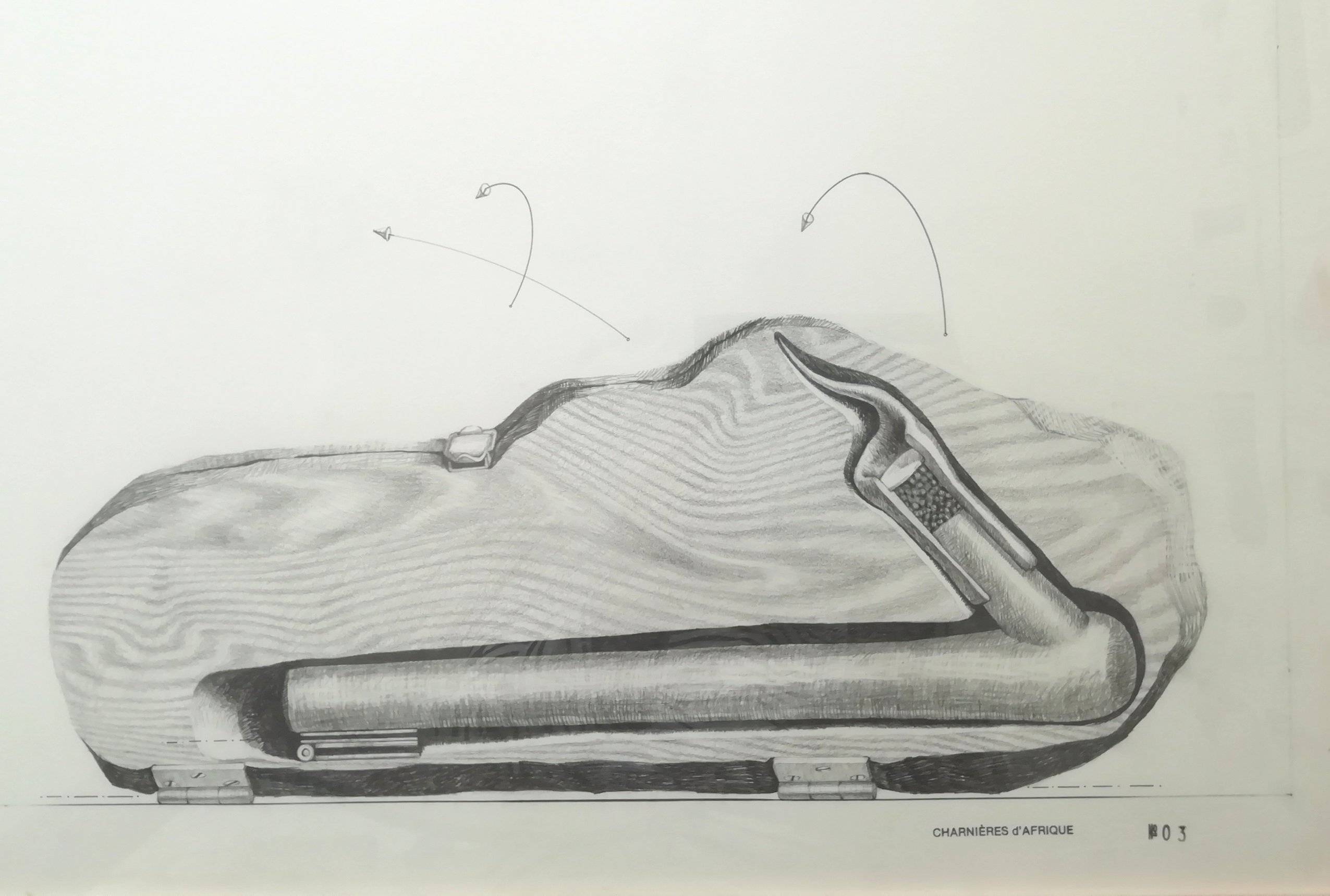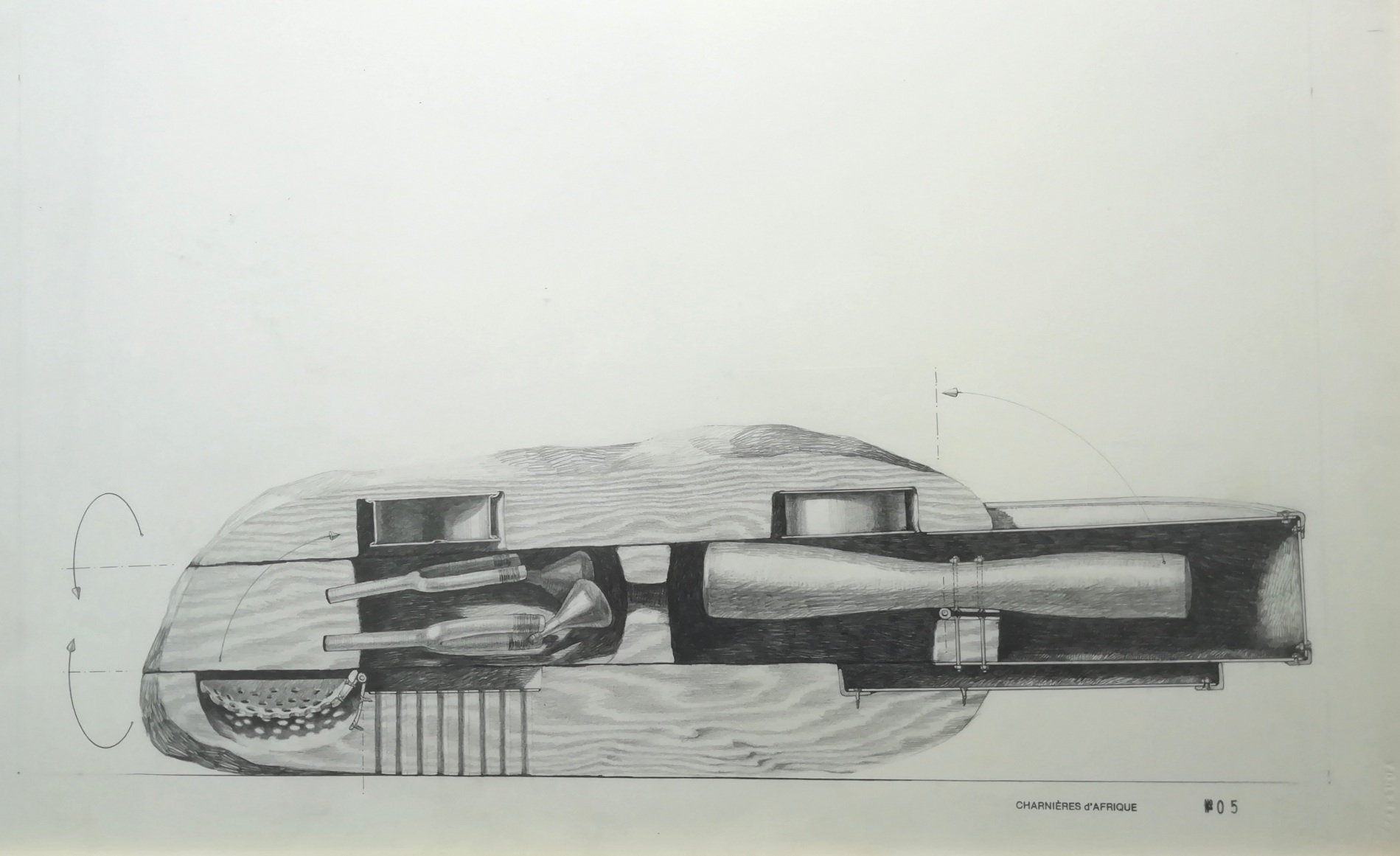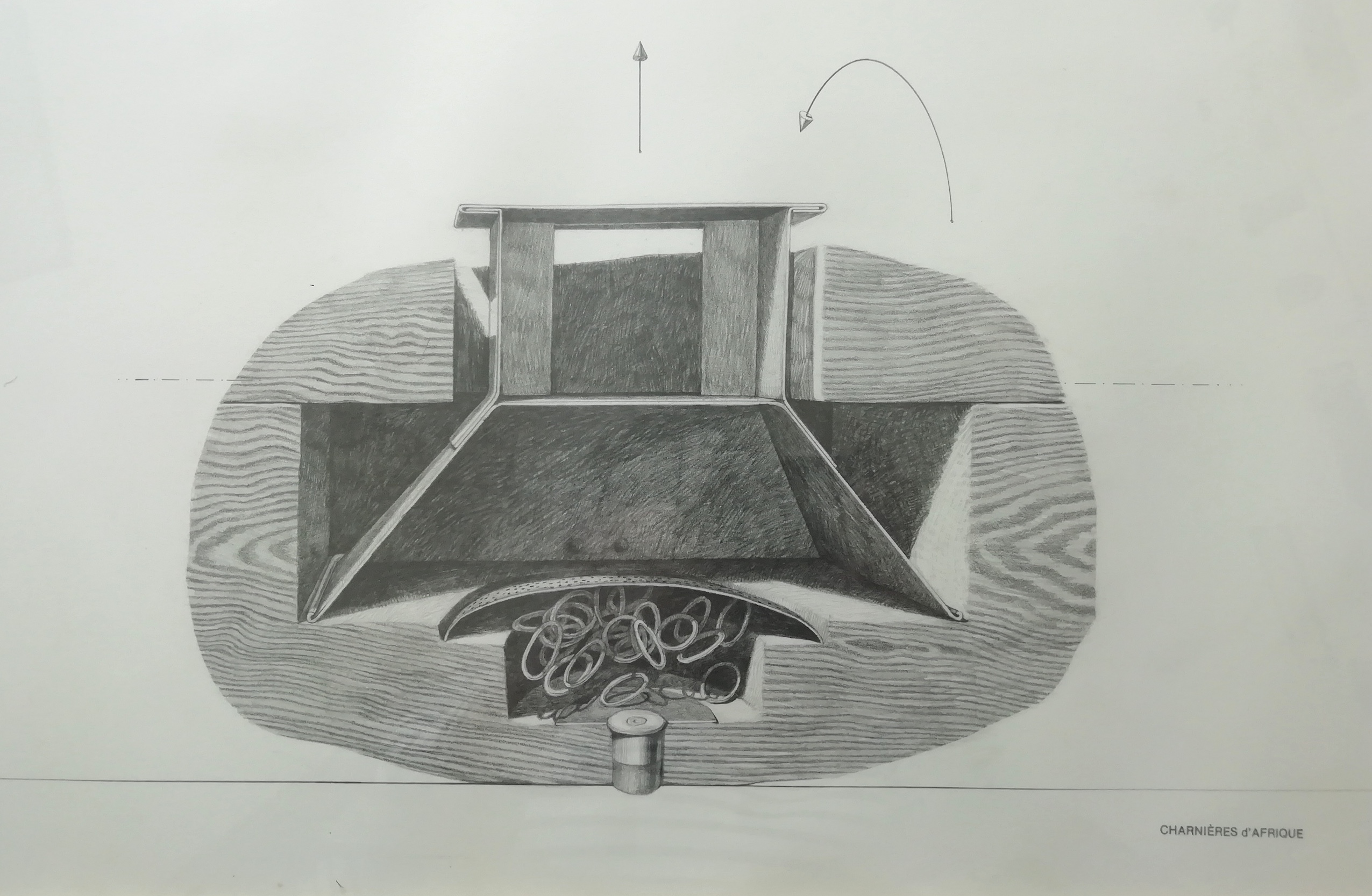 À son retour en France, cette première série a donné naissance à une seconde. On y voit alors s'opérer l'alchimie de l'atelier : comment, une fois les impressions débarrassées des scories du voyage, de ces mille choses remarquées mais qui deviennent anodines, des oeuvres commencent à émerger. C'est une série de boîtes, aux formes hésitantes, dans laquelle les objets acquis sur les marchés et encore imprégnés de l'aura de leur usage (il y a en autre, un couteau qui servait à dépecer les animaux et une griffe dont l'emploi probablement banal se pare du mystère que lui confère son origine), vont trouver place. Dans les marges du dessin, comme sur les études d'architecte, des notations plus précises. Ce sont souvent des détails d'assemblages ou des mécanismes qui donnent un mouvement à chaque objet lors de l'ouverture de la boîte. Une fois l'idée fixée, les configurations établies, naît une troisième et dernière série de dessins. cette fois tout est dit, tout est là : la forme de la boîte, les cavités du bois, la position de l'objet qui y sera enfermé, le mécanisme, la place de la charnière, l'ordre d'ouverture des pièces. Chaque objet, même banal, y est métamorphosé. Il se charge, de par sa position et son mouvement putatif, d'une agressivitéinattendue. Il évoque souvent un instrument de torture, ce qui montre que les objets sont toujours prêts à se révolter.