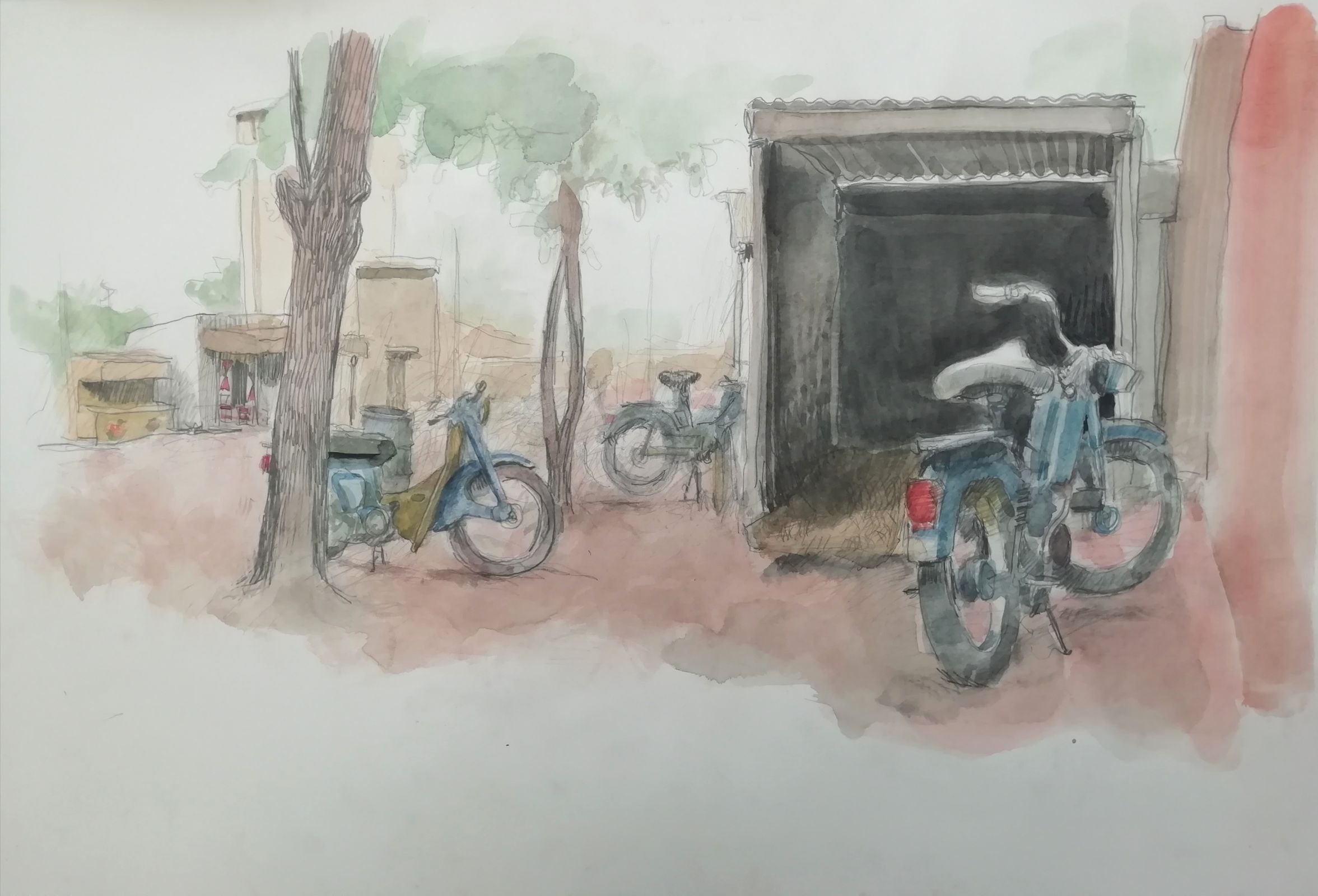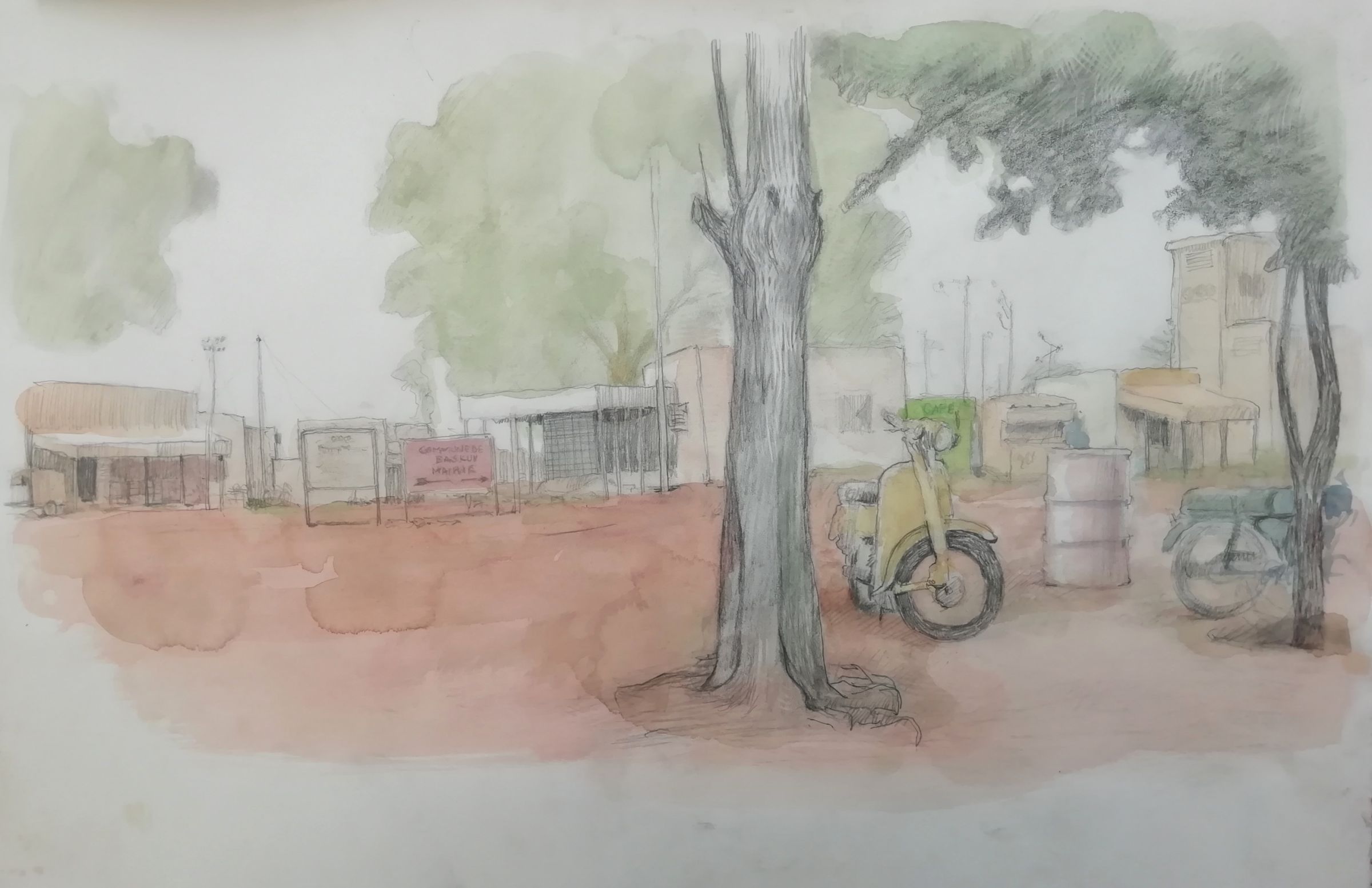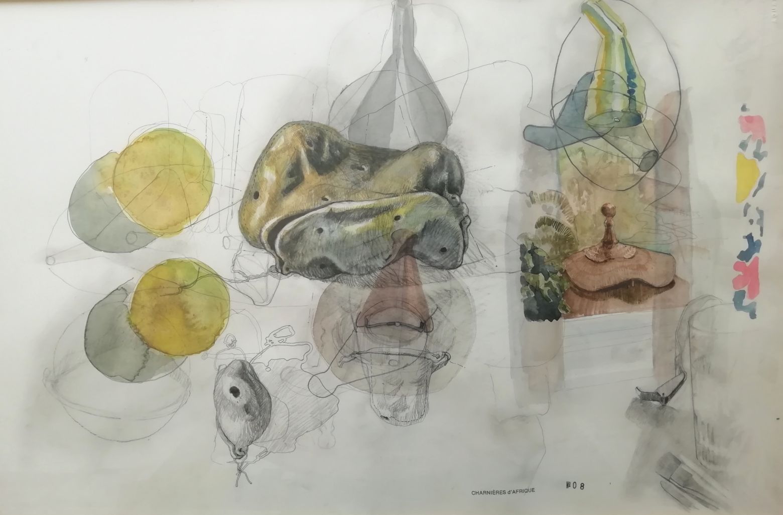 Ces dernières années, Biet a beaucoup erré en Afrique. Il y a déambulé sur les lieux où se concentre, dès l'aube et pour quelques heures, la vie sociale - marchés et abattoirs - et aussi en des lieux plus secrets comme les ateliers de fondeurs ou de forgerons. Suivant son habitude, il a beaucoup noté. Il a aussi acquis des des produits naturels - échnatillons de peaux, de graines, de plumes - et de ces objets manufacturés dont nous avons perdu l'usage et que les Africains, attentifs par nécessité à ne rien laisser perdre, fabriquent encore des objets de récupération. De ces mille choses vues ou collectées est née, sur place, une première série de dix-huit dessins rehaussés d'aquarelle. Ils forment un carnet de voyage où des notations désorganisées se chevauchent, se recouvrent, un peu à l'image de la pensée que l'on laisse vagabonder dans l'attente d'une idée, d'une impression, qui viendra tout organiser.