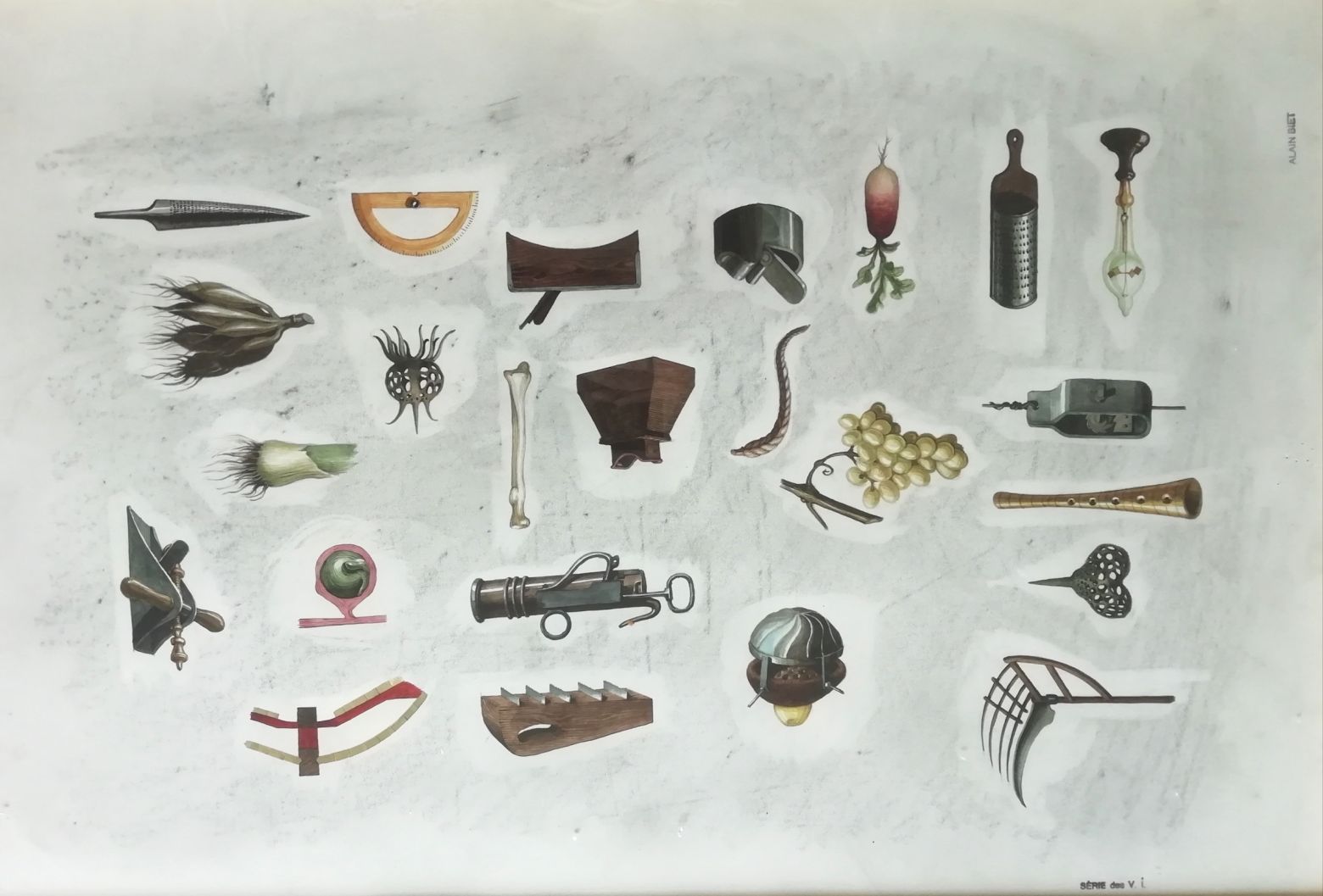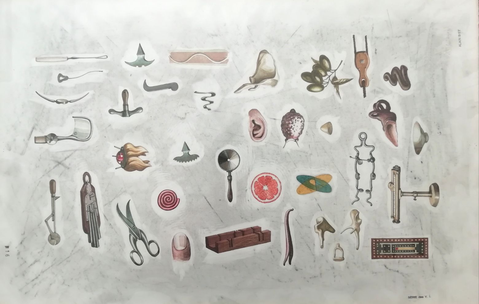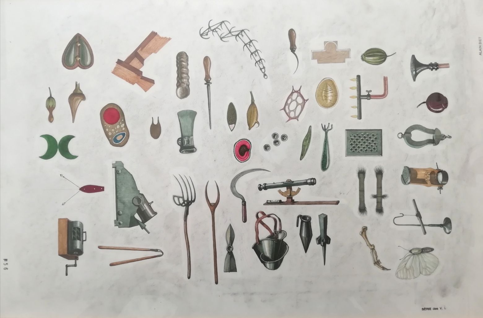Je multiplie jusqu’à l’envahissement des instruments d’optiques composites que je mélange et mets en parallèle avec l’imagerie d’une encyclopédie ancienne de 1900 en 7 volumes que je redessine, «revisite» avec mise en couleurs.