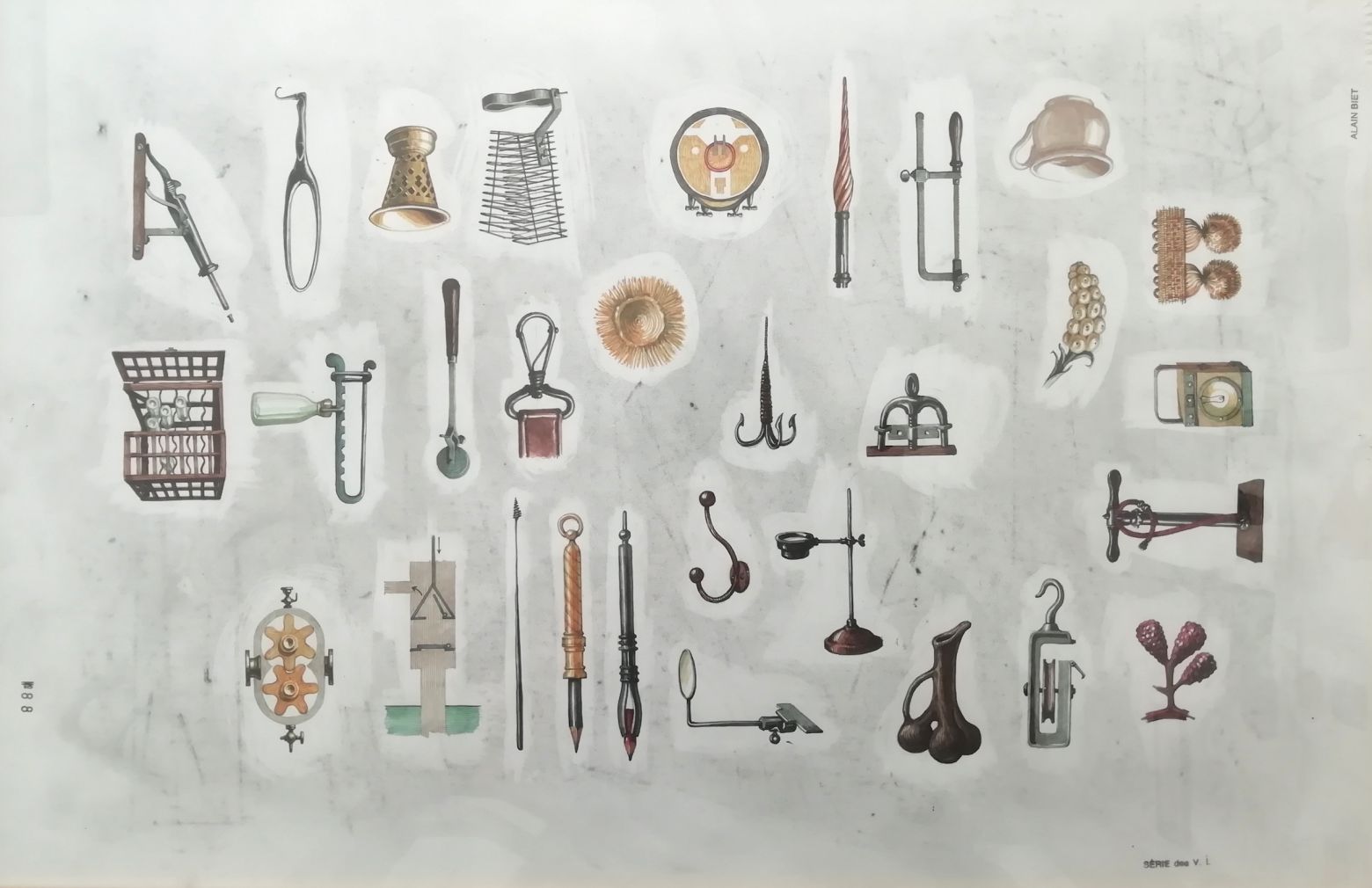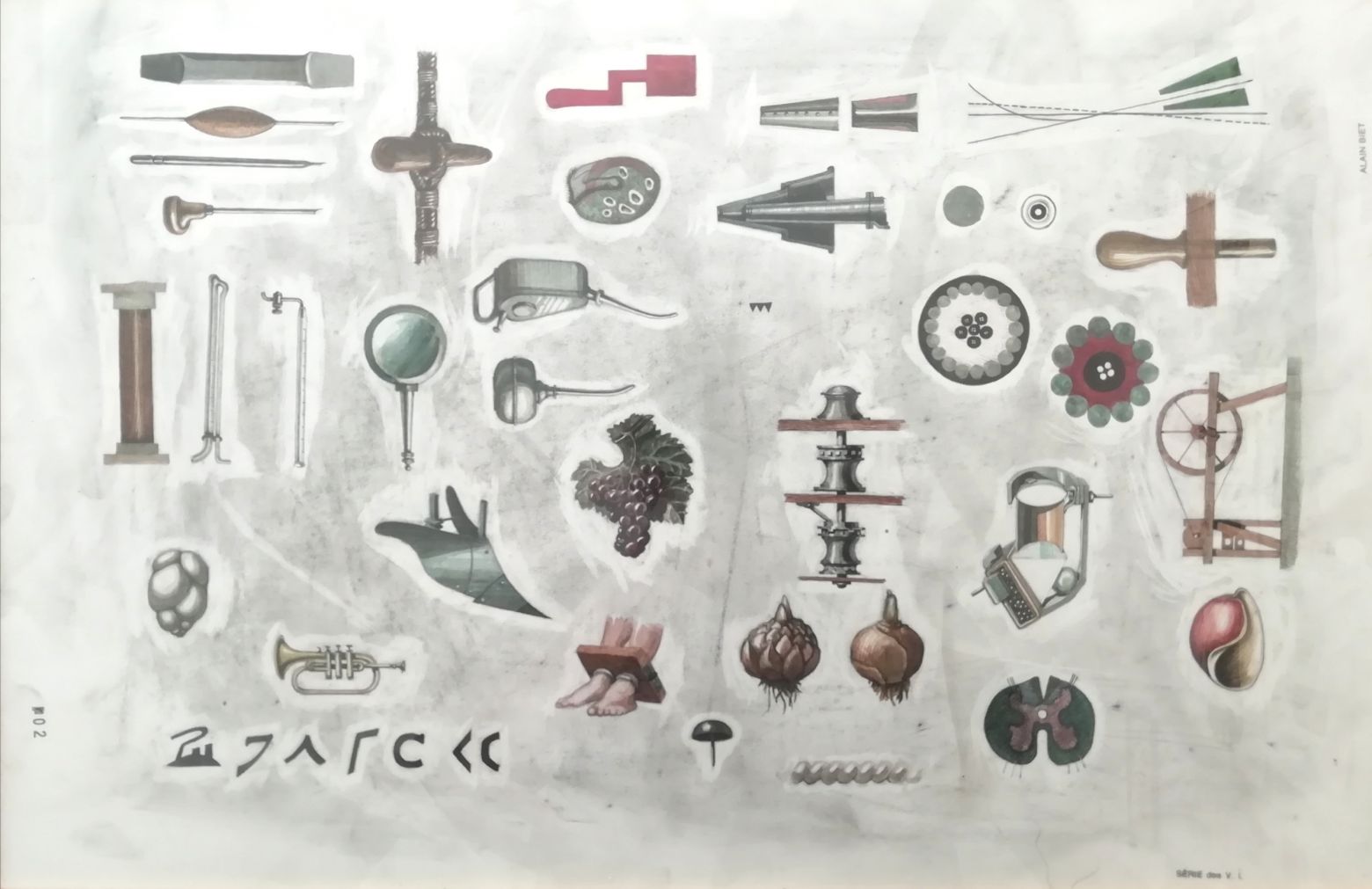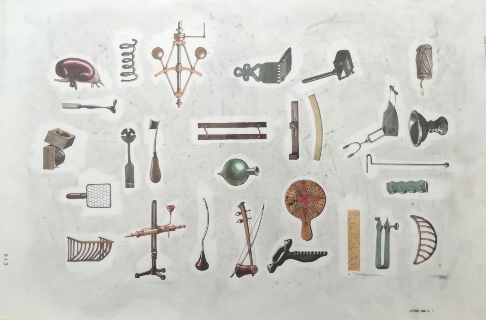 Je multiplie jusqu’à l’envahissement des instruments d’optiques composites que je mélange et mets en parallèle avec l’imagerie d’une encyclopédie ancienne de 1900 en 7 volumes que je redessine, «revisite» avec mise en couleurs.