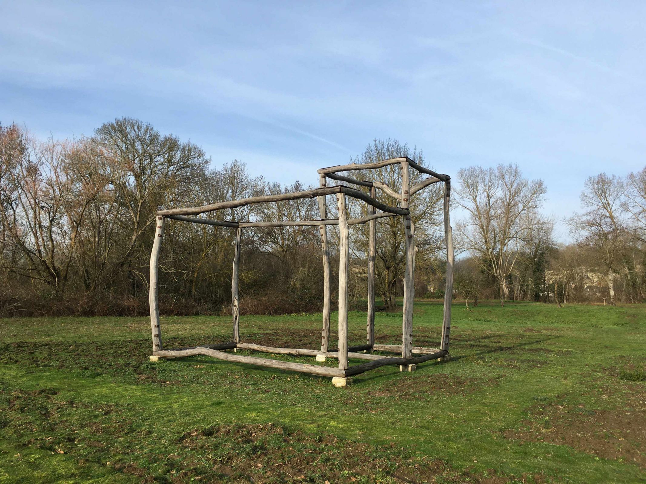 Insula est une sculpture qui fait référence à l’étymologie du mot île (insulaire). En effet, insula désigne à la fois « au milieu de l’eau » mais aussi un habitat collectif (lieu d’habitation entouré de rues). Un autre sens est celui d’une région du cerveau. Insula est une construction faite en bois brut « mort debout » trouvé sur le lieu qui reprend le dessin à une échelle réduite, de deux parallélépipèdes représentant des habitats collectifs. Le jeu entre forme géométrique pure et forme dessinée par les bois aux lignes organiques font écho au lieu-même de l’implantation, le milieu naturel qu’est l’île de la Métairie, et à son histoire mais aussi aux habitations collectives proches.
