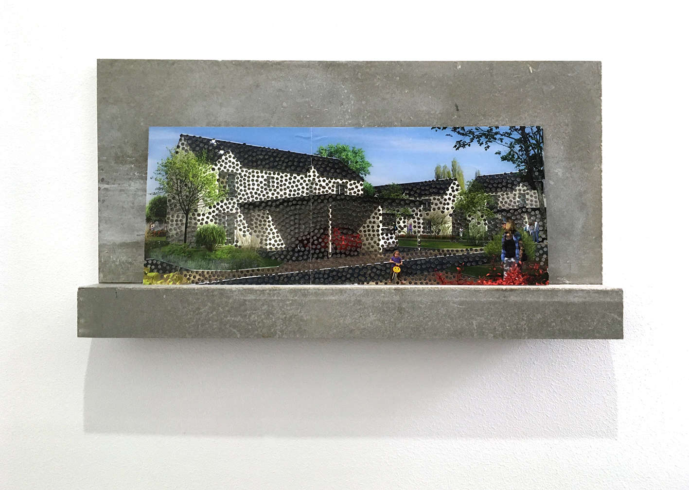 Support en Viroc, publicités de promoteur trouées par emporte pièce et collées sur plexiglas