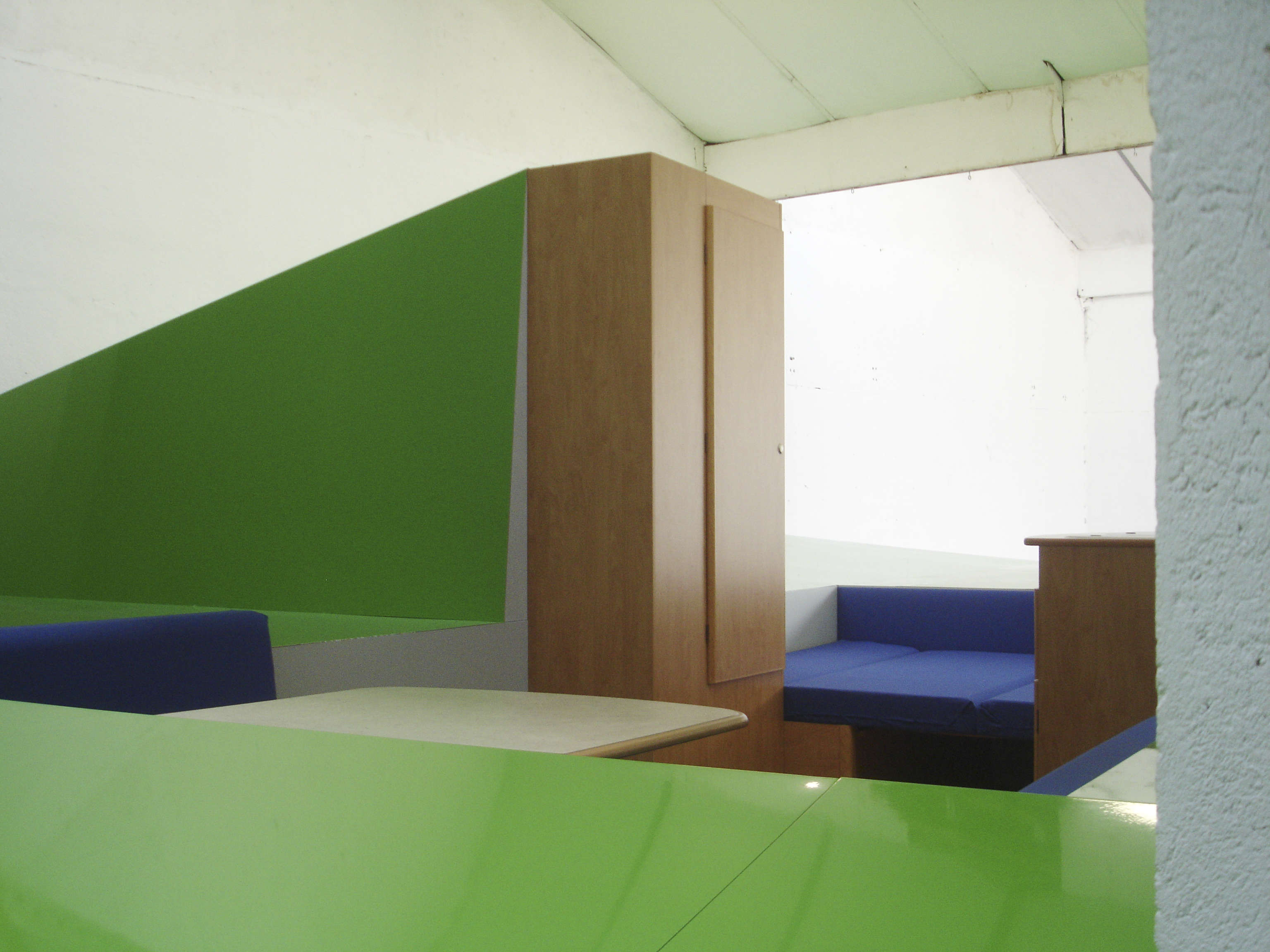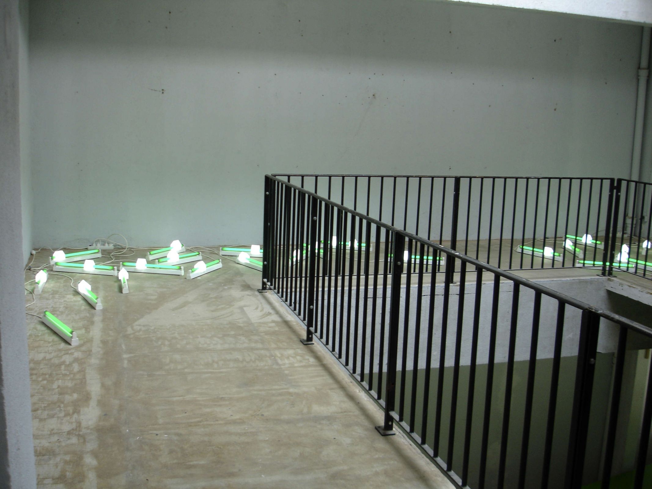 Réglettes pour fluorescent standard de 60 cm recouvert de gélatine verte, volumes maisons et parallélépipèdes en plexiglas diffusant "fluo202"