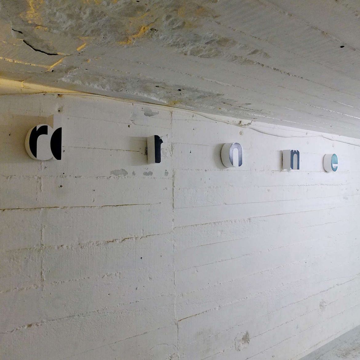 Lettres découpées, peinte en blanc (mot drone) et en graphite (mot ronde)