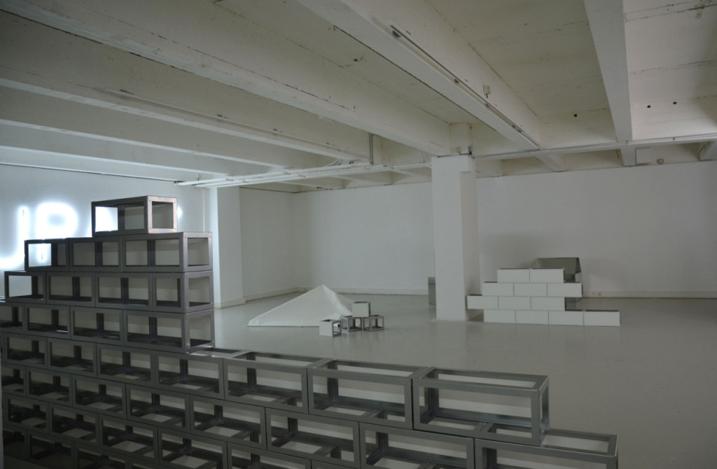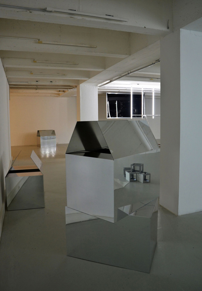 Construction (2010) fait indéniablement penser aux Mirror Cubes de Robert Morris. Cinq « boîtes » réalisées en Dibon miroir découpé et plié, sont disposées dans l’espace, deux sont superposées. Il faut avoir vu ces sculptures sur le parquet de l’Espace d’Art Contemporain de La Rochelle, lors de l’exposition Entretemps en 2011, pour constater leur étrange ressemblance avec celle de l’artiste américain, notamment dans leur première présentation à la Green Gallery de New York en 1965 ! Mais ressemblance ne signifie pas identité. Les cubes miroir de Morris semblaient à la fois achever le projet minimaliste et en ouvrir la tautologie en parasitant leur clôture par les reflets changeants de leur surface réfléchissante. Mais dans les pièces de Bernard Calet, pas de résistance à toute perception séparée, ni de rêve visuel de la même chose, caractéristiques des objets minimalistes. Avec les miroirs, comme le déclarait Morris, « on peut agrandir l’espace et éprouver le réel et l’illusion en même temps. » Les volumes de Construction montrent d’emblée leur potentialité de contenant et laisse entrevoir leur vide. Elles ont les proportions d’une boîte de carton utilisée pour les déménagements. Pour ces œuvres, Bernard Calet se souvient qu’il a été chauffeur déménageur et cette expérience marquante a déjà induit plusieurs pièces antérieures annonçant Construction. En 2003, Mise en demeure est une série d’impressions numériques sur bâche de photographies d’intérieurs de camion de déménagement. Citons encore 3m3 (2008) ou Translation (2009), décrit comme « volume d’un véritable déménagement sur plateau de bois ». Tout ce que l’on possède de vraiment important tiendrait peut-être dans une boîte, et Bernard Calet évoque l’étrange sentiment éprouvé au constat que toute notre vie matérielle tient dans quelques cartons…
