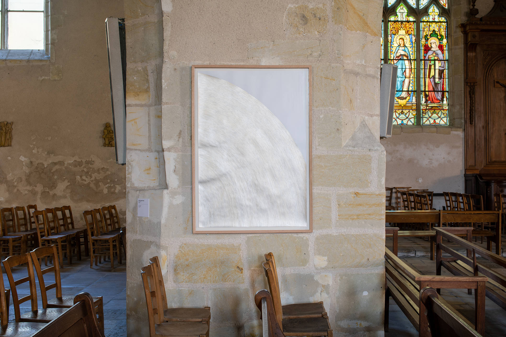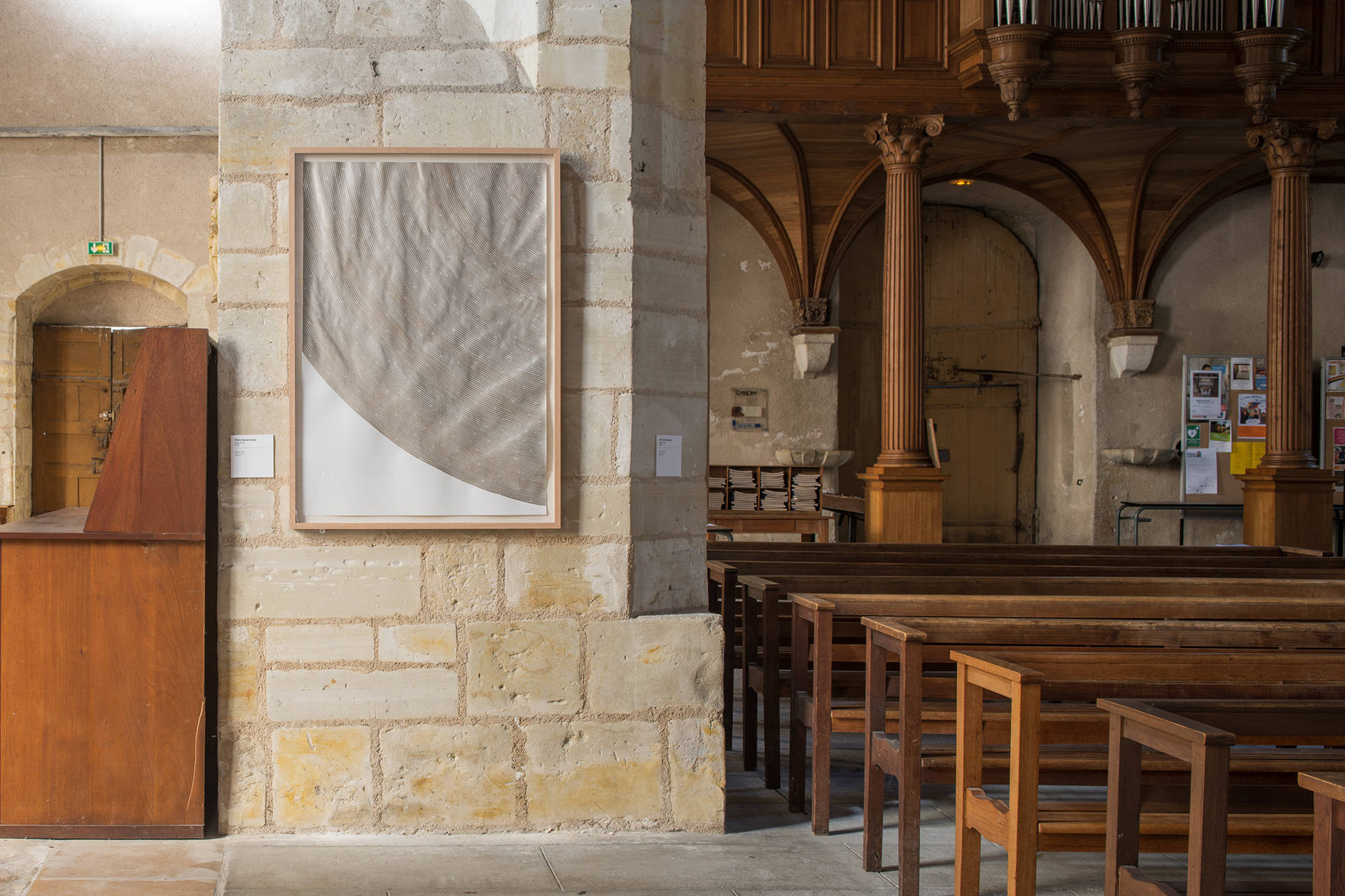 Le traitement du dessin en lui-même renvoie à l’idée de l’eau. Le jeu des lumières et des textures grâce au travail de lignes et de pigments argentés intensifie la notion de mouvement intrinsèque à l’élément de l’eau. Les reflets varient en passant des teintes argentées aux dorées voire cuivrées suivant le point de vue, rappelant ainsi l’iconographie traditionnelle des lieux de culte ce qui instaure un rapport particulier entre les oeuvres et le lieu d’exposition, église Notre-Dame de Vierzon.