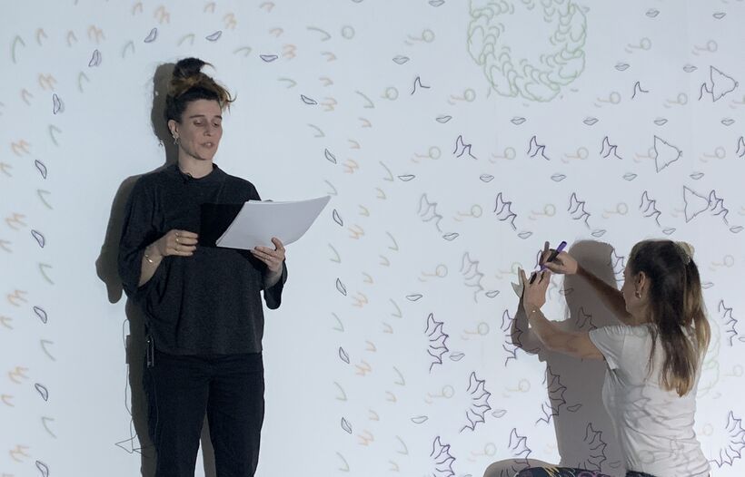 Cette rêverie fantasmagorique prend la forme d’une grande partition graphique et sonore, d’un texte poétique (performé) et de sculptures en céramiques. La plasticienne et la poète ont élaboré ensemble une grammaire de signes et de sons aboutissant à un PIDGIN : première étape d’une langue créée par le frottement de deux systèmes symboliques. En suivant la foule des poissons volants, nous traverserons le cycle des jours, en un voyage qui confine au merveilleux.