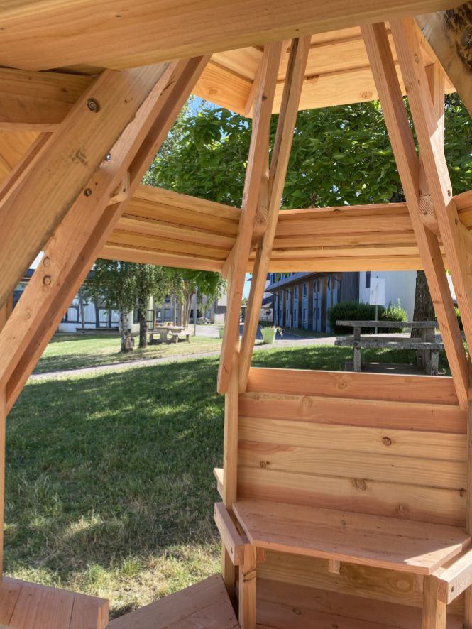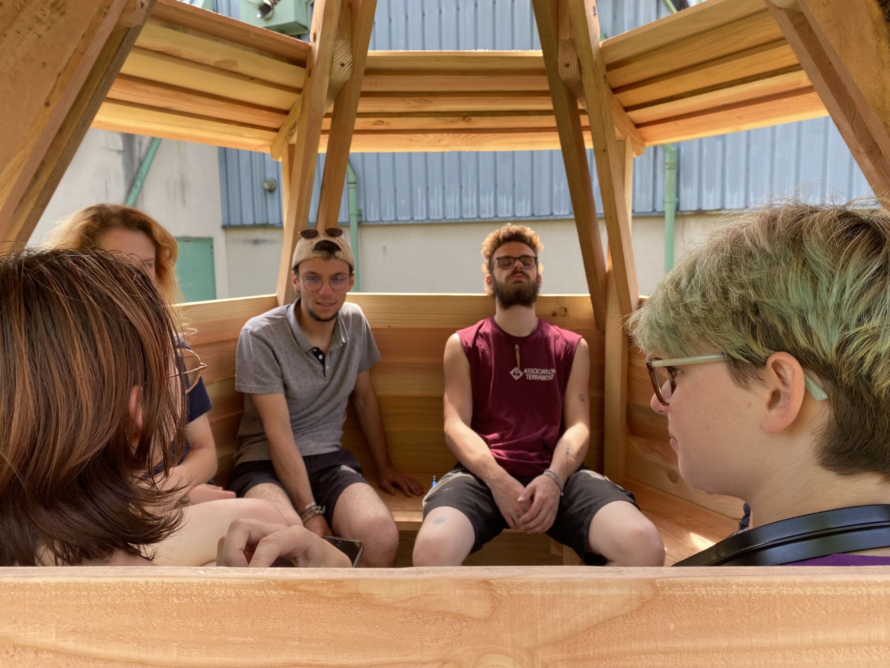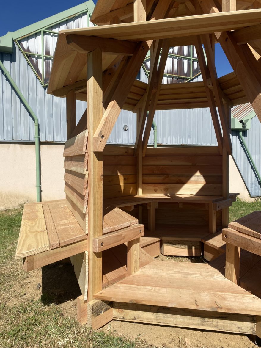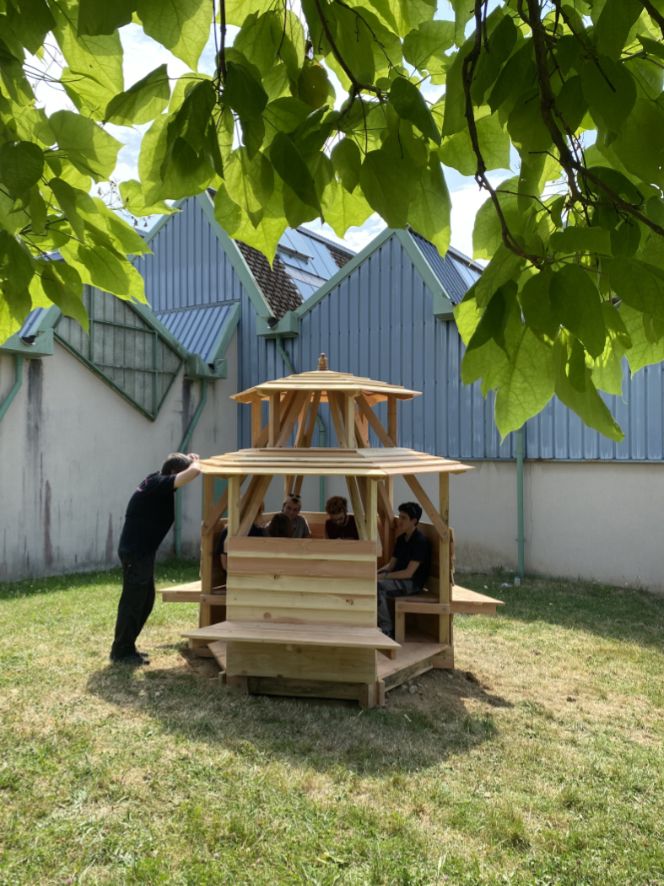 Inspirés par l’esthétique architecturale post-moderne du lycée, les élèves ont réalisé une esquisse-maquette sur le tour à bois. Motivés par le désir d’un refuge, d’un endroit où « être bien ensemble », les élèves ont agrandi leur maquette et imaginé la sculpture comme une micro-architecture à l’échelle de leurs corps afin qu’elle soit installée sur la pelouse du lycée lors d’un chantier collectif. Édifiée avec le matériau local issu des forêts morvandelles, le douglas, elle devient alors un abri, un nouveau point de vue où les systèmes de surveillance sont inversés.