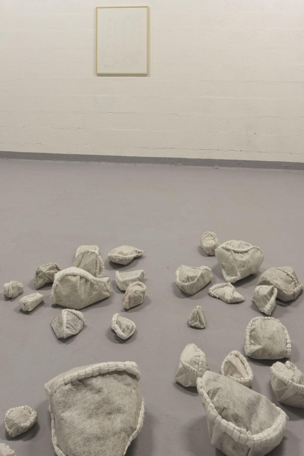 Ammonites sont aussi des débris, cette fois sauvés de la disparition par le tissu géotextile qui les entoure et qui sert habituellement à empêcher que les pierres ne soient absorbées par le sol. La couture qui enferme la pierre ressemble à une cicatrice en écho à celles qui marquent le paysage urbain et chaque emballage fait penser à un petit linceul. Le geste d’Anne Houel semble être autant une tentative de retenir de l’oubli les traces de l’ancienne ville que celui de ritualiser sa disparition, deux faces d’un même travail de mémoire. Ammonites est aussi le nom d’un fossile qui a la forme d’une spirale, peut-être dans une lointaine association formelle avec les œuvres de Robert Smithson. Il tentait dans les années soixante-dix une sculpture à l’échelle du paysage dont la spirale et l’amas étaient des formes récurrentes, il a également énoncé l’idée de « ruines à l’envers ».*
