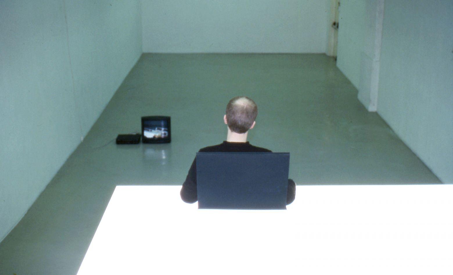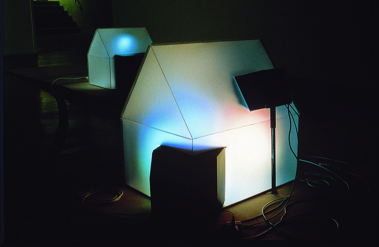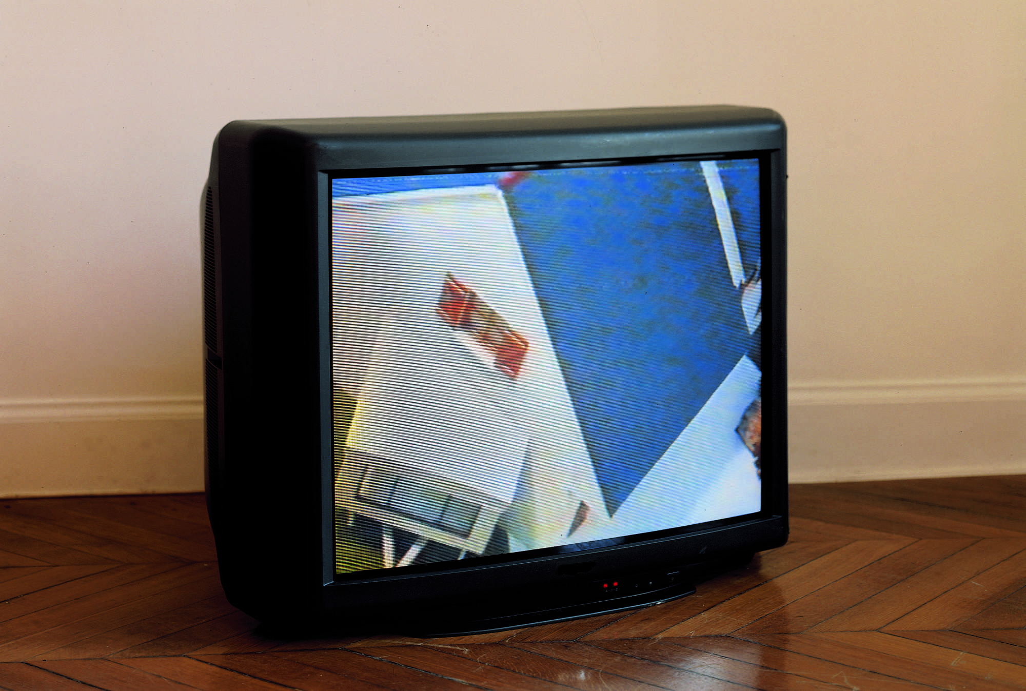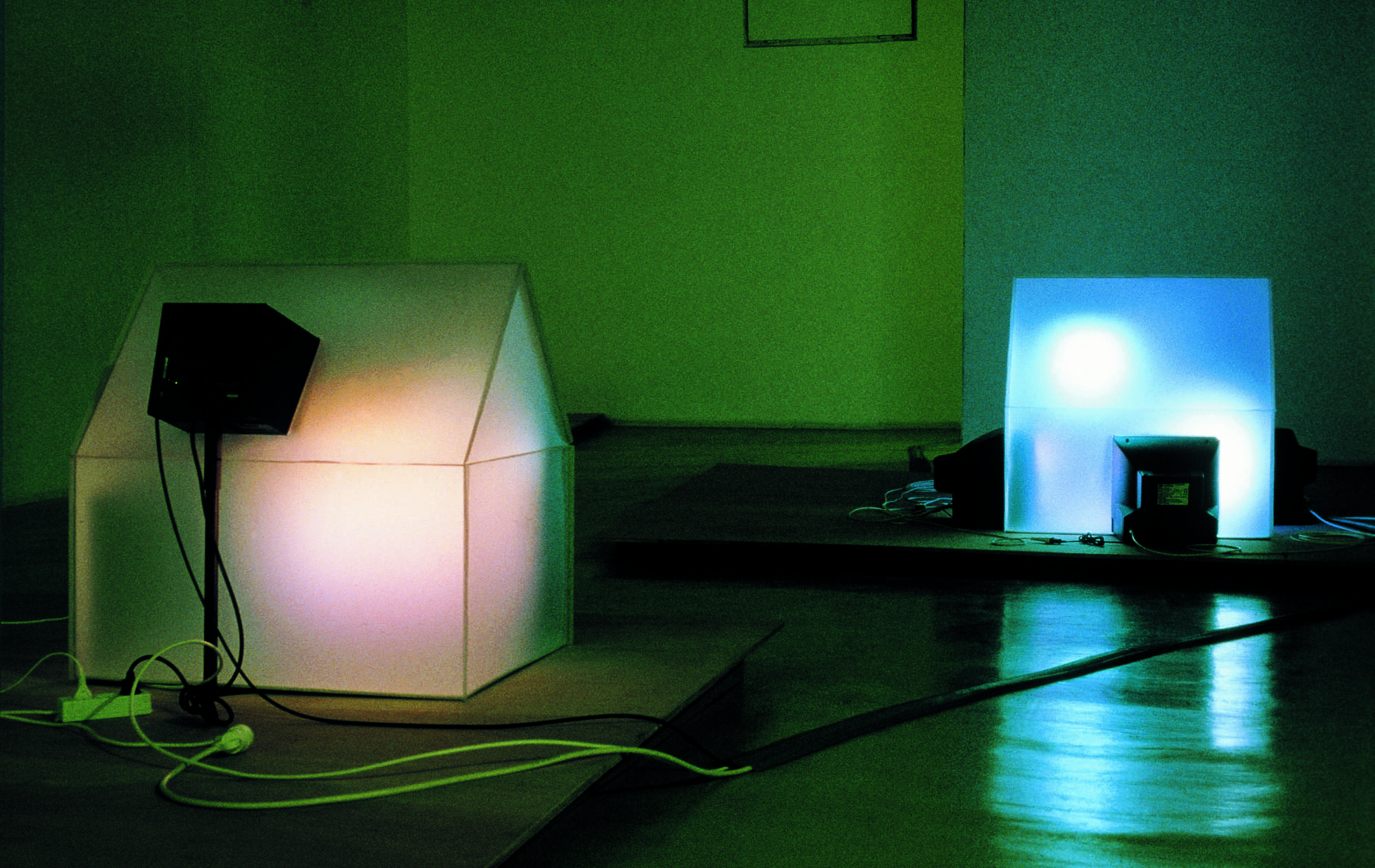 Contreplaqués découpés à la forme de parcelles, polycarbonate, téléviseur, moniteurs noir et blanc, caméra de suiveillance placée dans l'espace d'exposition. Module avec maison à deux téléviseurs: 86 x 249 x 366 cm, à trois télévisuers : 95 x 290 x 306 cm