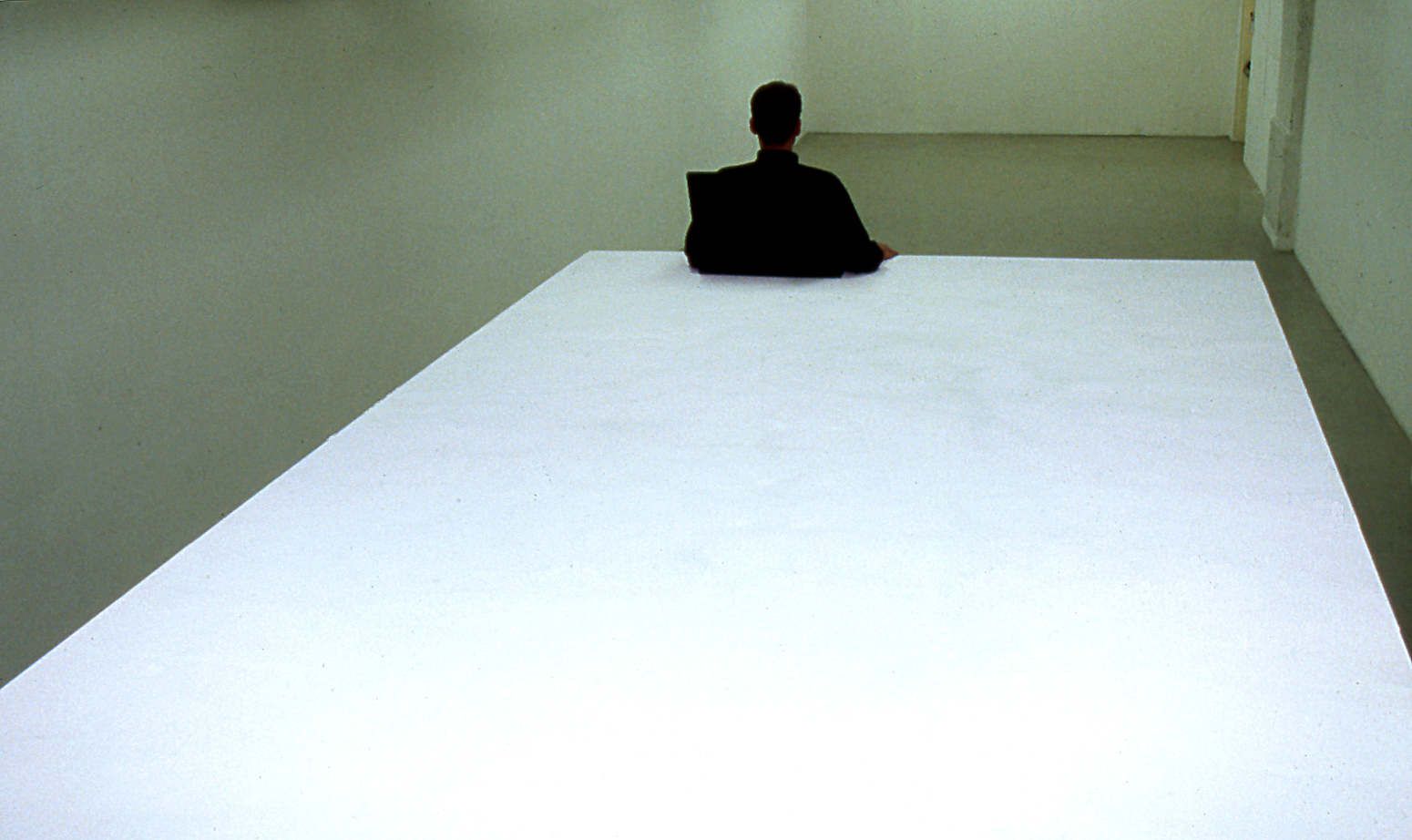 Plateau en bois peint (peinture réfléchissante blanche) surplombant l'espace d'exposition : 540 x 250 cm, fauteuil en bois recouvert de caoutchouc : 62 x 51,5 cm