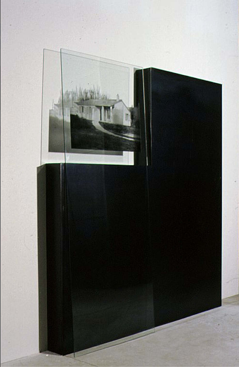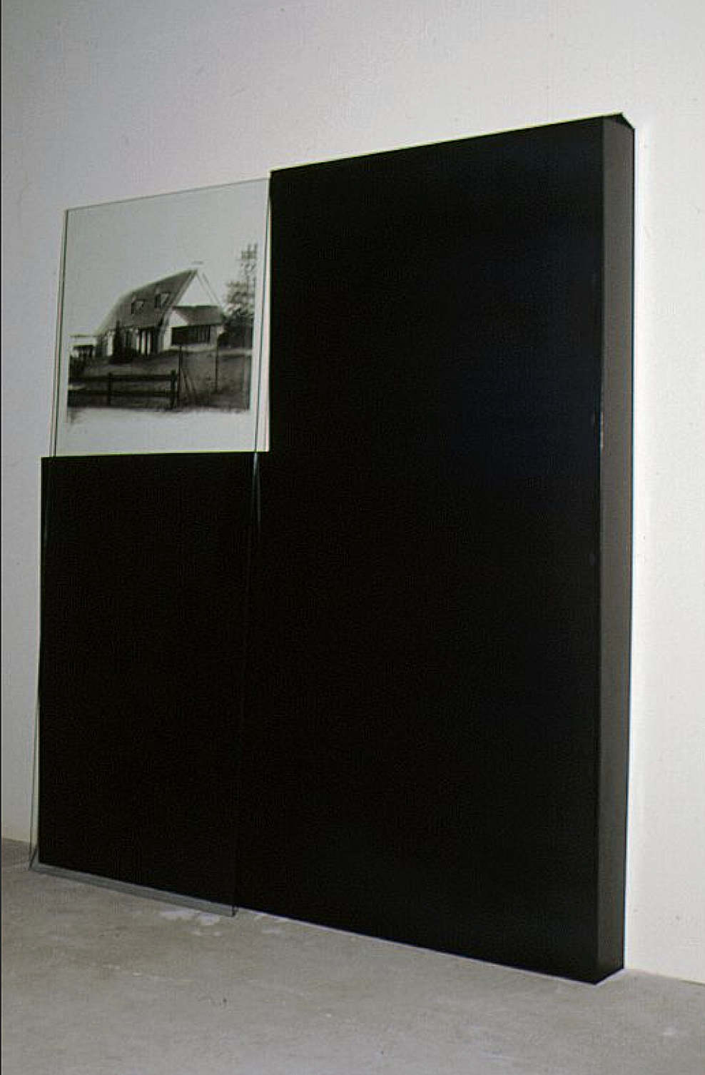 Tôle noire, photo-grisaille sur verre représentant un pavillon témoin