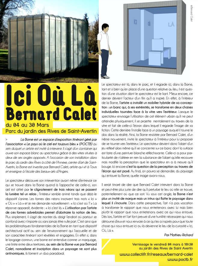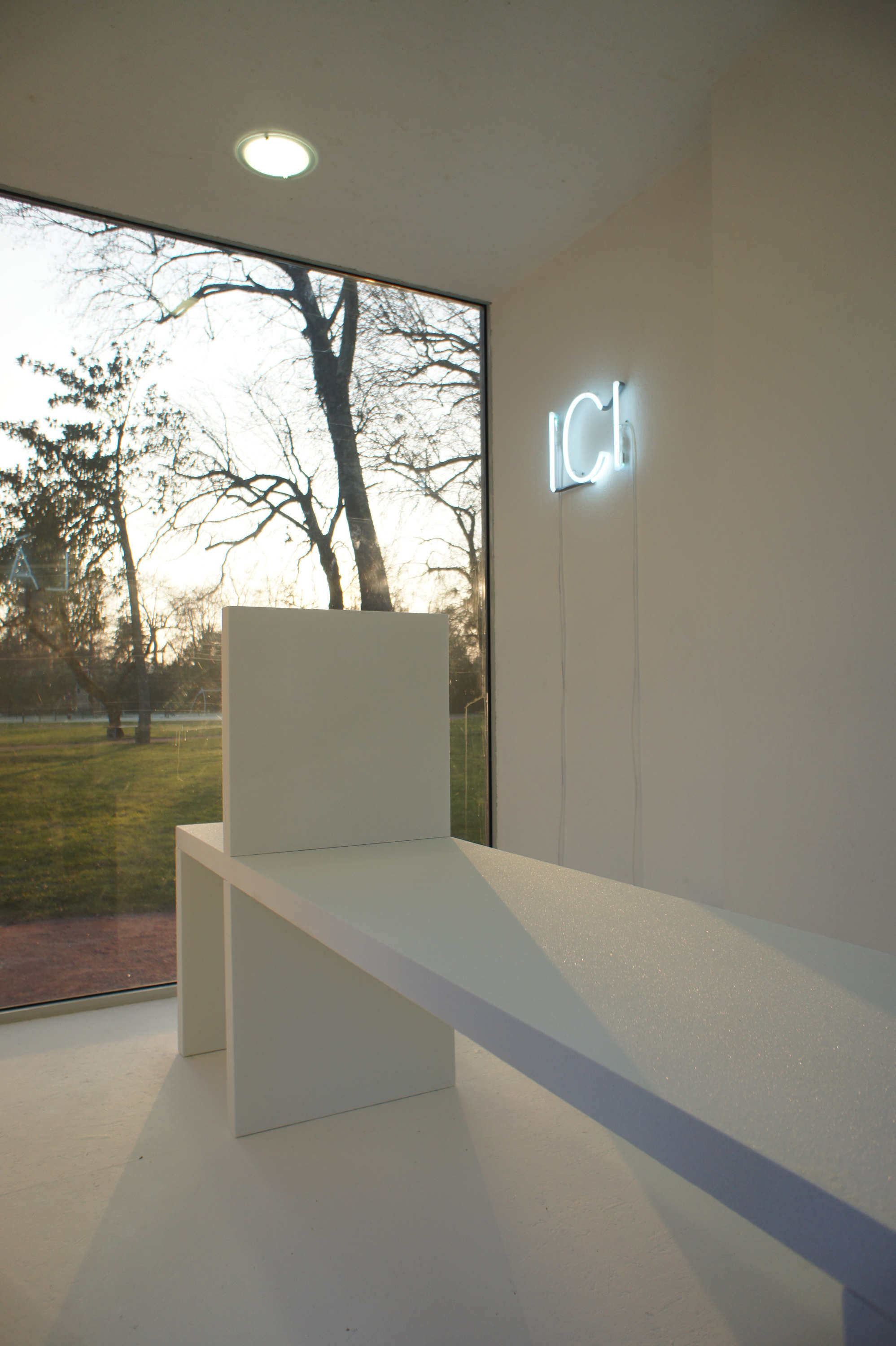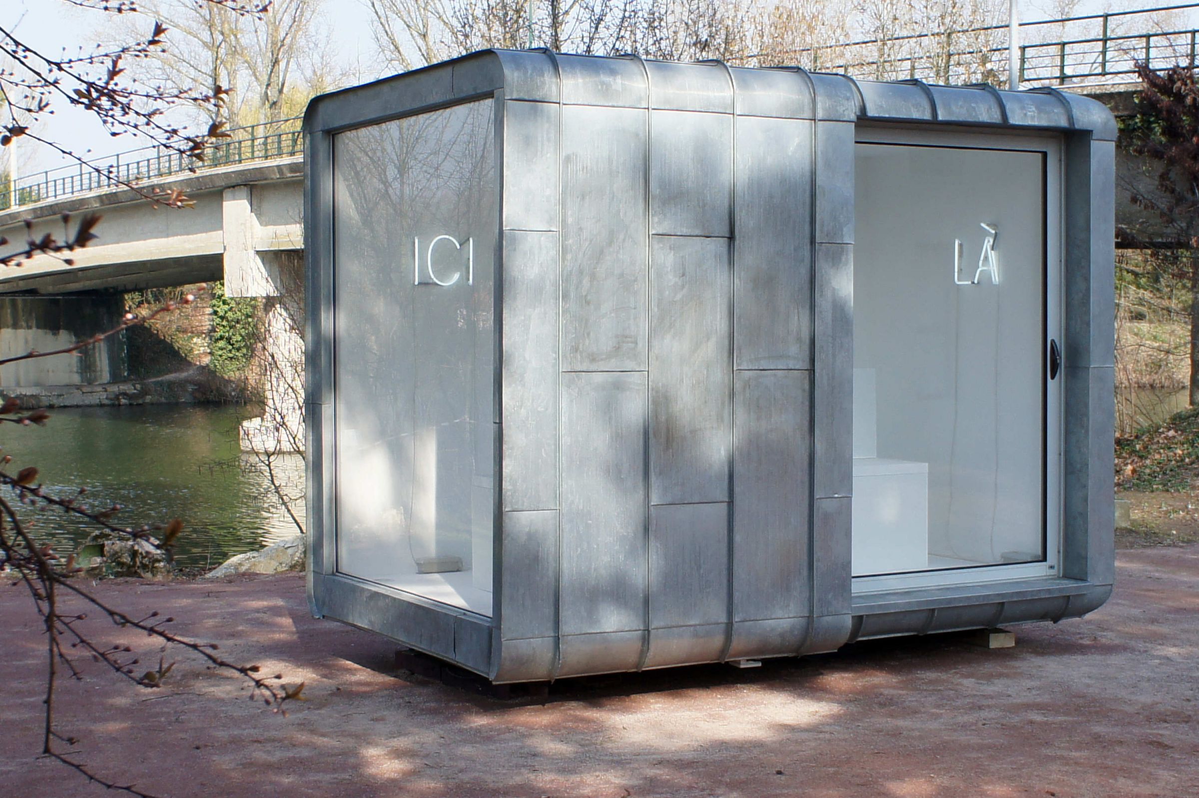 La Borne est une micro architecture fermée, qui est déplacée dans différents espaces urbains, des ICI. Lieu d’exposition temporaire visible uniquement de l’extérieur, le spectateur est tenu à distance par deux vitres, il n’entre pas.