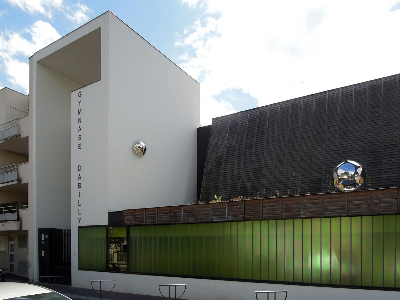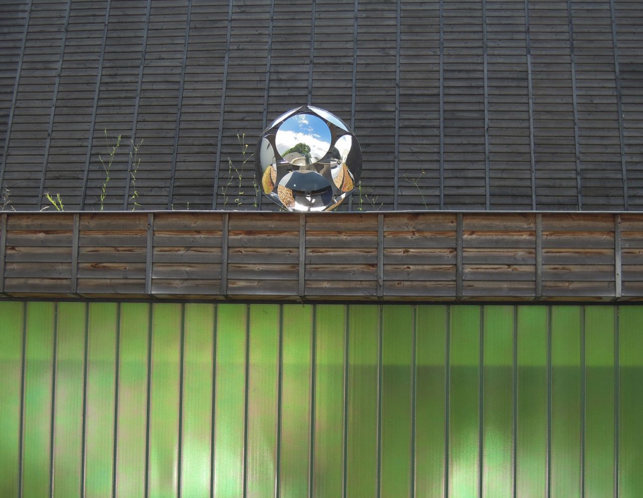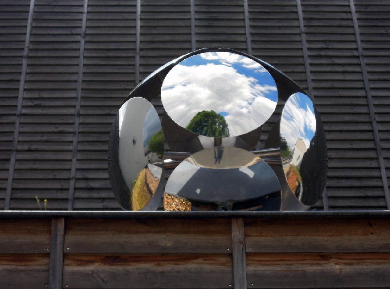 C’est là que prennent place les trois modules composés de miroirs inox convexes. Chaque élément délimite une forme sphérique ou qui renvoie à la sphère, pouvant évoquer la balle ou le ballon, la bulle, l’univers floral ou celui de la fiction (objet métallique étrange). Désignée sous le nom de « satellite » cette réalisation, par la nature de ses matériaux, absorbe la lumière et les éléments alentours, fixes ou en mouvement, pour les restituer au regard des passants. De ce simple fait, les modules s’animent. Ils tracent une trajectoire dans l’espace et viennent tout à la fois perturber, comme des intrus, le paysage et s’y inscrire parfaitement.