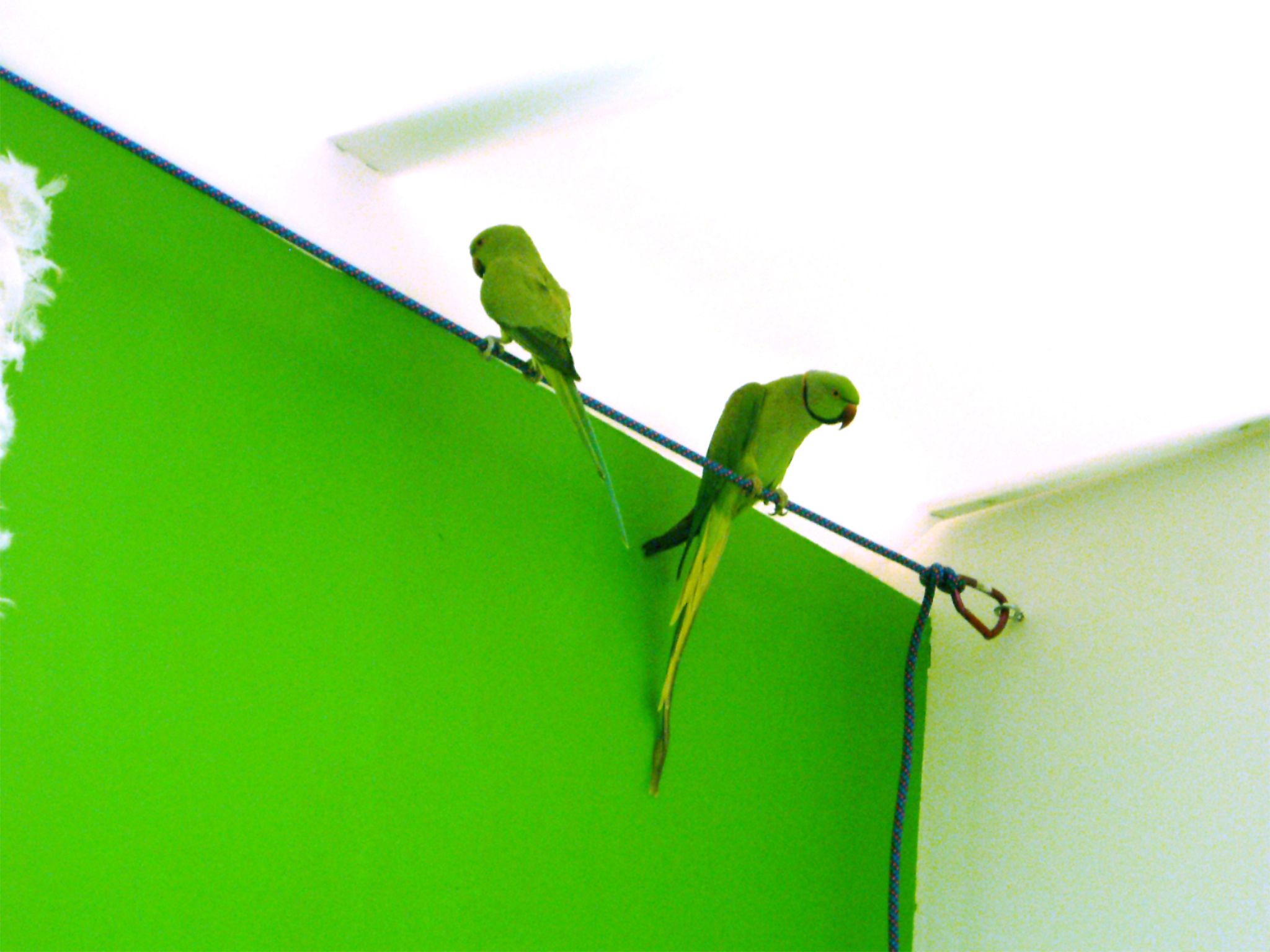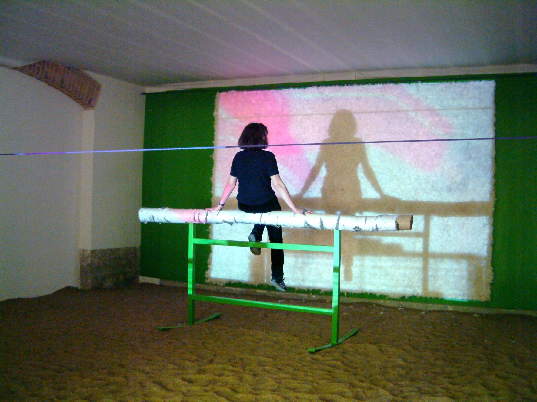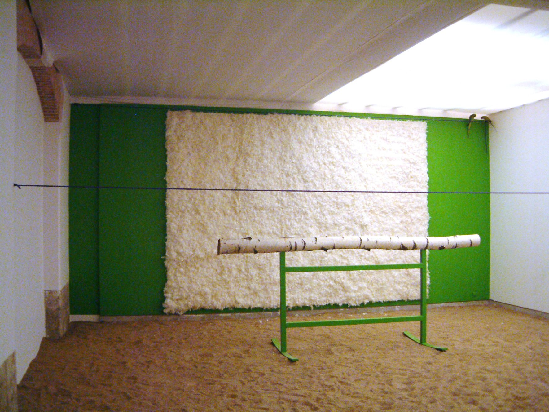2 perruches calopsittes vertes, cage, corde, perchoir en métal et tronc de bouleau, sable, écran de projection en plumes d'oies, dispositif sonore et projection vidéo Chute de corps – saut à l'élastique 7' en boucle, dimensions variables.