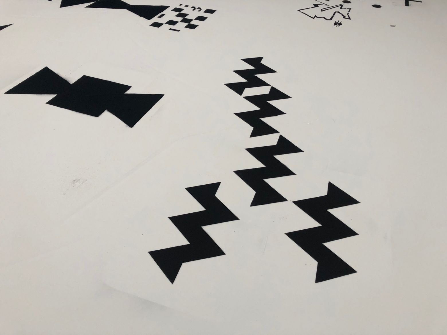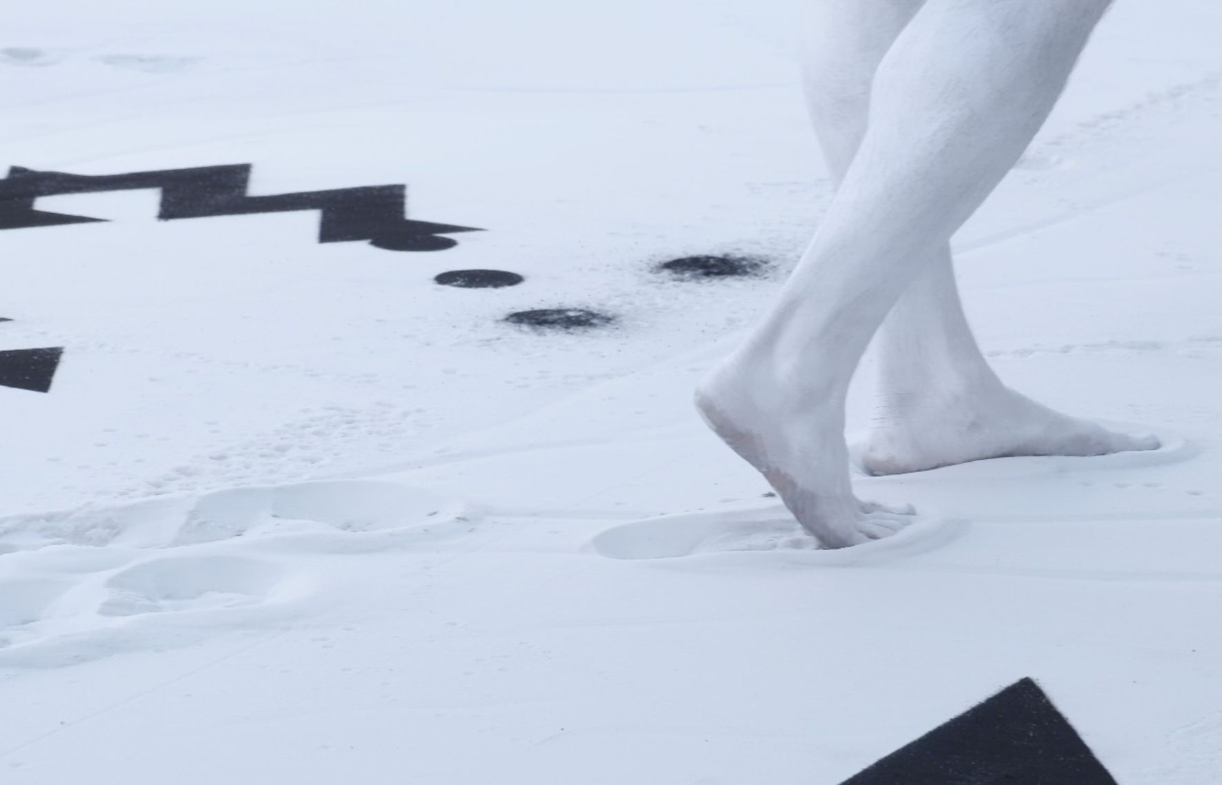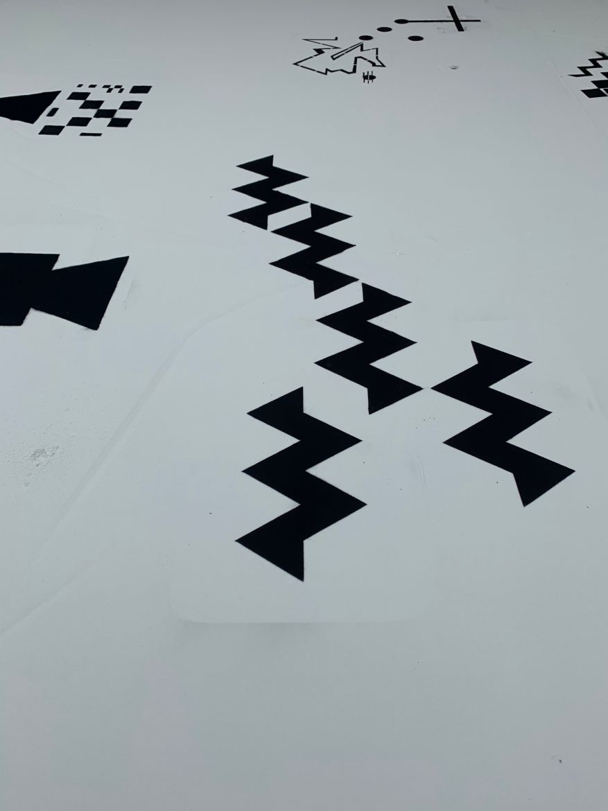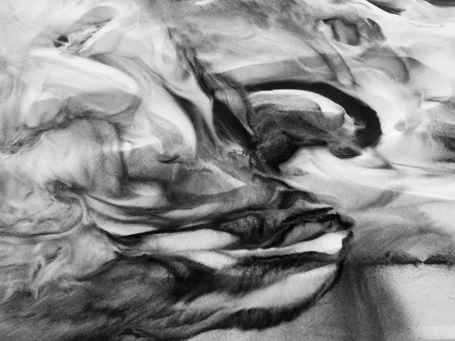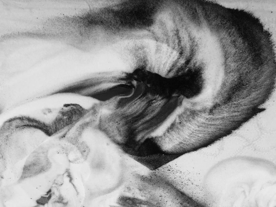 La bichromie noire et blanche de l’installation vient souligner cette qualité de témoignage, remémorant par là-même celle des tapis berbères comme celle de l’encre sur la feuille de papier. Les signes parsemés dans le sable prennent alors des airs de partitions silencieuses, indéchiffrables. Ces dernières pourraient d’ailleurs être celles de la composition sonore qui les accompagnent tout comme la promesse d’autres figures, de ballet, de notations de pas dansés, de choréologies ou de cinétographies inédites, brouillant ainsi les pistes entremêlées des matières sonores et visuelles, des inspirations artistiques et culturelles, et des langages convoqués.