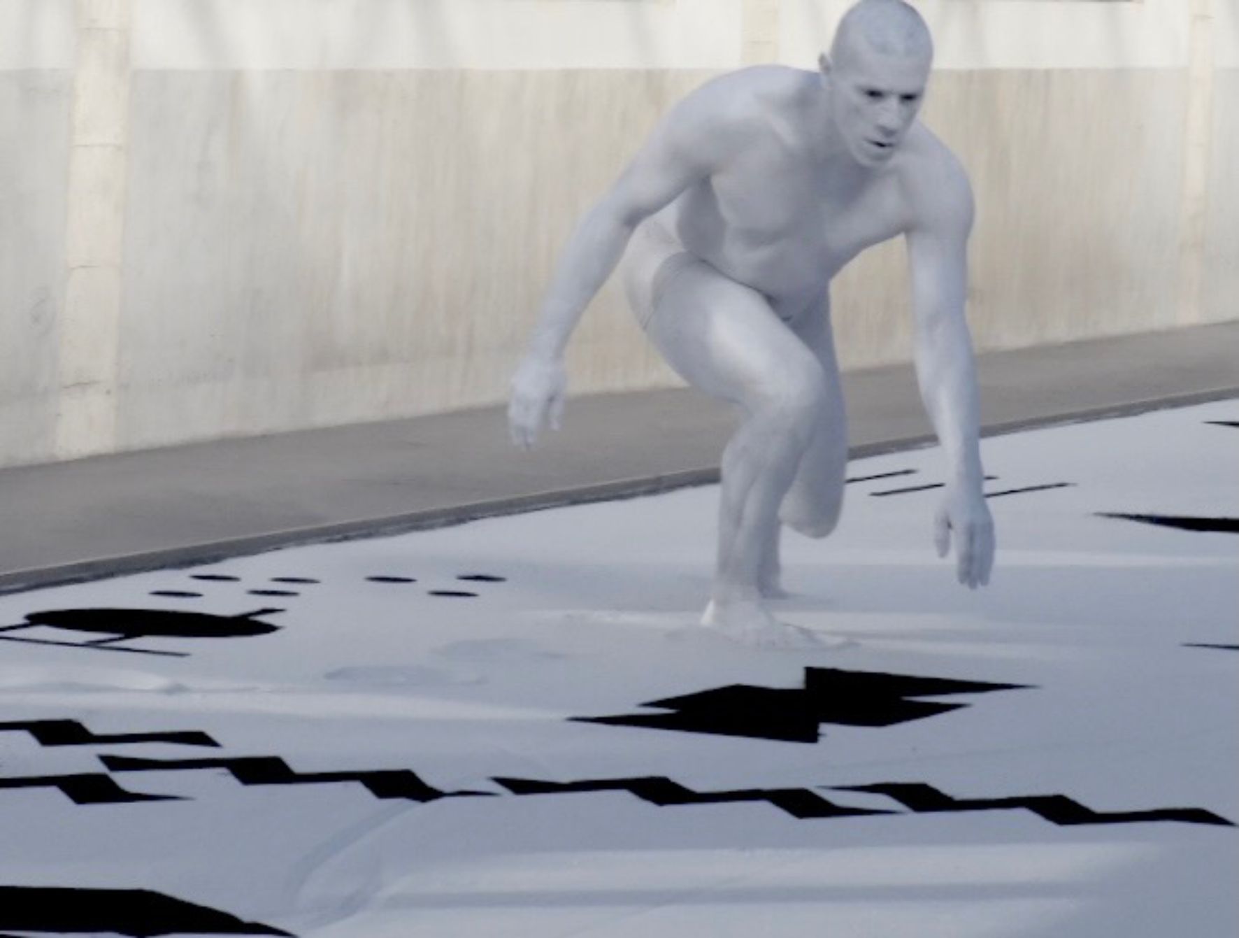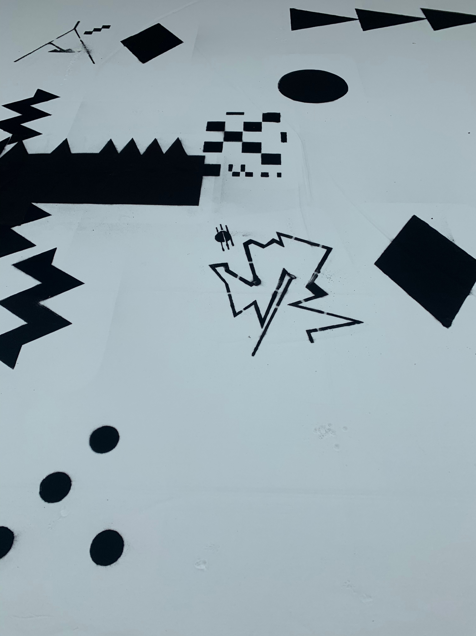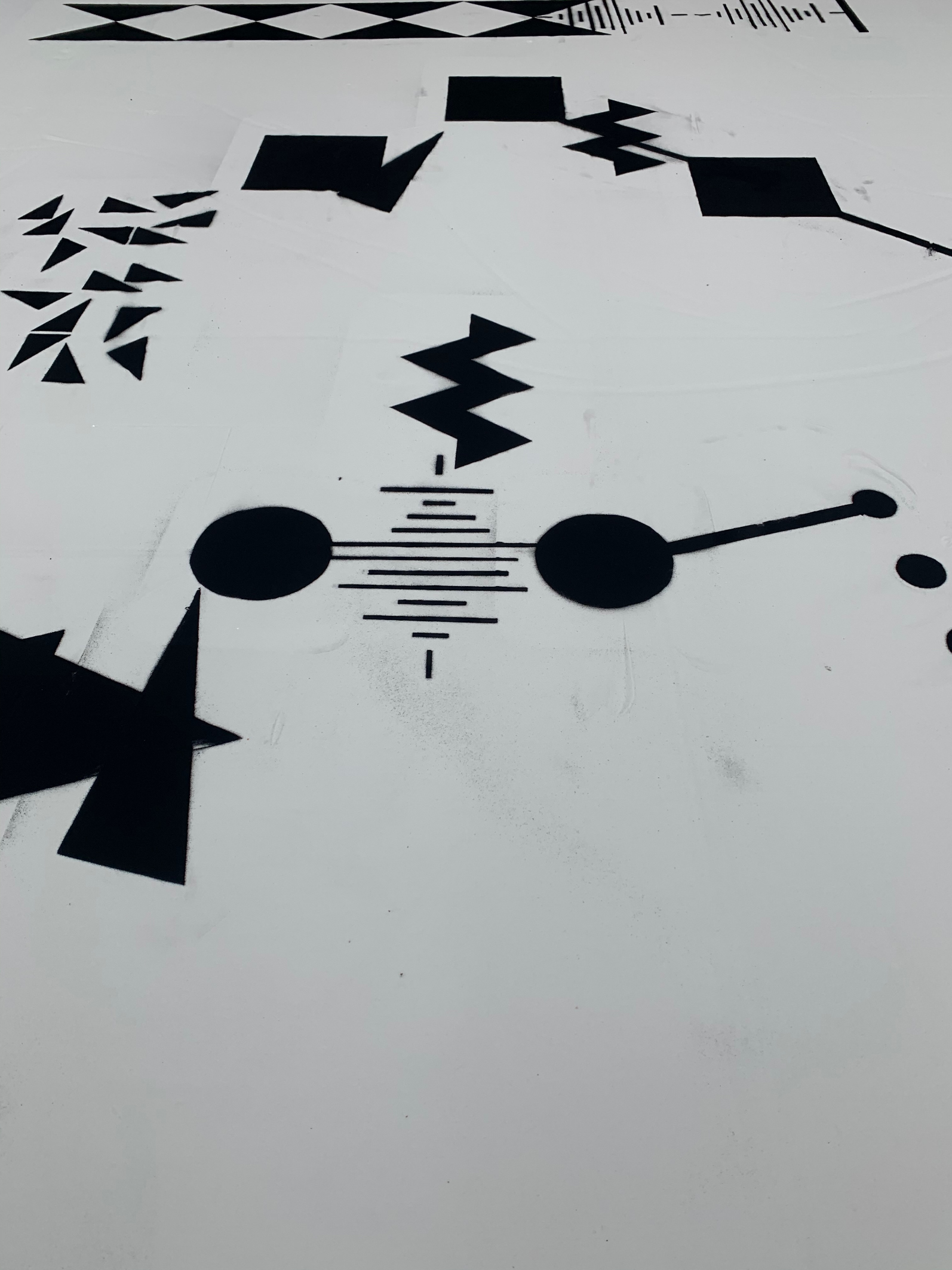 La bichromie noire et blanche de l’installation vient souligner cette qualité de témoignage, remémorant par là-même celle des tapis berbères comme celle de l’encre sur la feuille de papier. Les signes parsemés dans le sable prennent alors des airs de partitions silencieuses, indéchiffrables. Ces dernières pourraient d’ailleurs être celles de la composition sonore qui les accompagnent tout comme la promesse d’autres figures, de ballet, de notations de pas dansés, de choréologies ou de cinétographies inédites, brouillant ainsi les pistes entremêlées des matières sonores et visuelles, des inspirations artistiques et culturelles, et des langages convoqués.