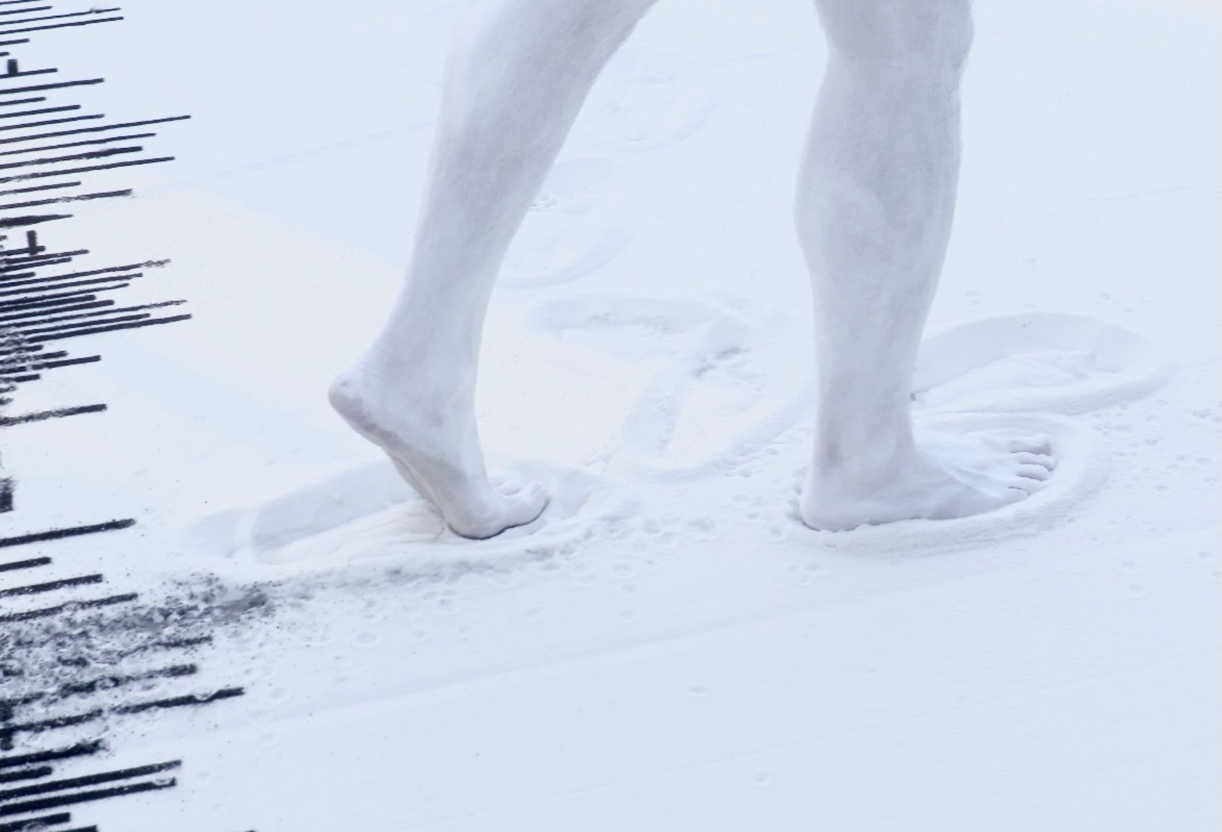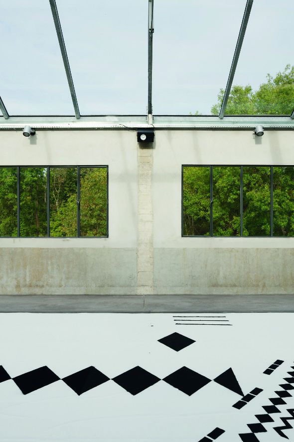 Installation sonore, tapis de sable blanc, pigments noir, bordure métallique, haut-parleurs et amplificateur, 5000 x 500 x 5 cm. Production Les Tanneries, 2020.