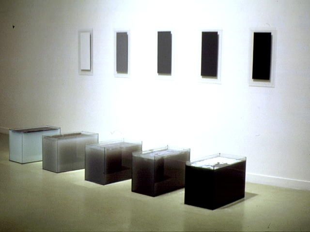 5 aquariums, eau, peinture, 5 peintures sur verre au mur, dimensions variables.