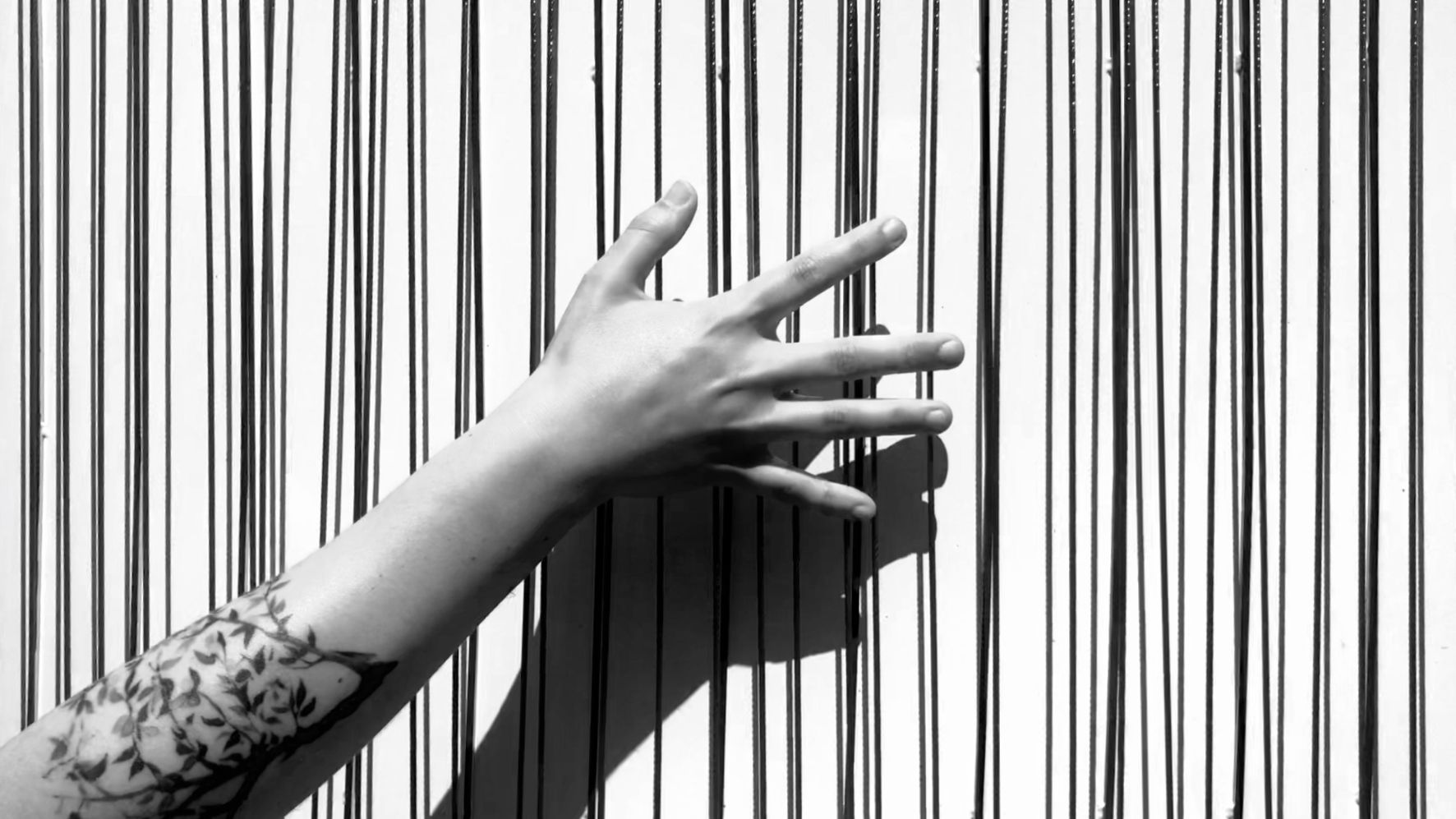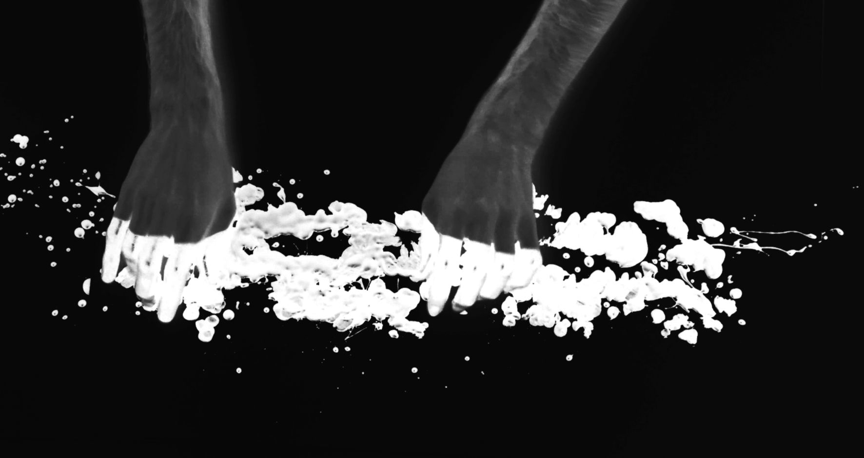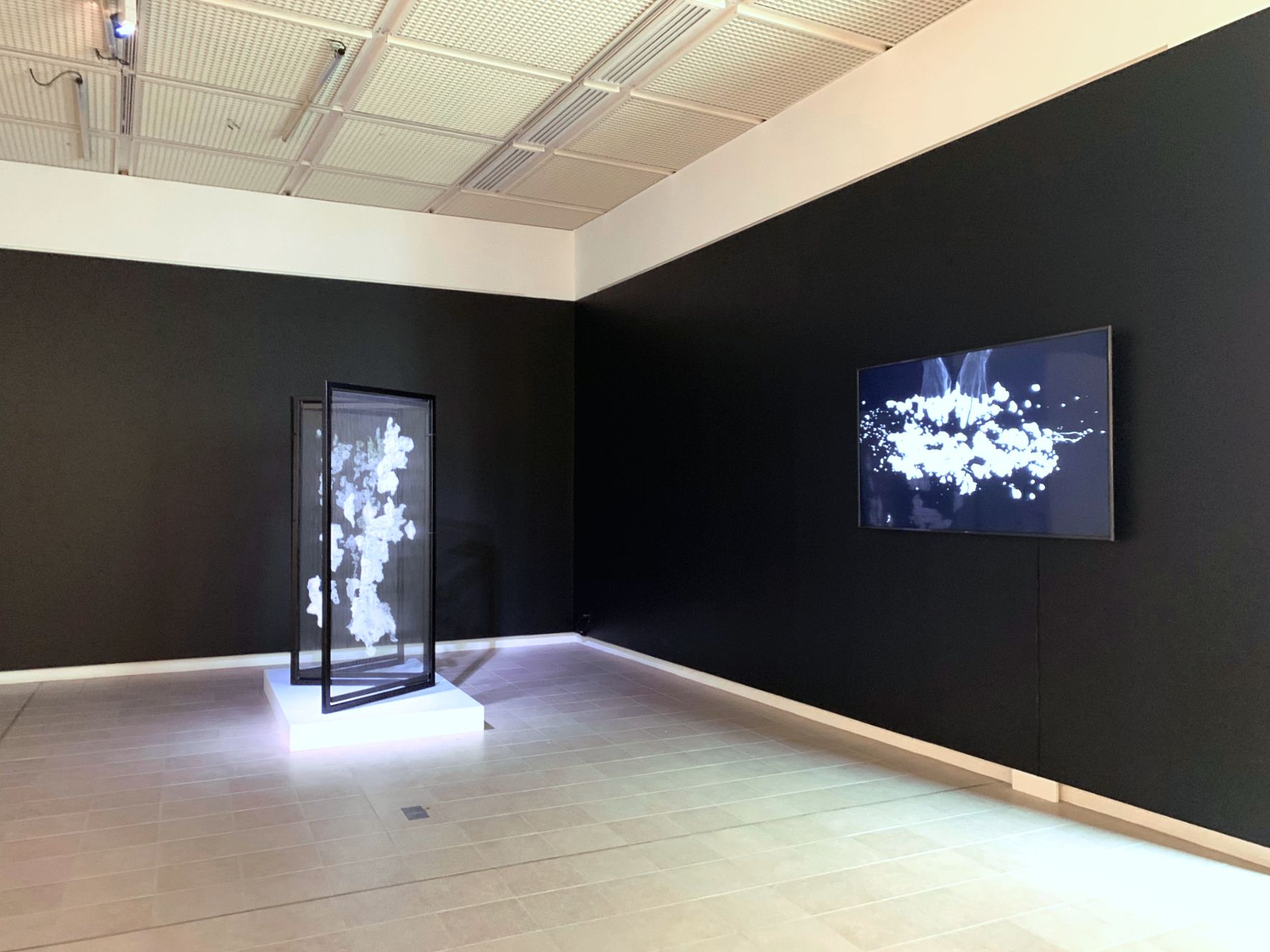 Vidéo noir et blanc muette 3' projeté sur toile noire tendue sur châssis, 250 x 120 cm.