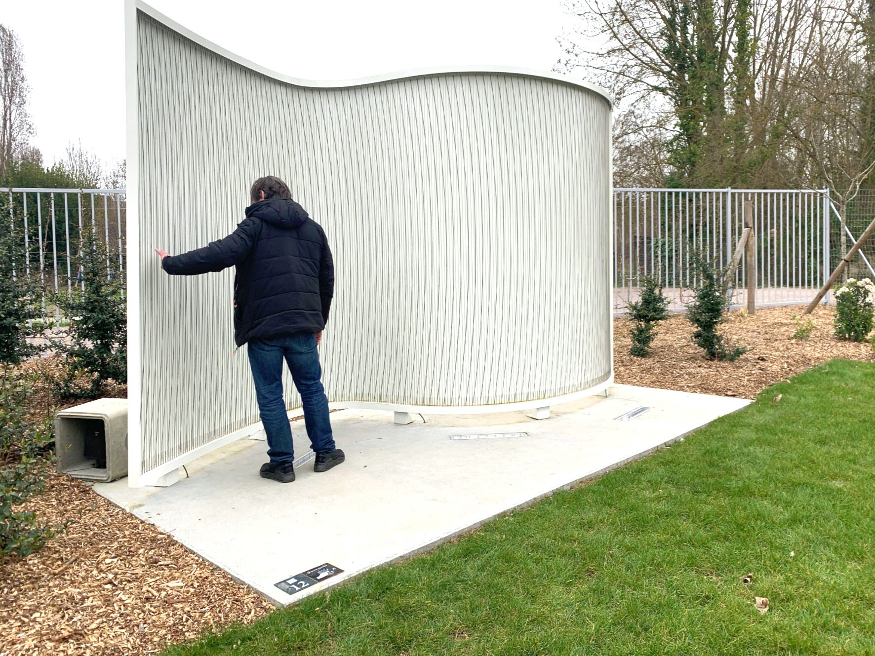 Cette sculpture/instrument, dont la forme architecturale s’inspire des rubans partitions Phylactères s’offre comme un instrument à toucher, à regarder, à écouter... Cette œuvre convoque trois sens, elle propose au spectateur une expérience immersive tactile, visuelle et sonore à l’échelle du corps et du jardin, une exploration, dans un corps à corps avec la matière et les sons. Cette œuvre s’expose tel un monolithe dont les courbes évoquent les flux et les lacets de la rivière. La surface verticale de la sculpture/instrument est habillée de cordes d’acier inoxydables tendues qui construisent une « table de résonance » acoustique. Ces fils de métal tendus telles les cordes d’une harpe présente« une surface moirée » véritable tableau de fréquences, dont les ondes sont rendues visibles par un phénomène optique du à la superposition de deux trames. Ainsi, la « surface de résonance » offre une perception simultanée d’ondes visuelles et d’ondes sonores comme un écran de mise en équivalence de phénomènes acoustiques et visuels. L’image damassée fabriquée par la juxtaposition des cordes, présente des ondes multiples qui se dessinent à la surface des cordes. Ces dessins changent et évoluent en fonction de la position et du déplacement du regard. Cet écran d’apparition d’ondes trouve son écho lorsque le spectateur/auditeur frôle et caresse les cordes... Le toucher des cordes créer des harmoniques, équivalences sonores du moirage visuel.