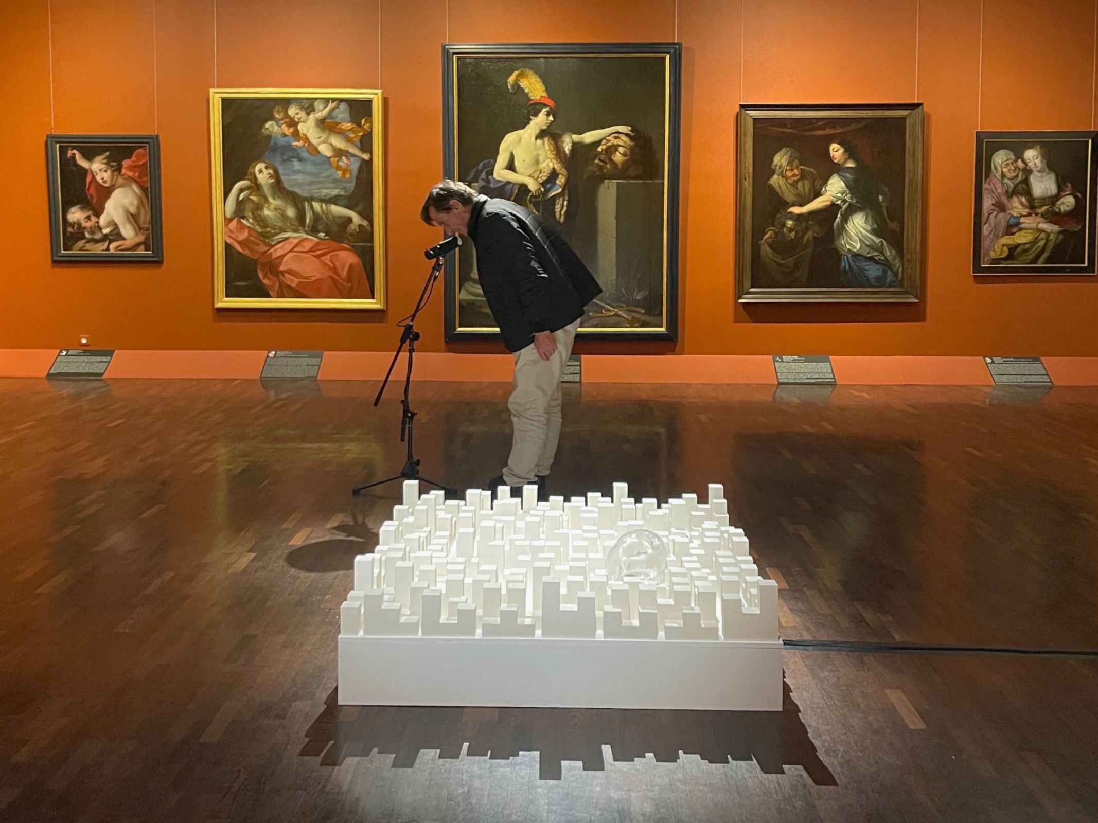 Cette sculpture sonore est installée en vis à vis du tableau « David et Goliath » de Rene Guido dit « le Guide » XVIIᵉ siècle. L’œuvre sonore posée au sol, absorbe les sons de l’environnement et transforme la salle d’exposition en « chambre sourde ». Cette sculpture s’inspire des panneaux de diffuseurs acoustiques installés dans les studios d’enregistrements. La composition sonore diffusée en boucle a été composée à partir d’enregistrements nocturnes effectués dans le musée (craquements, flux). Les sons diffusés dans la bulle de verre génèrent un tremblement à la surface de l’eau. Le microphone relié à la sculpture permet aux visiteurs de participer activement aux vibrations de l’eau en chuchotant, parlant ou criant dans le micro.