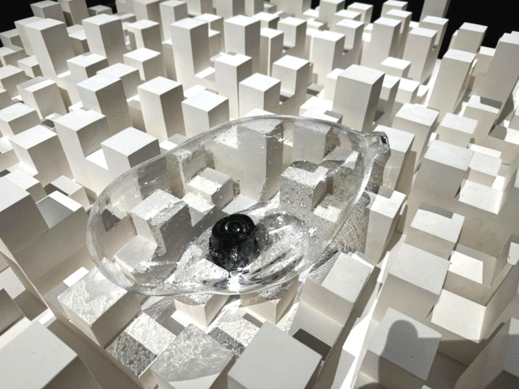 295 modules de plâtres, bulle en verre soufflé, eau, haut-parleurs, table de mixage, ampli, micro, câbles audio et socle en bois, 120 x 120 x 25 x 20 cm.