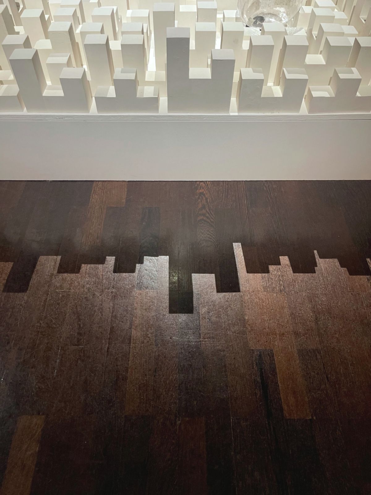 White noise (2024), sculpture sonore installée au sol, a été réalisée à partir d’assemblages de briquettes blanches s’inspirant des panneaux de diffuseurs acoustiques et d’une bulle de verre soufflée. Cette oeuvre a été conçue spécifiquement pour la salle d’exposition dans laquelle le tableau David tenant la tête de Goliath de Guido Reni dit « le Guide » est installé. Cette oeuvre absorbe les sons de l’environnement et transforme la salle d’exposition en « chambre anechoïque » dans laquelle les spectateurs deviennent des acteurs.