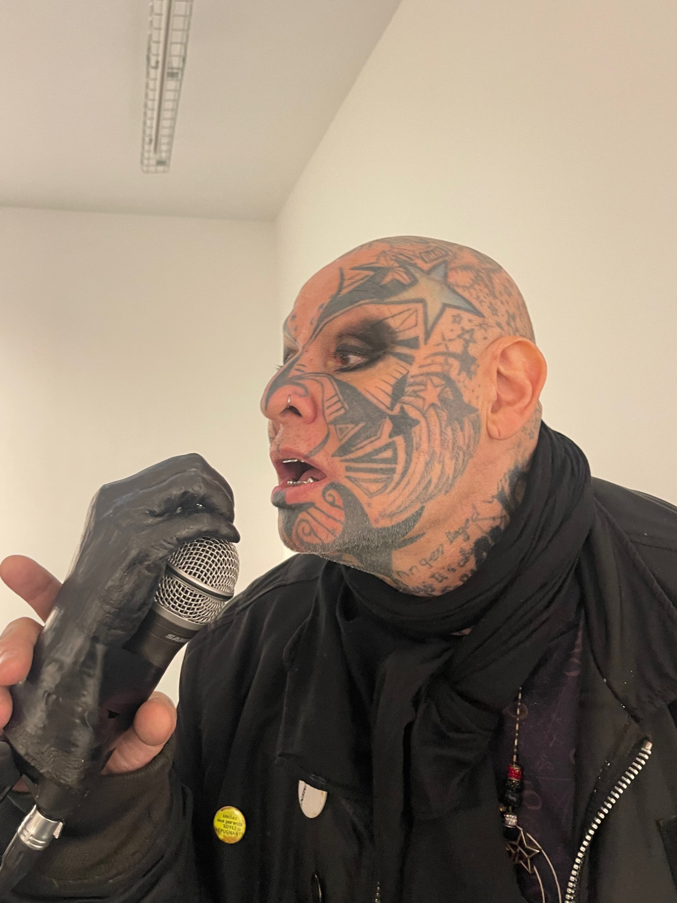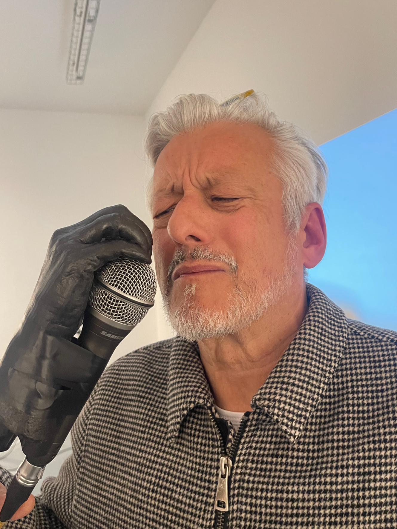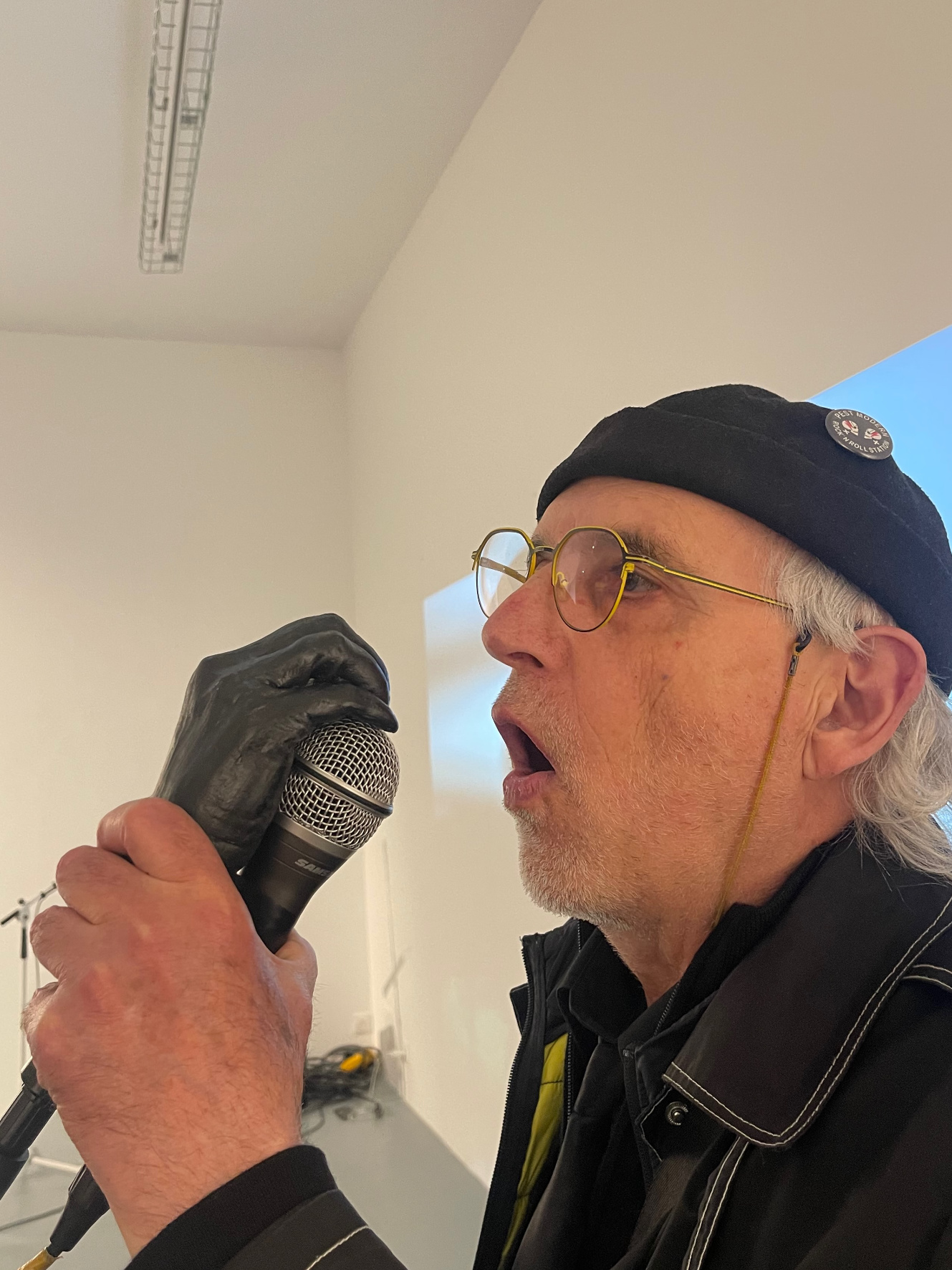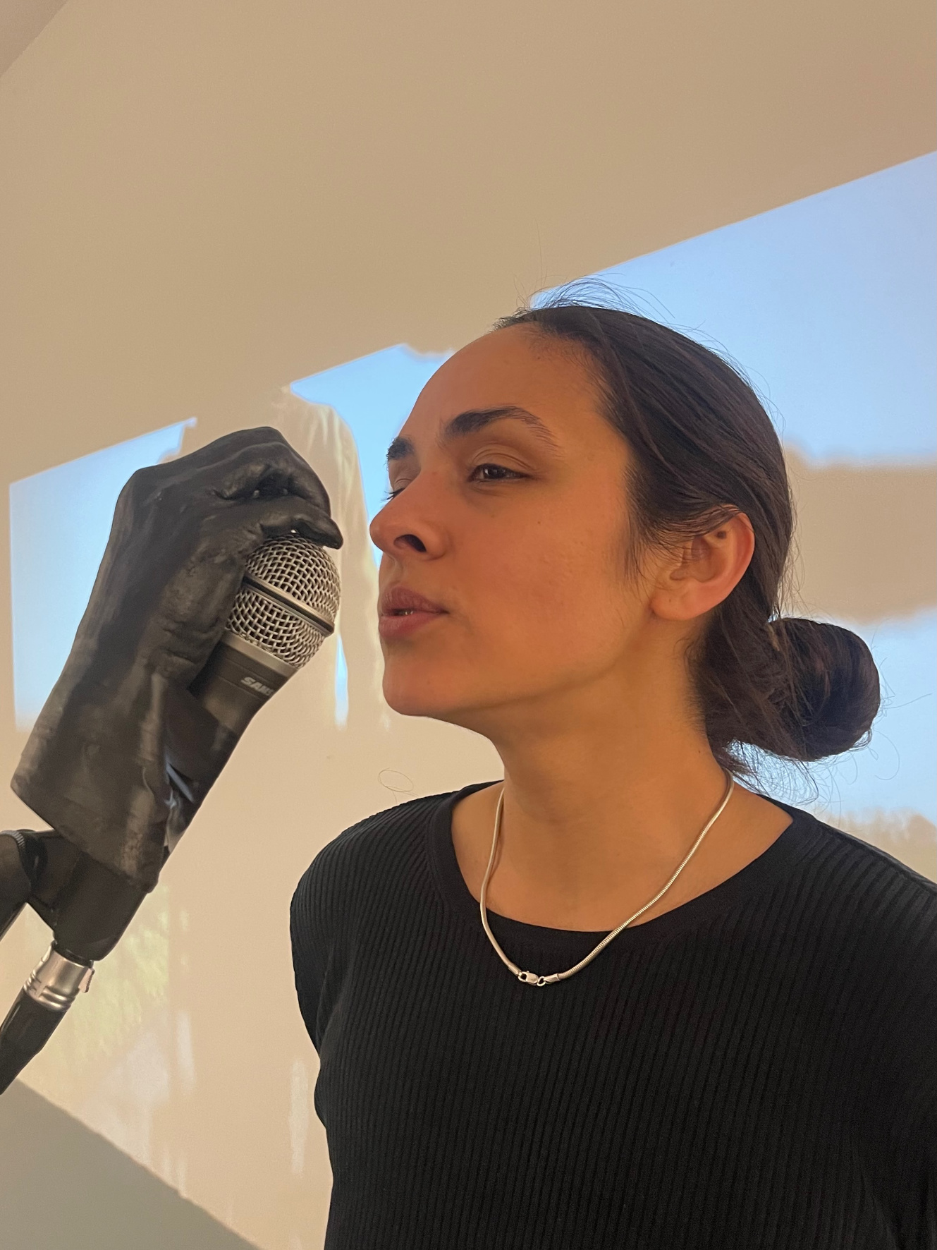 La main fixée au pied de micro, protège un micro raccordé à l’ampli. Les spectateurs sont invités à chanter, murmurer, crier en s’approchant de la sculpture amplifiée. Lorsqu’elle n’est pas activée, elle reste silencieuse et énigmatique.
