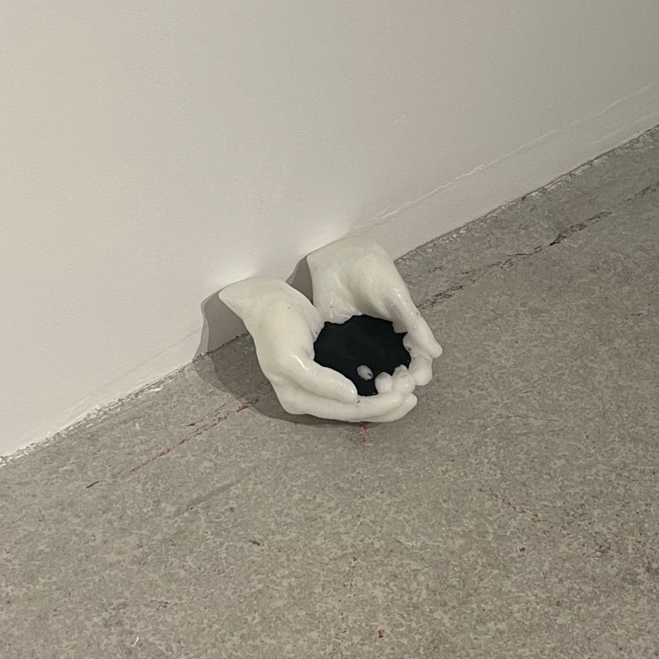 Sculptures de mains de cire posées au sol, eau noire, dimensions variables.