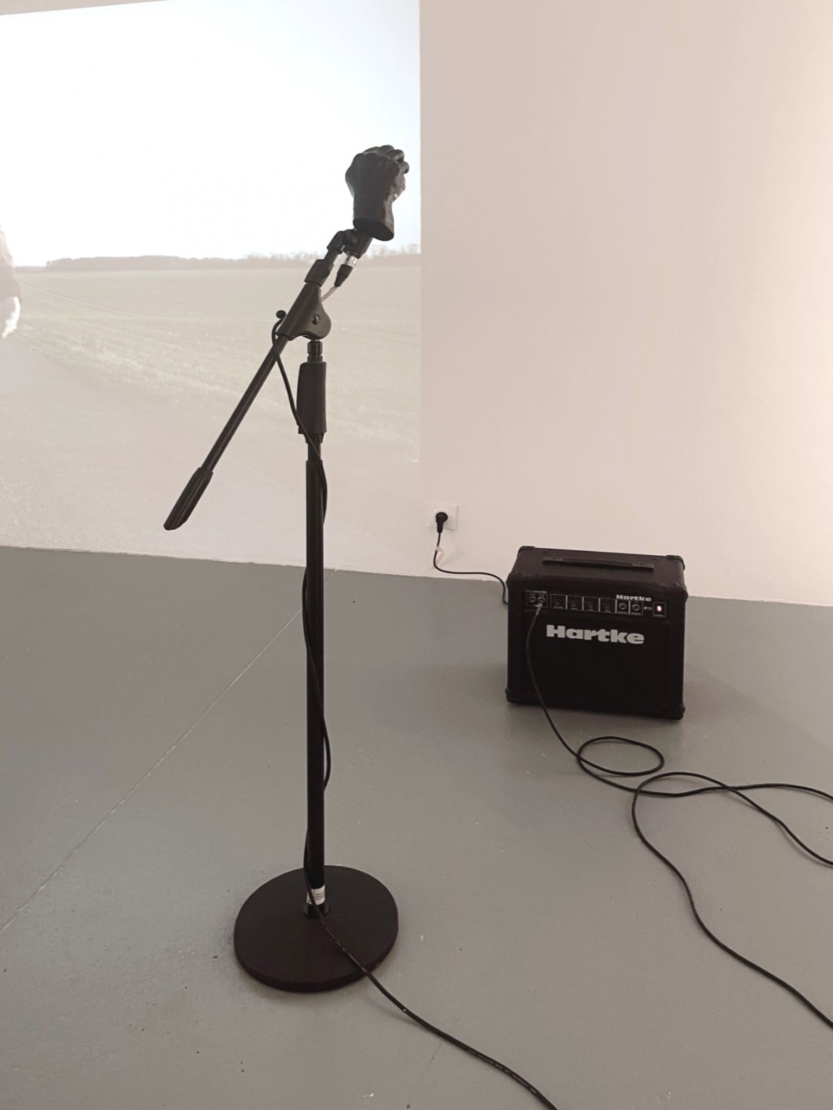 Main moulage en plâtre, encre de chine, micro, câble, ampli, pied micro, velcro, hauteur de 150 cm.