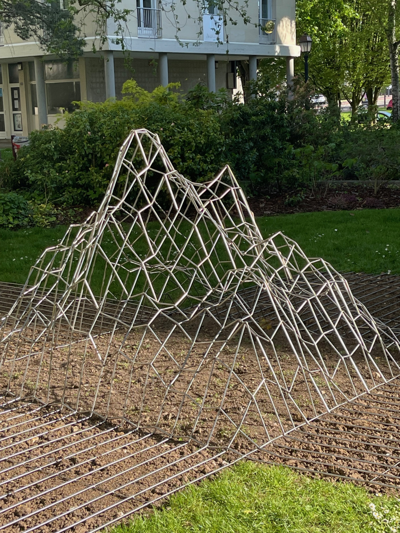 Sculpture en acier inoxydable, QR Code, composition sonore 12' de Francisco Alvarado, 400 x 400 x 150 cm, Parc Saint-Étienne, Beauvais.