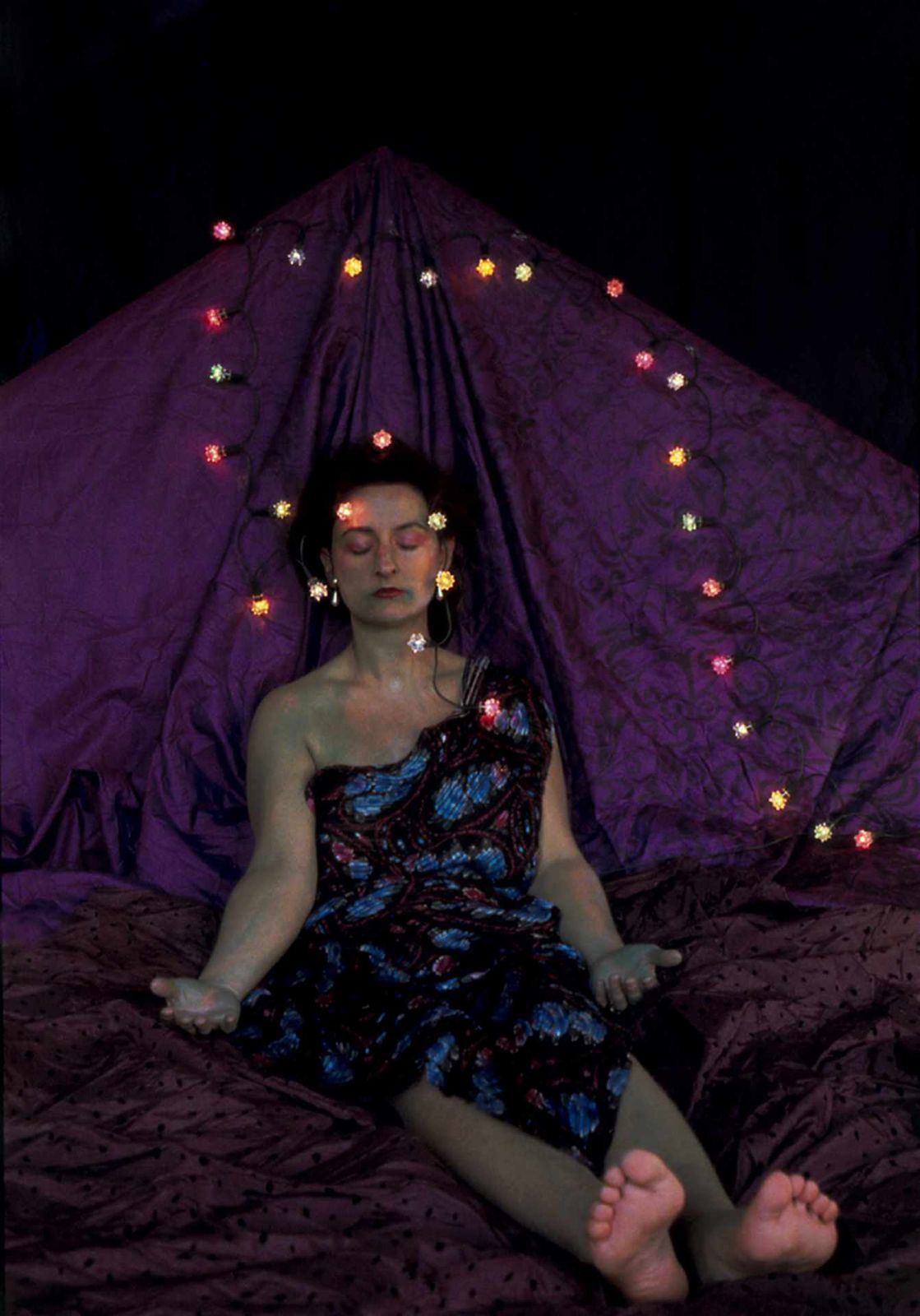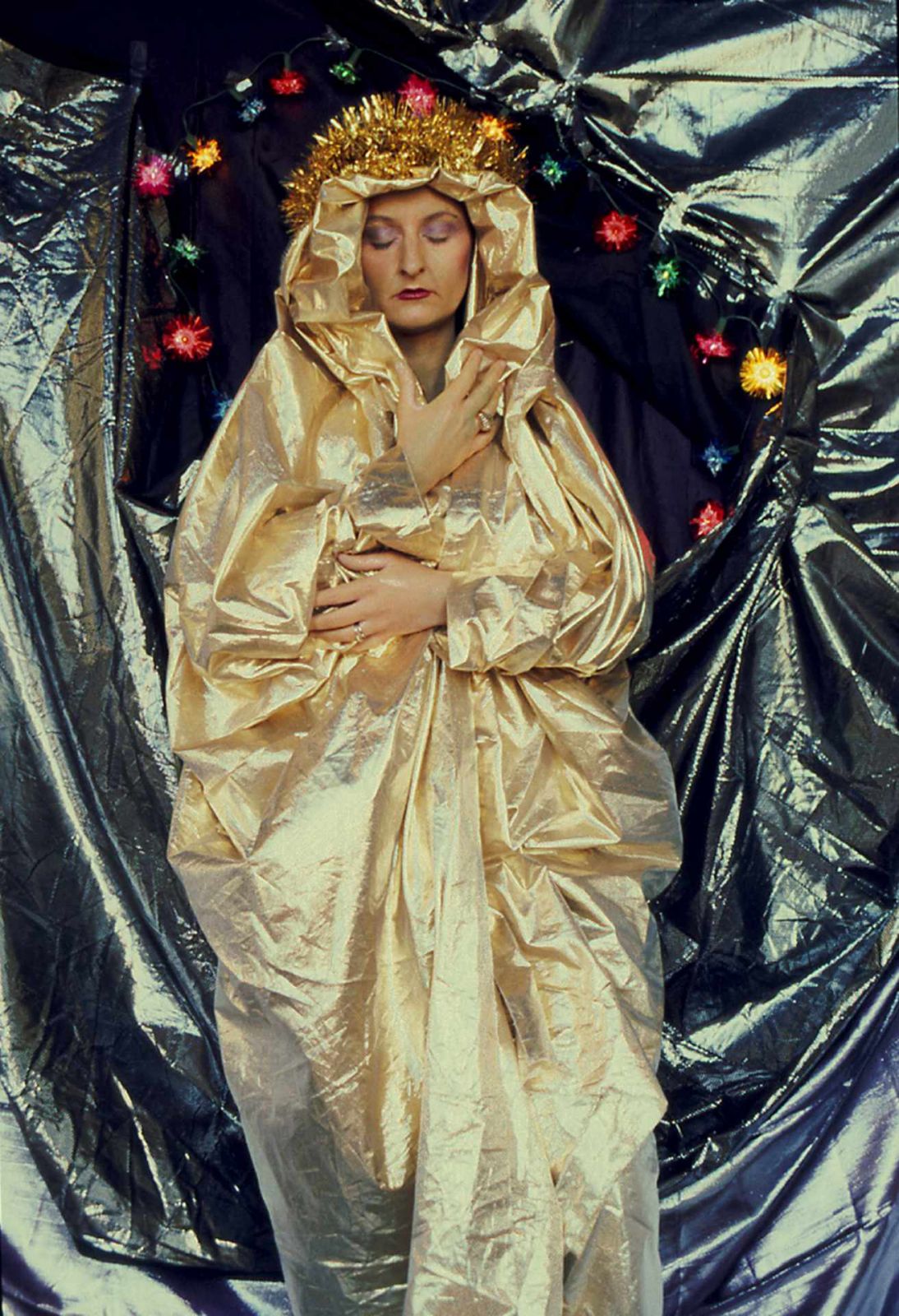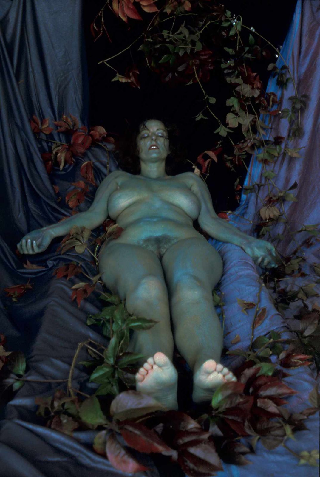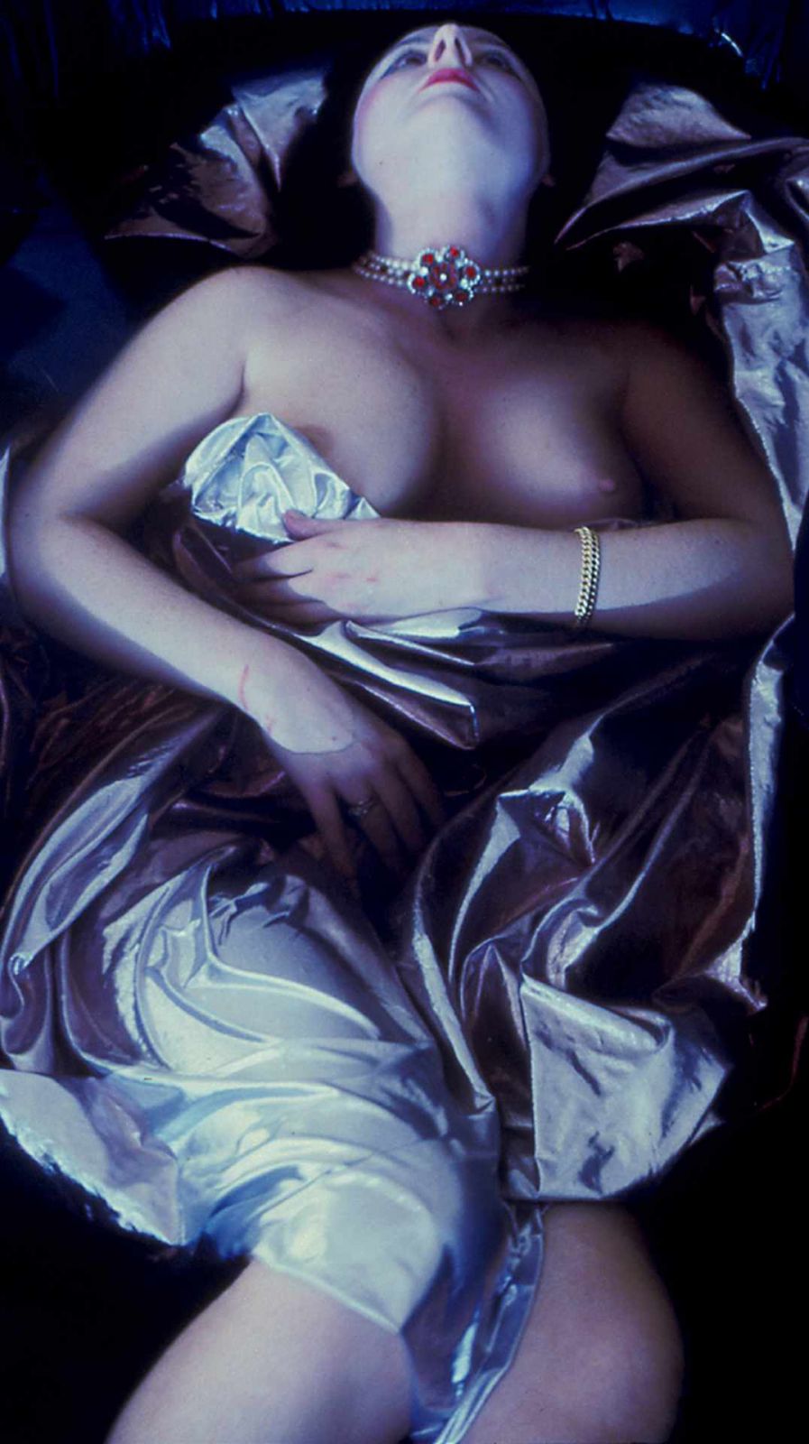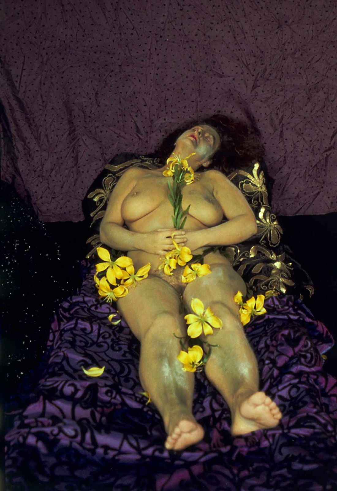 « Florence Chevallier. Je suis ce vrai corps — là, et ce corps — là, et ce corps — là, vrai vivant et faux mort dans une vraie mort jouée d’en-deçà et d’au-delà la mort. Je me déguise comme tous les morts qui pour faire la fête se font la tête effondrée, les mains croisées, les bras relâchés, les yeux fermés ou renversés, les lèvres ouvertes de tous les morts qui miment et trompent la mort. Je mime avec outrance car la mort c’est kitsch. Fleurs, fourrures, bougies, bijoux, fards, voiles, tentures... Vous pensiez que ces seins là, ces hanches là, cette toison là ne faisaient pas partie du tableau stéréotypé de la mort ? »