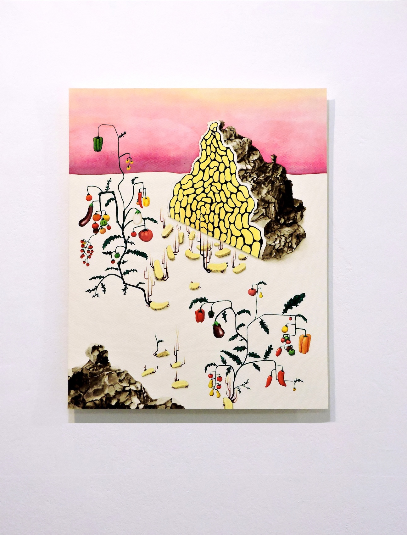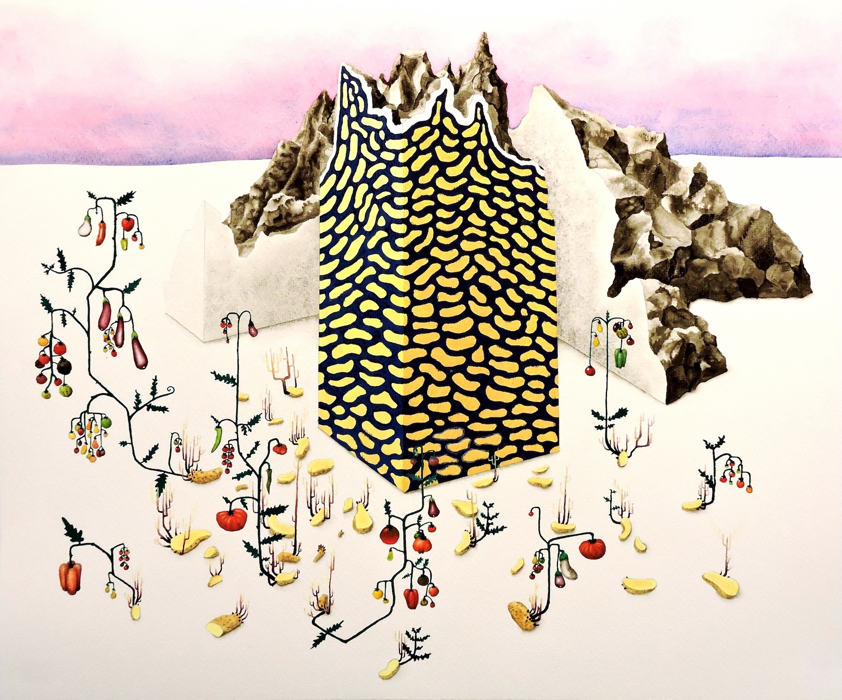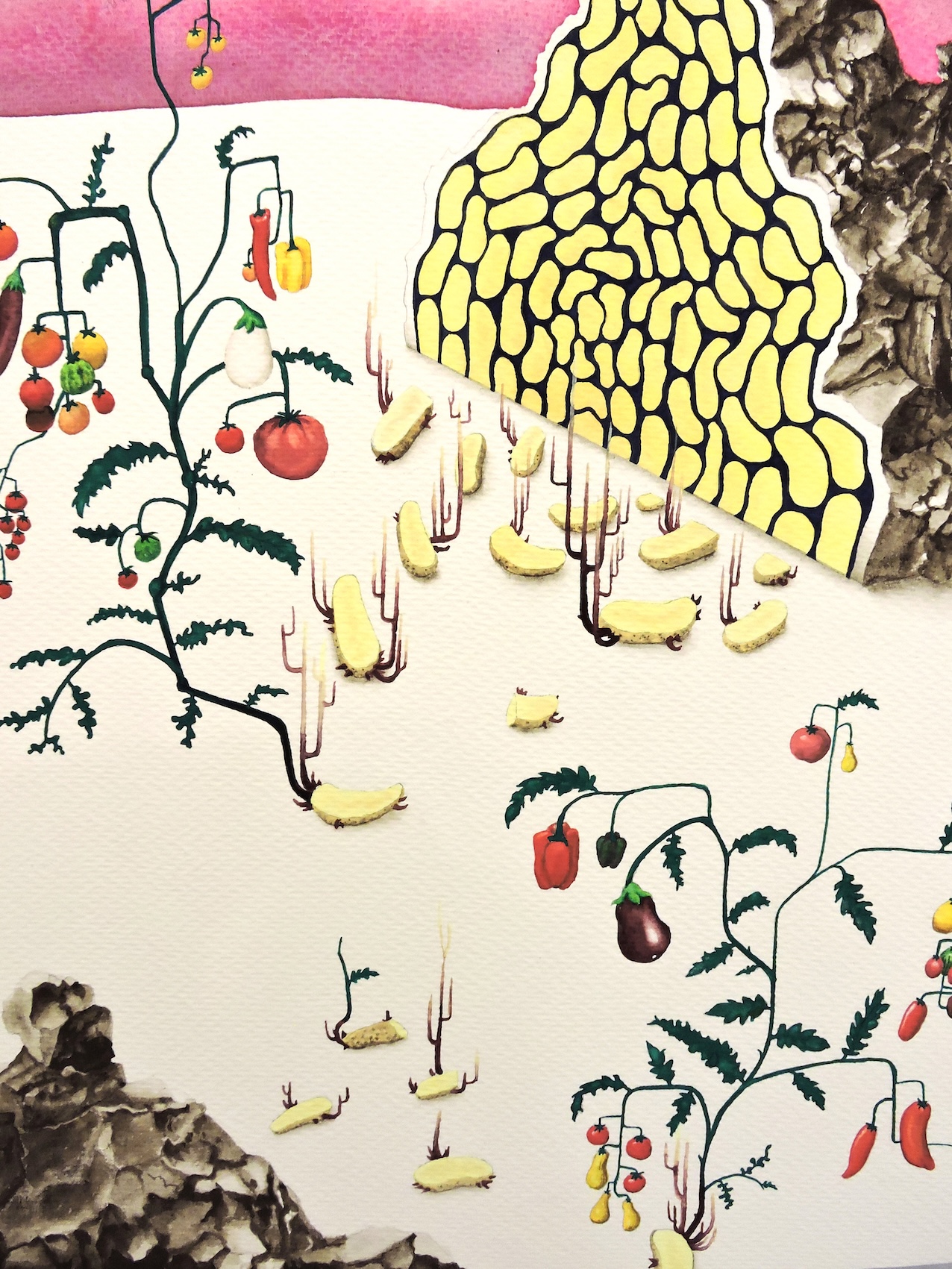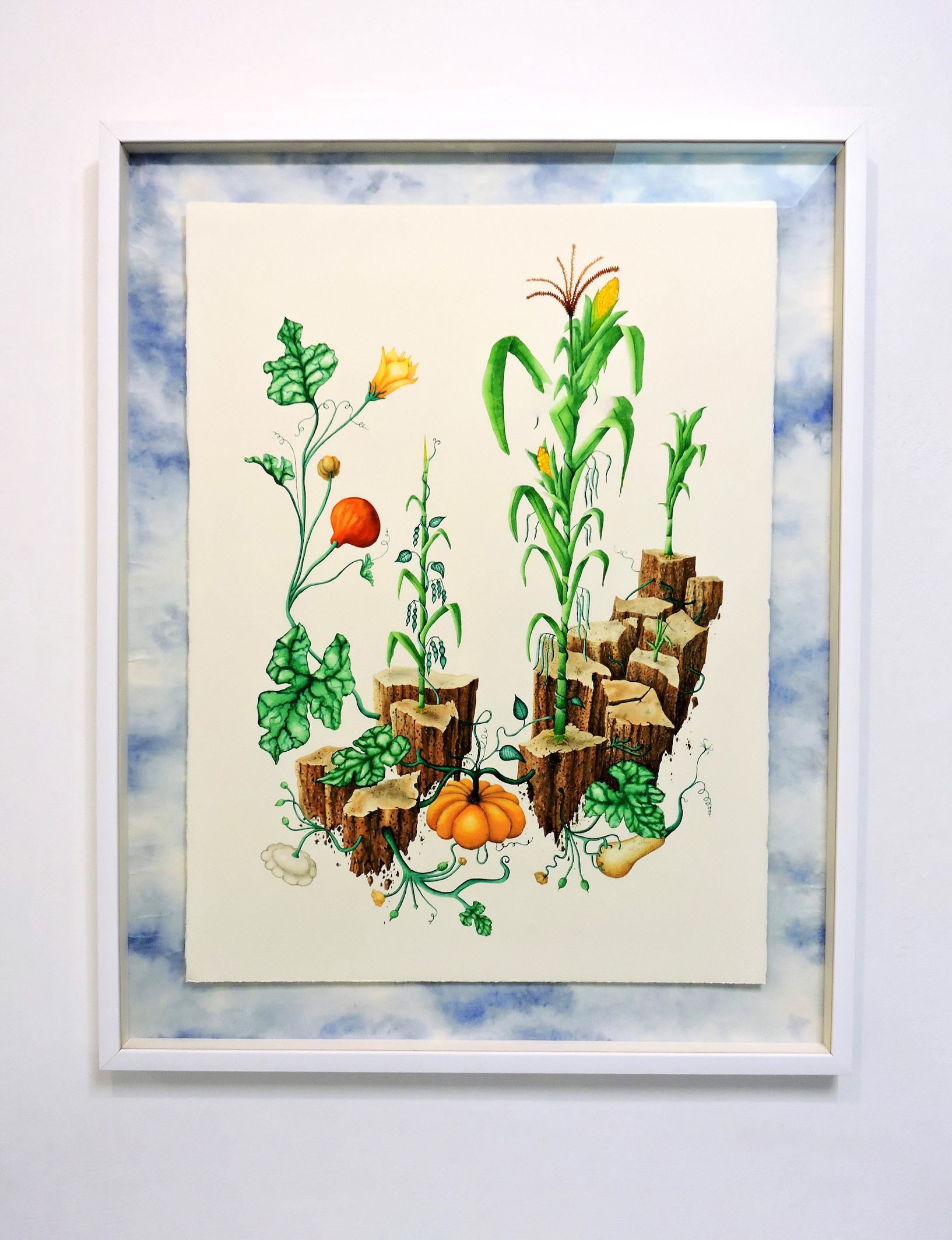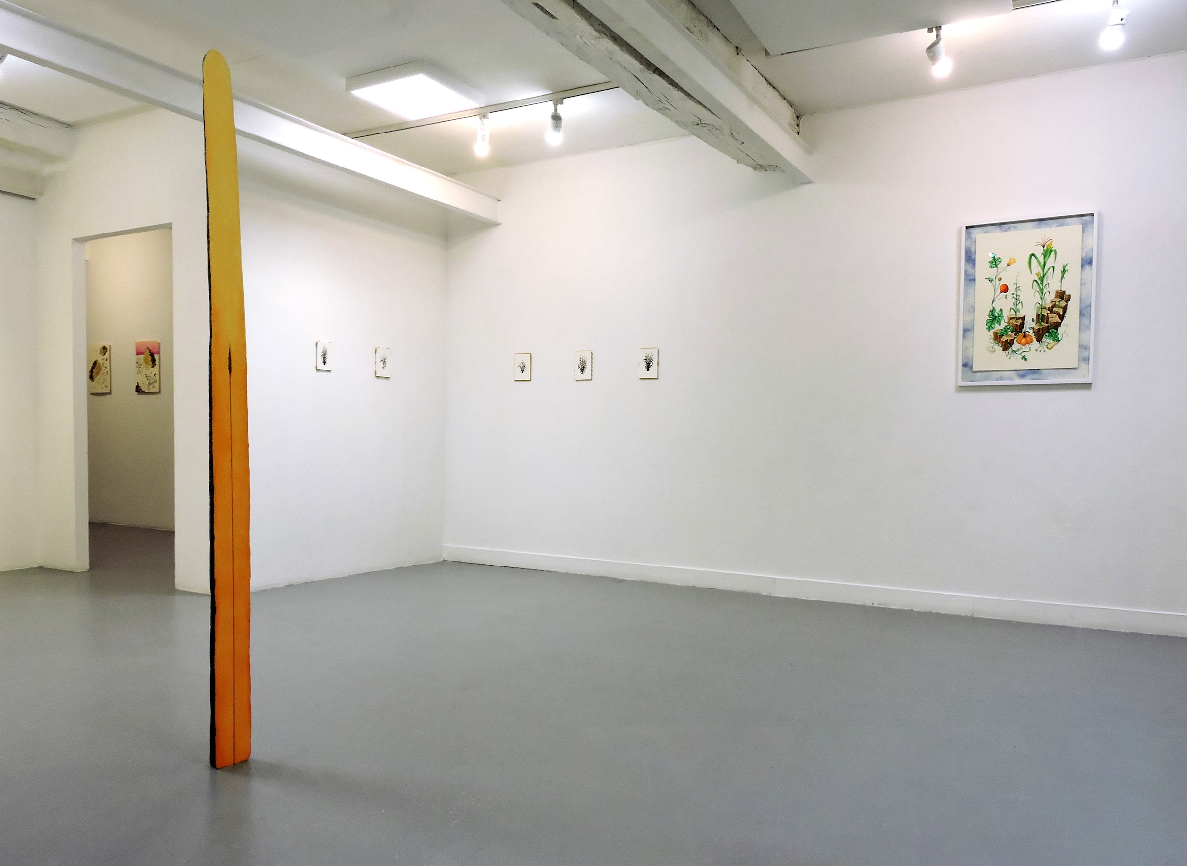 Ici, l'ordinaire révèle sa dimension extraordinaire : une pomme de terre dont les germes portent toute sa constellation génétique devient cartographie du vivant ; un maïs bleu géant interroge, la logique du rendement agricole et ses dérives... À travers peintures et sculptures oscillant entre documentation botanique et fabulation poétique, les plantes dialoguent et tissent des liens nous invitant à la réflexion. Les dessins puisent dans les planches anatomiques pour dériver vers l'imaginaire : le familier se fait étrange, le banal s'élève en Monde. Couleurs chatoyantes, formes graphiques et coupes anatomiques dévoilent une organisation complexe et une beauté paradoxale.