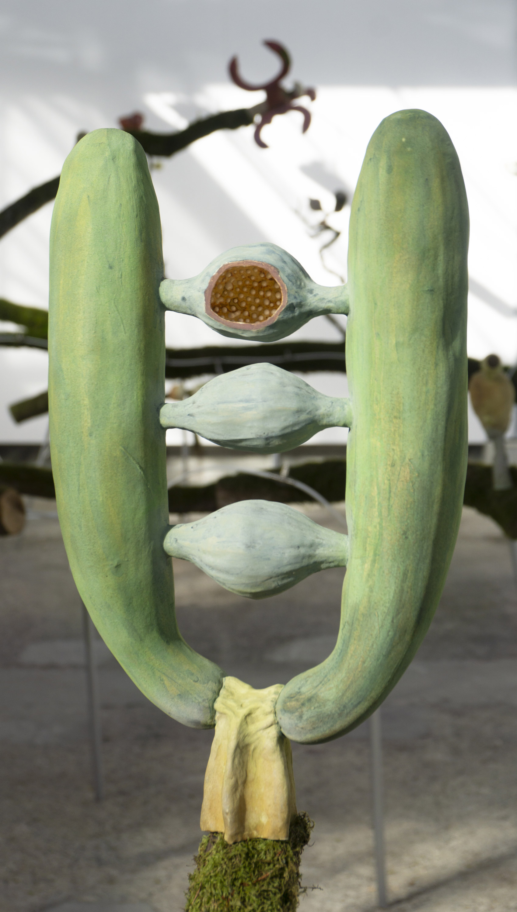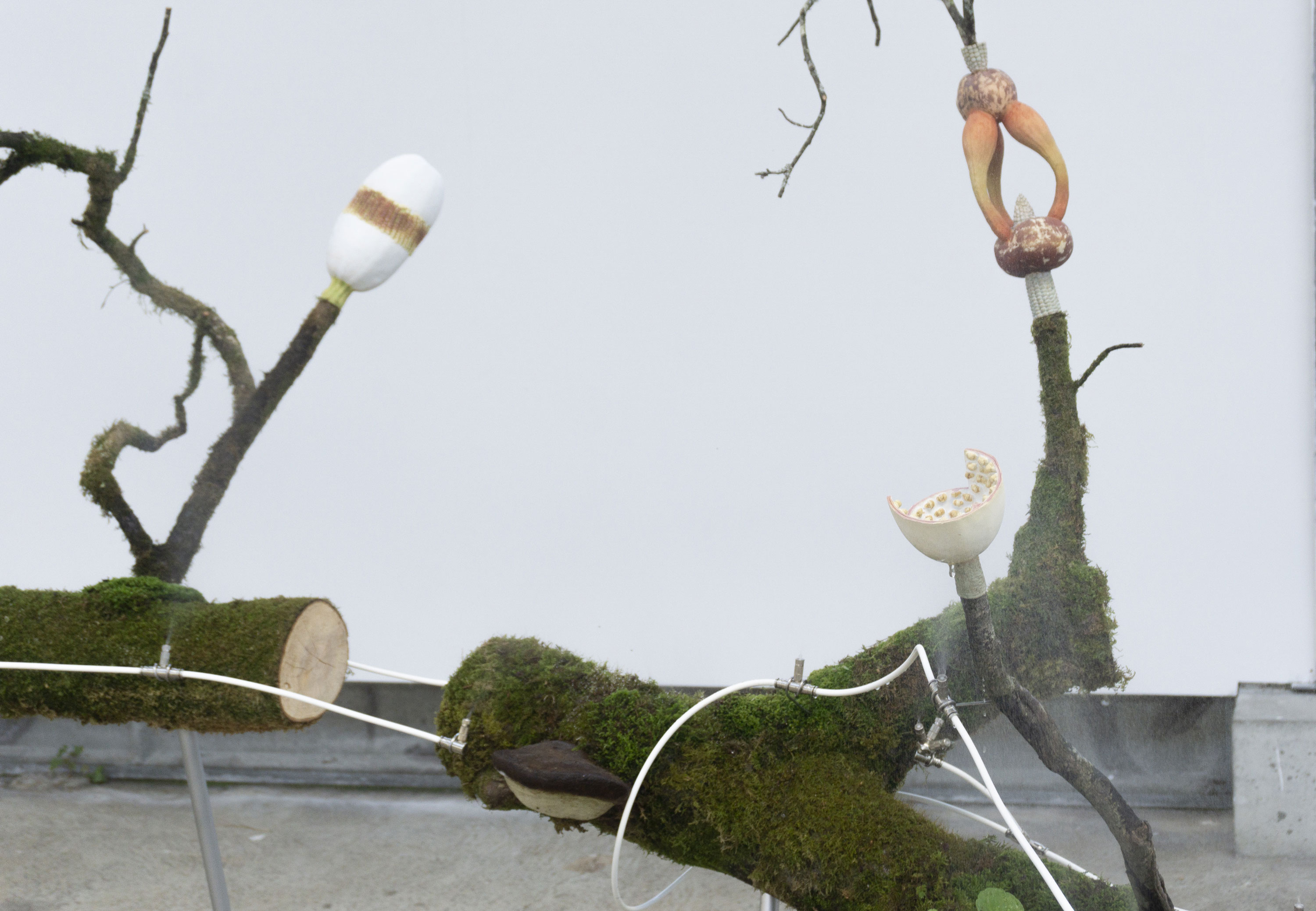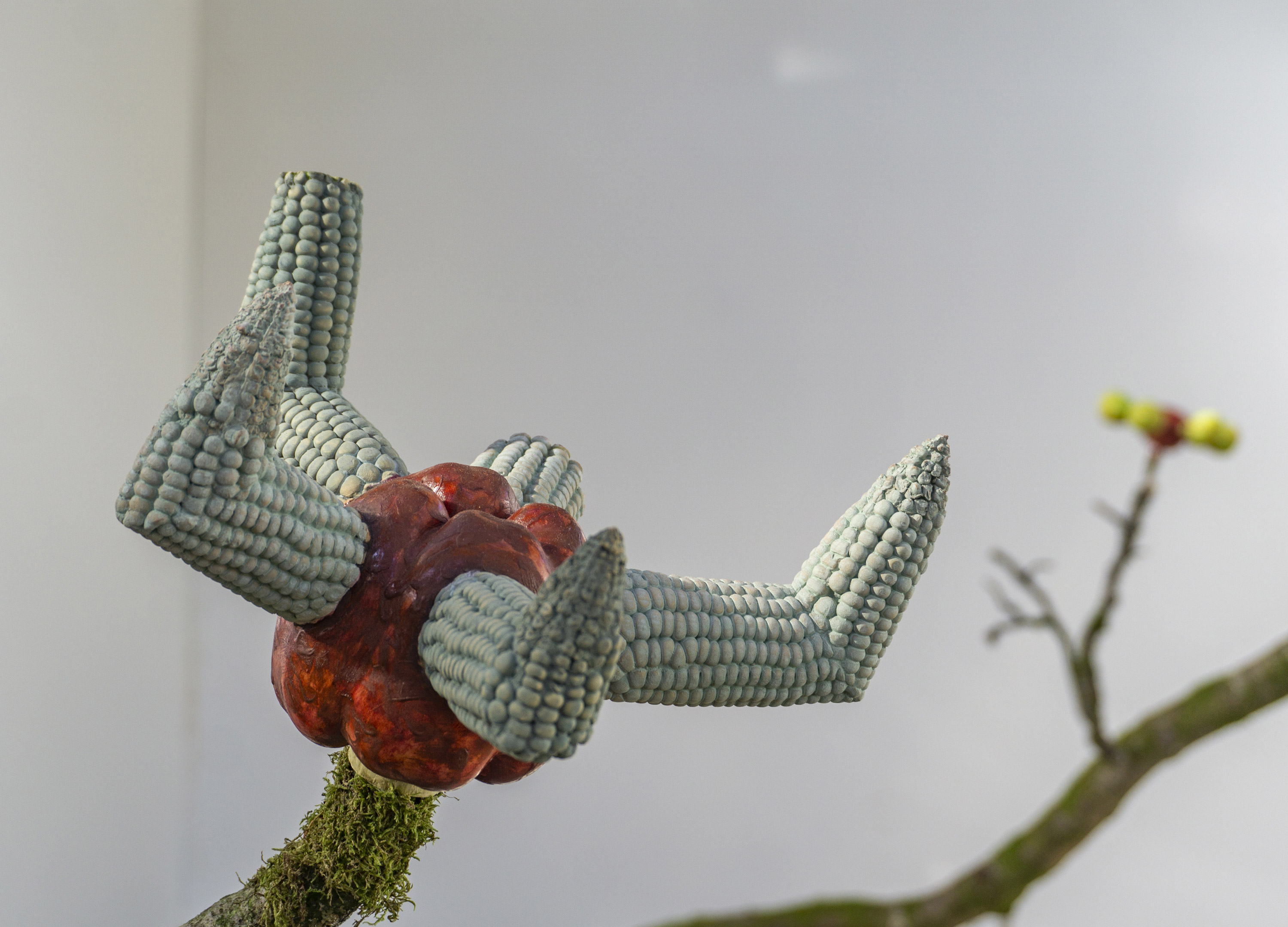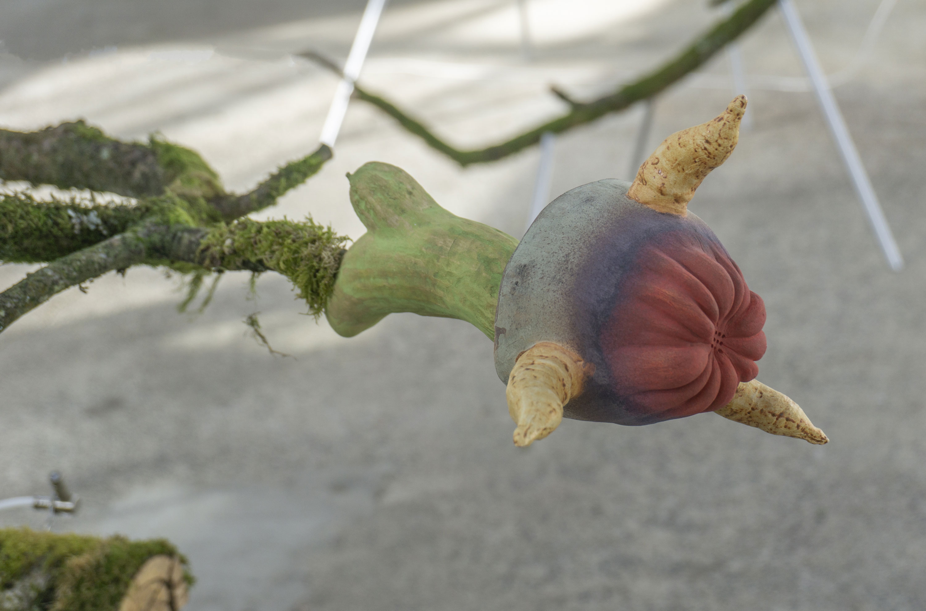 Cet ensemble présente des céramiques fichées sur des branches : elles représentent des espèces potagères en pleine mutation, dont on reconnaît l’aspect de certains fruits et légumes traditionnellement présents sur nos étals toute l’année, tels que des courgettes, des concombres, maïs ou poivrons. Chaque assemblage en céramique propose une hybridation unique de ces fruits aux carnations multiples. La découpe nette de certains hybrides permet d’en découvrir l’intérieur : on y trouve, non pas le système organique du fruit mais un réseau de veines et de fluides corporels.