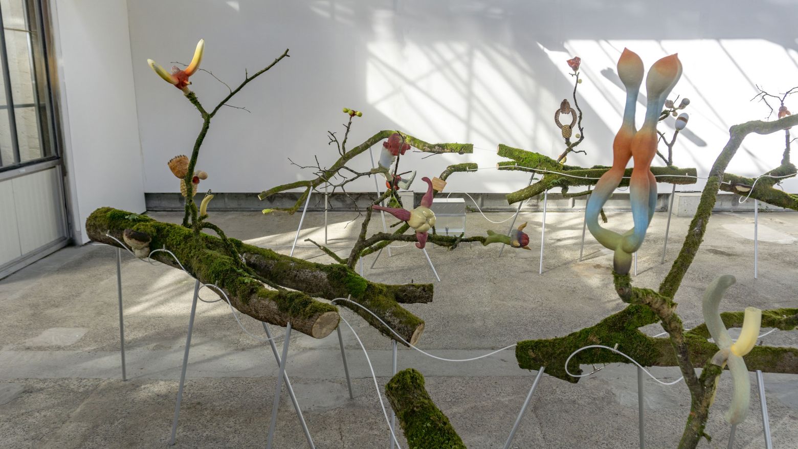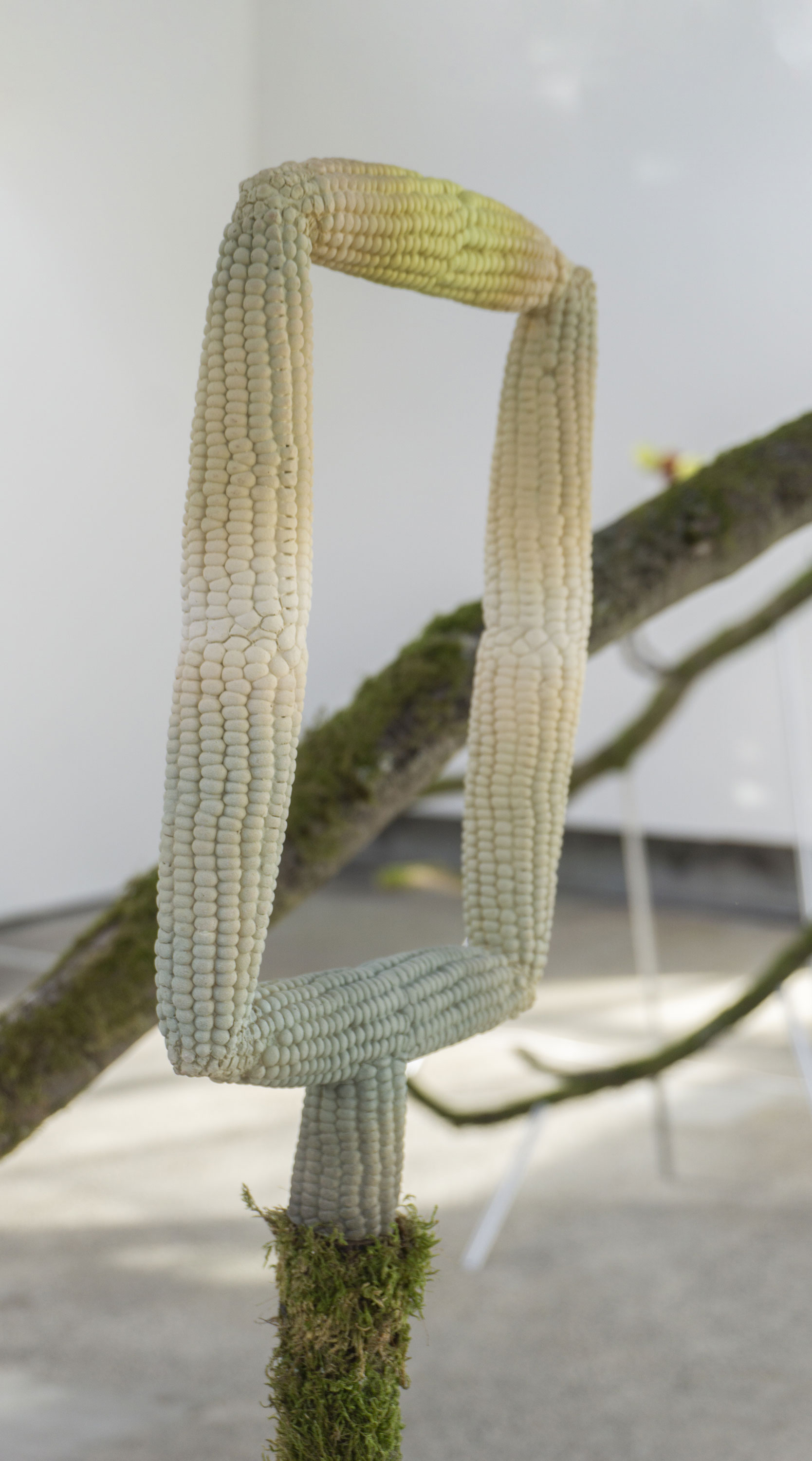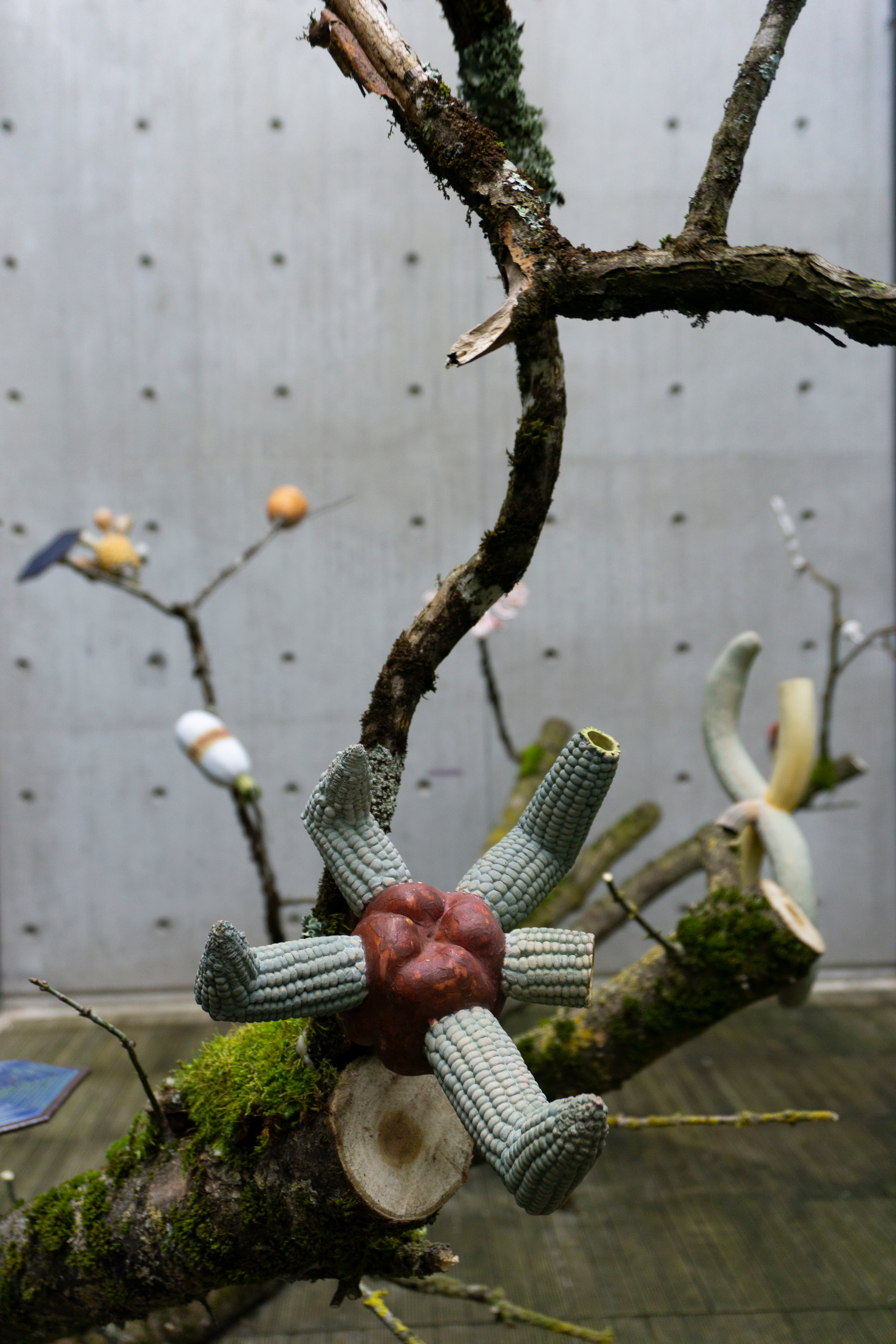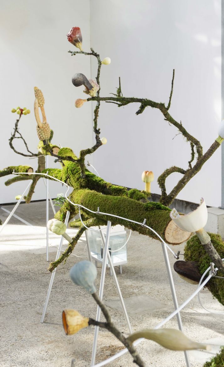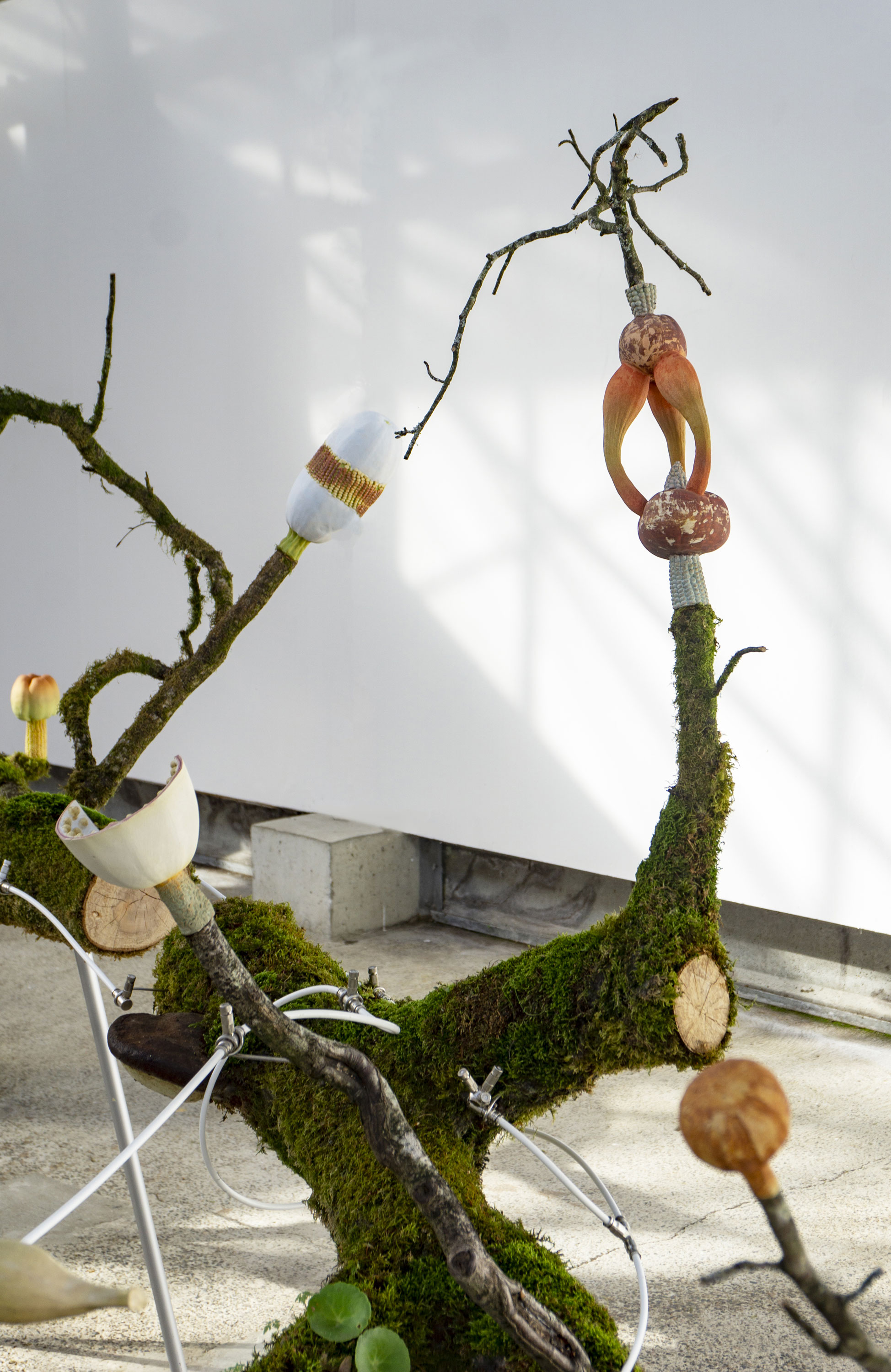 Cet ensemble présente des céramiques fichées sur des branches : elles représentent des espèces potagères en pleine mutation, dont on reconnaît l’aspect de certains fruits et légumes traditionnellement présents sur nos étals toute l’année, tels que des courgettes, des concombres, maïs ou poivrons. Chaque assemblage en céramique propose une hybridation unique de ces fruits aux carnations multiples. La découpe nette de certains hybrides permet d’en découvrir l’intérieur : on y trouve, non pas le système organique du fruit mais un réseau de veines et de fluides corporels.