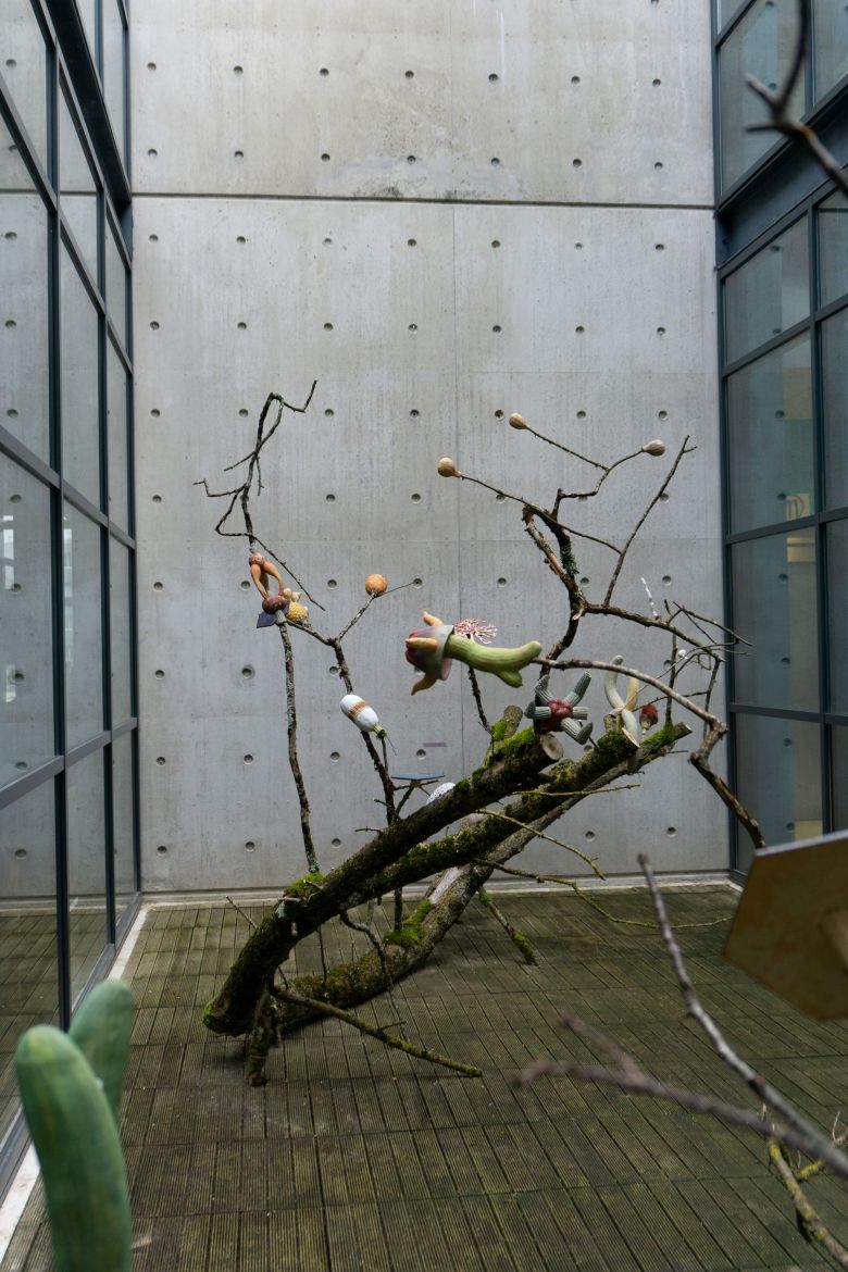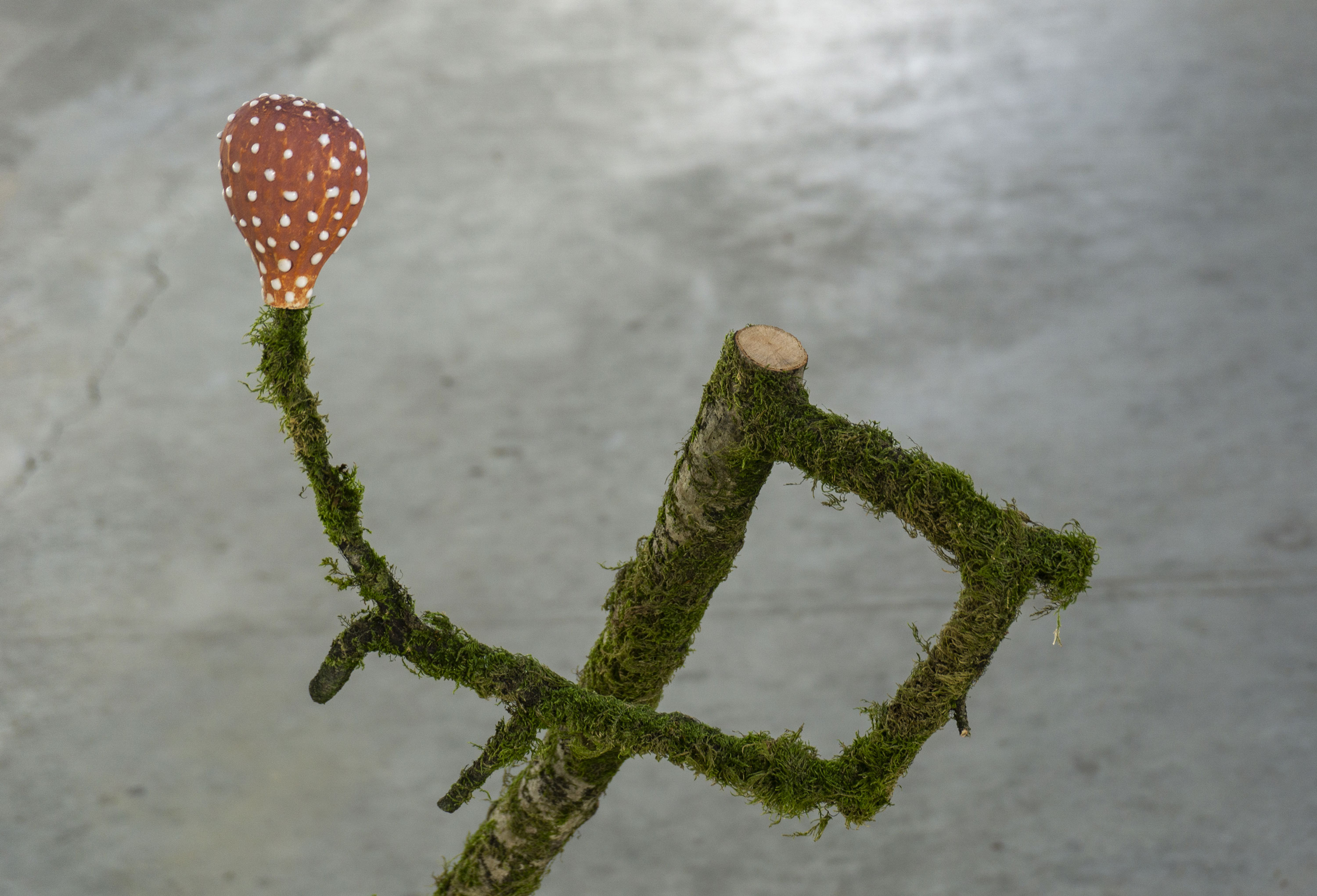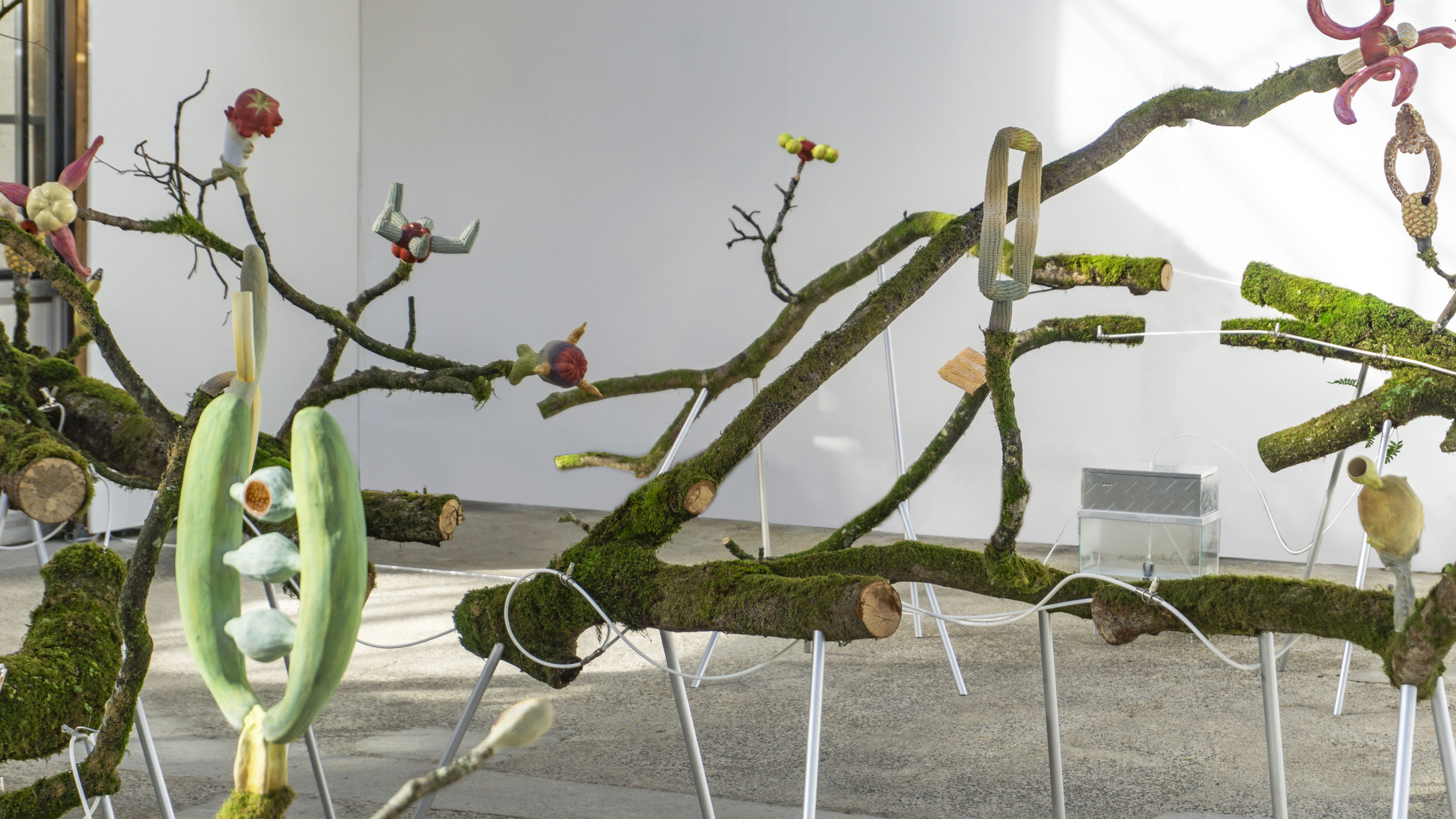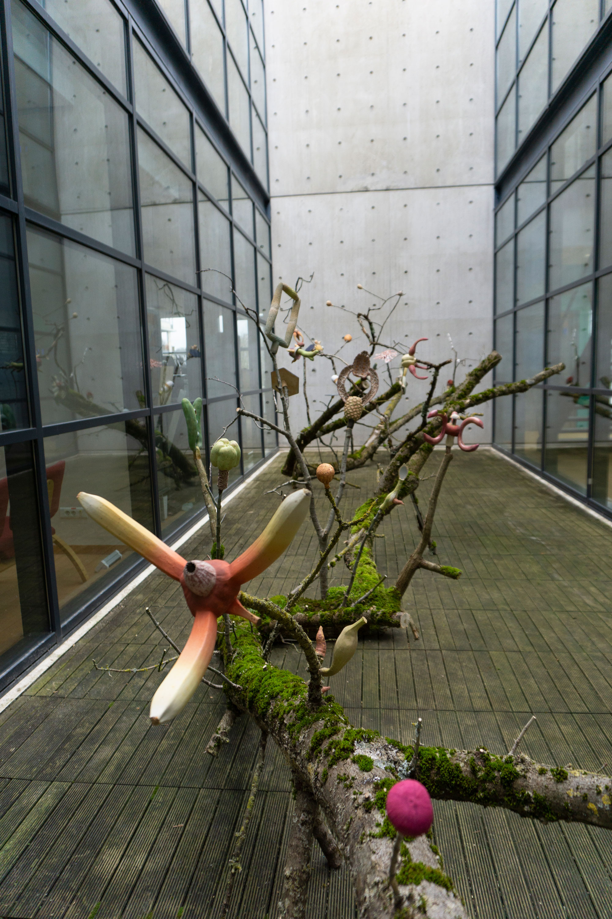 Cet ensemble présente des céramiques fichées sur des branches : elles représentent des espèces potagères en pleine mutation, dont on reconnaît l’aspect de certains fruits et légumes traditionnellement présents sur nos étals toute l’année, tels que des courgettes, des concombres, maïs ou poivrons. Chaque assemblage en céramique propose une hybridation unique de ces fruits aux carnations multiples. La découpe nette de certains hybrides permet d’en découvrir l’intérieur : on y trouve, non pas le système organique du fruit mais un réseau de veines et de fluides corporels.
