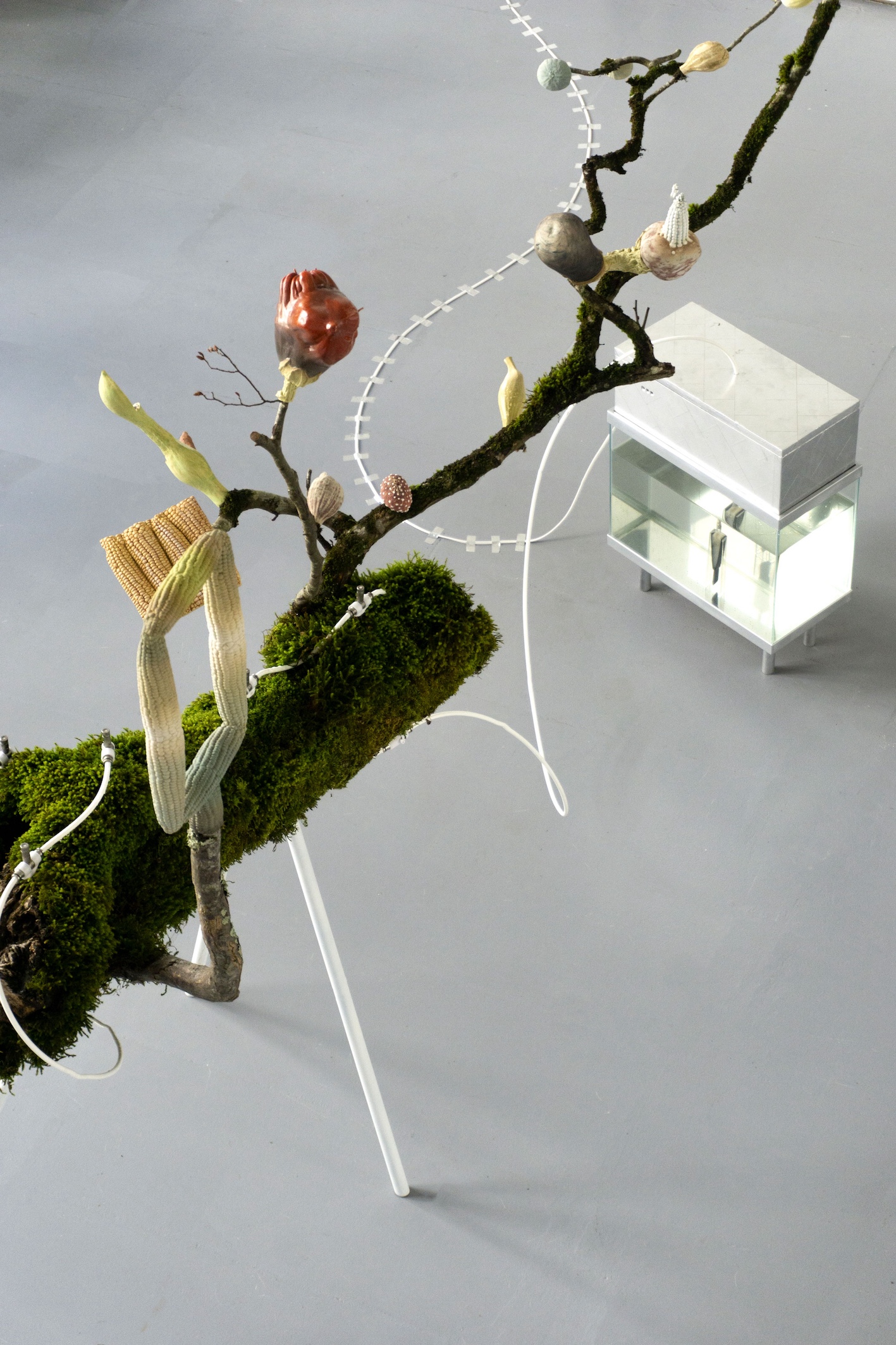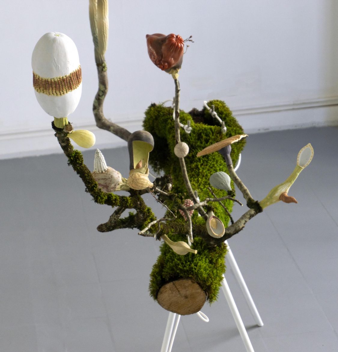 Pépin frais est une installation composée d’une grosse branche ramassée en forêt, recouverte de mousse, soutenue en équilibre par des béquilles, et parcourue par un réseau de tuyaux et un système de brumisation d’eau de pluie qui à intervalles réguliers alimente la mousse et la maintient en vie. En sortent des branches plus petites, qui cherchent notre regard en tendant comme sur un plateau des fruits que l’on croit reconnaitre mais dont l’intérieur révèle une carnation, des pépins, des fluides juteux, une matière complexe et sophistiquée. Des fruits dont la céramique exacerbe formes et couleurs. L’exploration de l’ensemble se termine par un cadre vide d’épis de maïs, un miroir que l’œuvre semble se tendre à elle-même, s’y rassembler et s’y interroger, nous remplir de perplexité. La mousse gonflée et épaisse suggère une encolure d’animal. En proximité avec le mot « pépin » surgit l’idée d’une pépinière singulière ; la machinerie du système de brumisation tend plutôt vers un dispositif médical de réanimation, de transfusion.