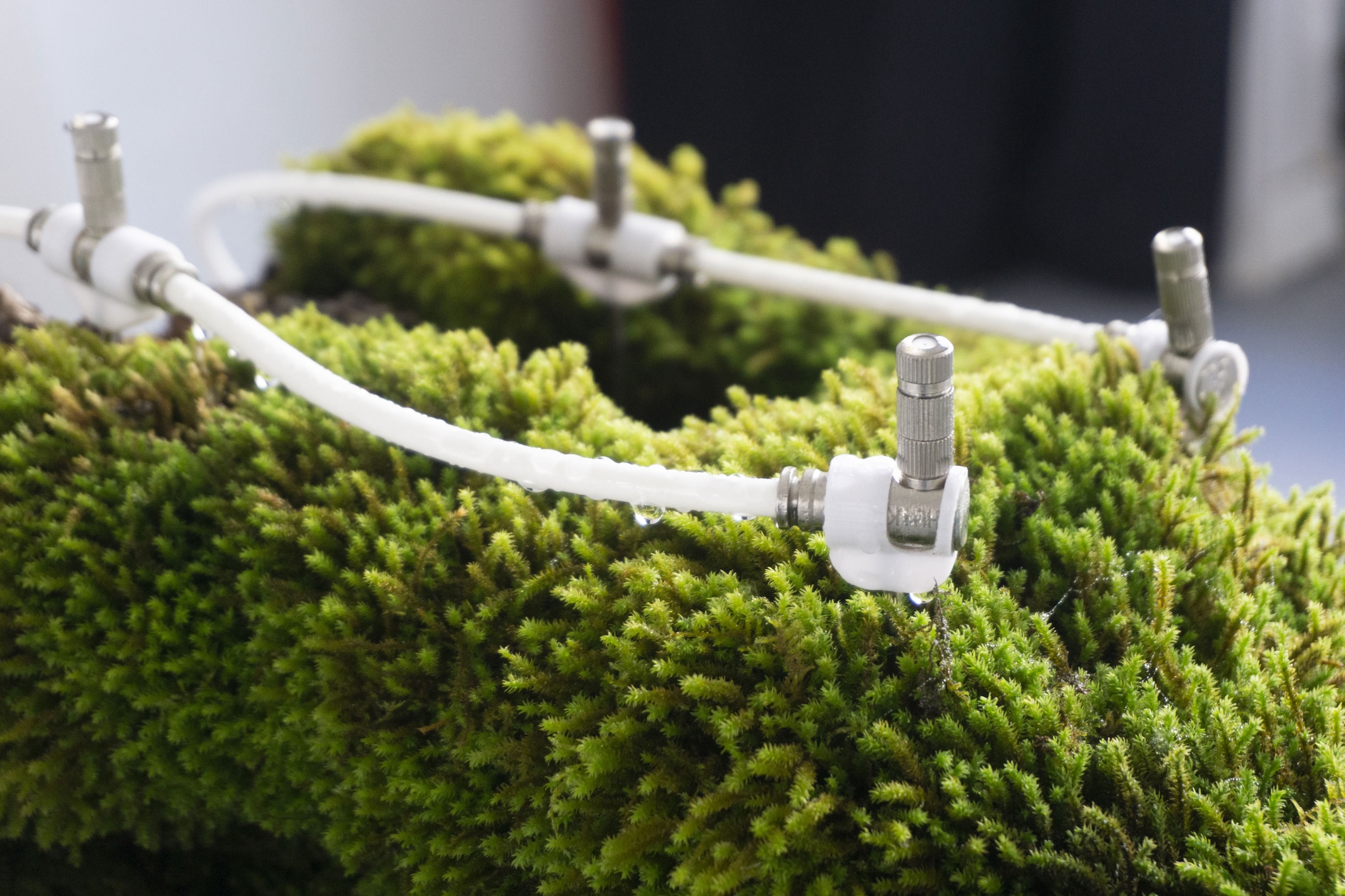 Le secret de l’installation semble bien résider dans la mousse, ce végétal tellement omniprésent qu’il jouit de peu de considération tout en se répandant en forêts extravagantes, minuscules, et une infinité de variétés. C’est la plante dans son état le plus primitif qui recouvre la terre quand les eaux se sont retirées, se lançant dans cette folle aventure en ignorant la racine, la tige et la fleur, une pionnière de la vie sur la terre ferme. Elle réussit presque à se rendre immortelle, n’ayant besoin que d’un peu d’eau et de lumière pour se régénérer et se reproduire. L’installation restitue ce formidable accélérateur de vie qu’est la mousse : quelques gouttes d’eau de pluie brumisée, et ses filaments se gonflent de singulières turgescences, et les sporogones, ces soies fragiles portant de légères capsules s’ouvrent en rosettes étoilées, diffusant un flux de fécondité. L’analogie se déploie tout naturellement vers ces fruits ultra-terrestres portés au bout des branches, contaminés par cet intense courant de vitalité, complètement régénérés.