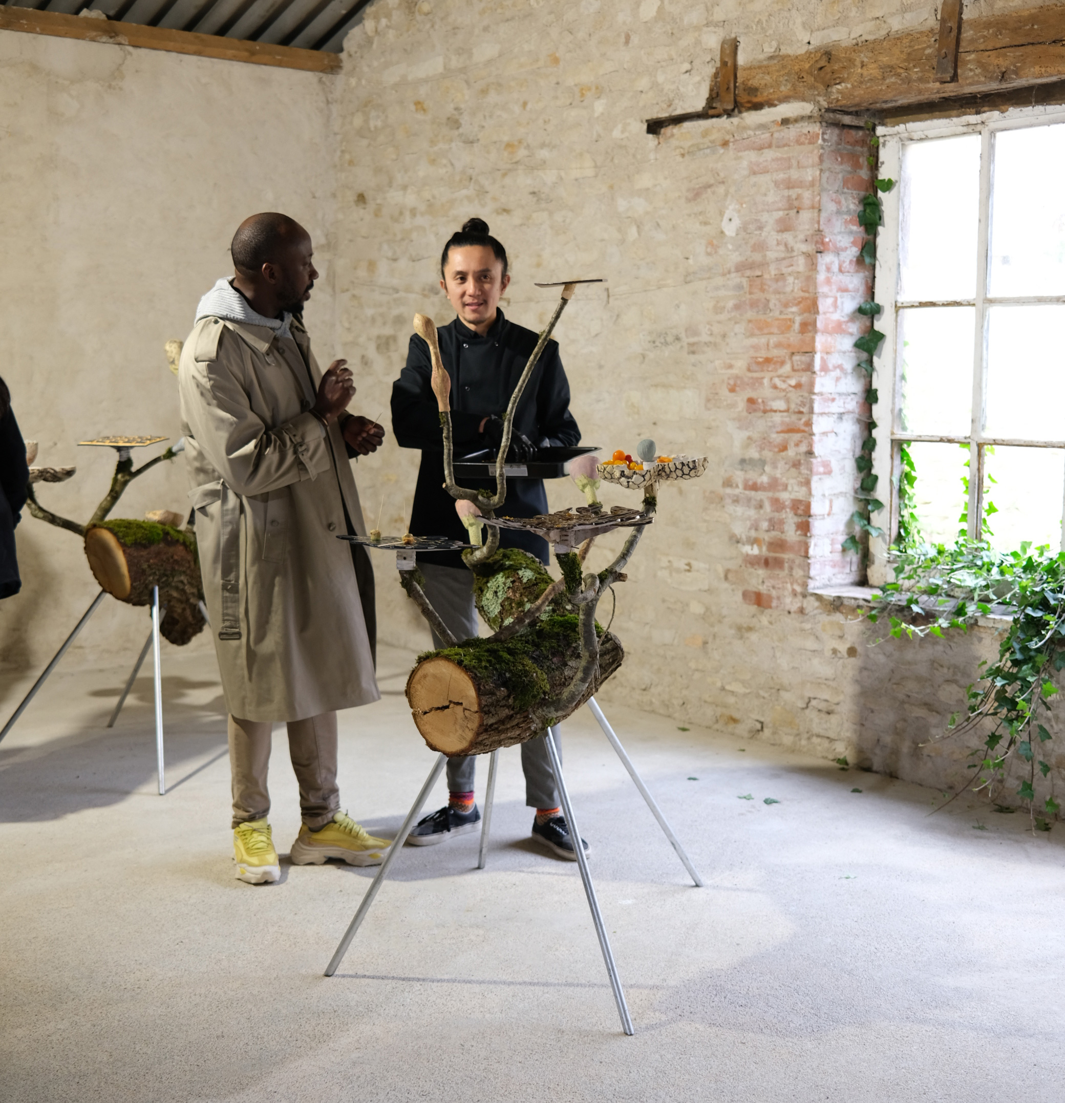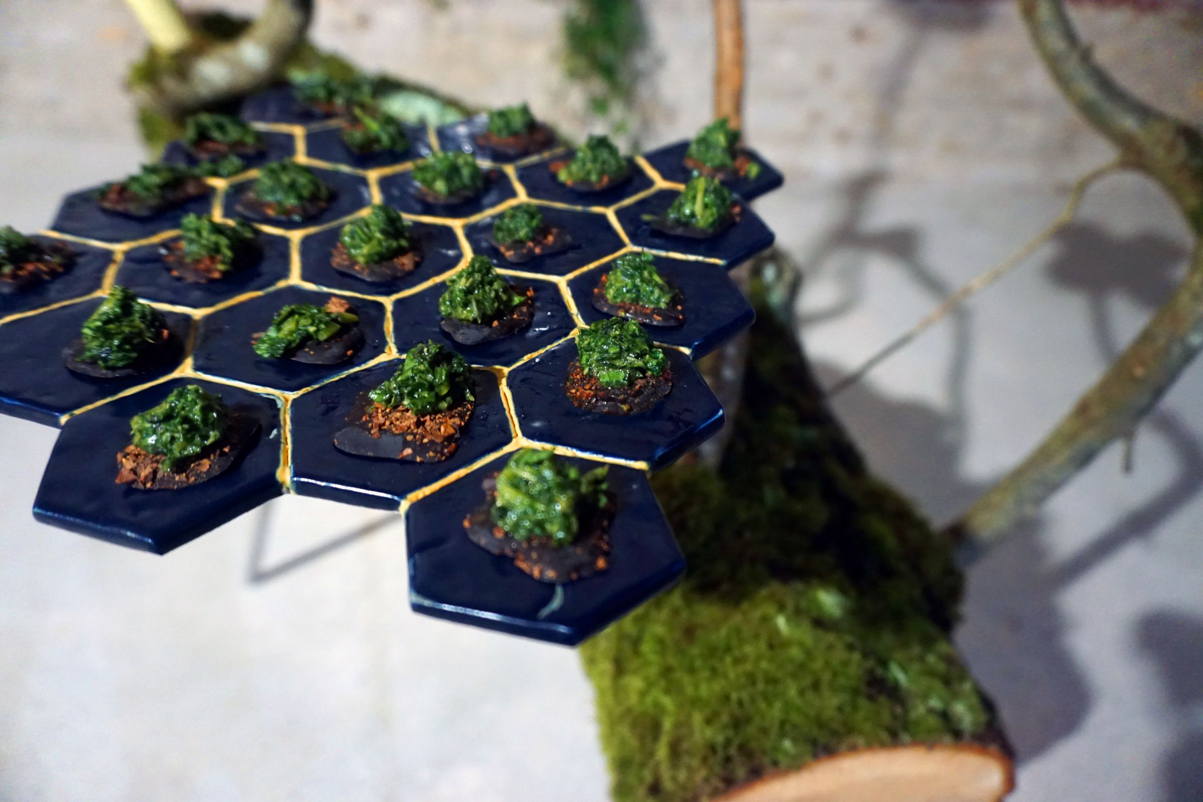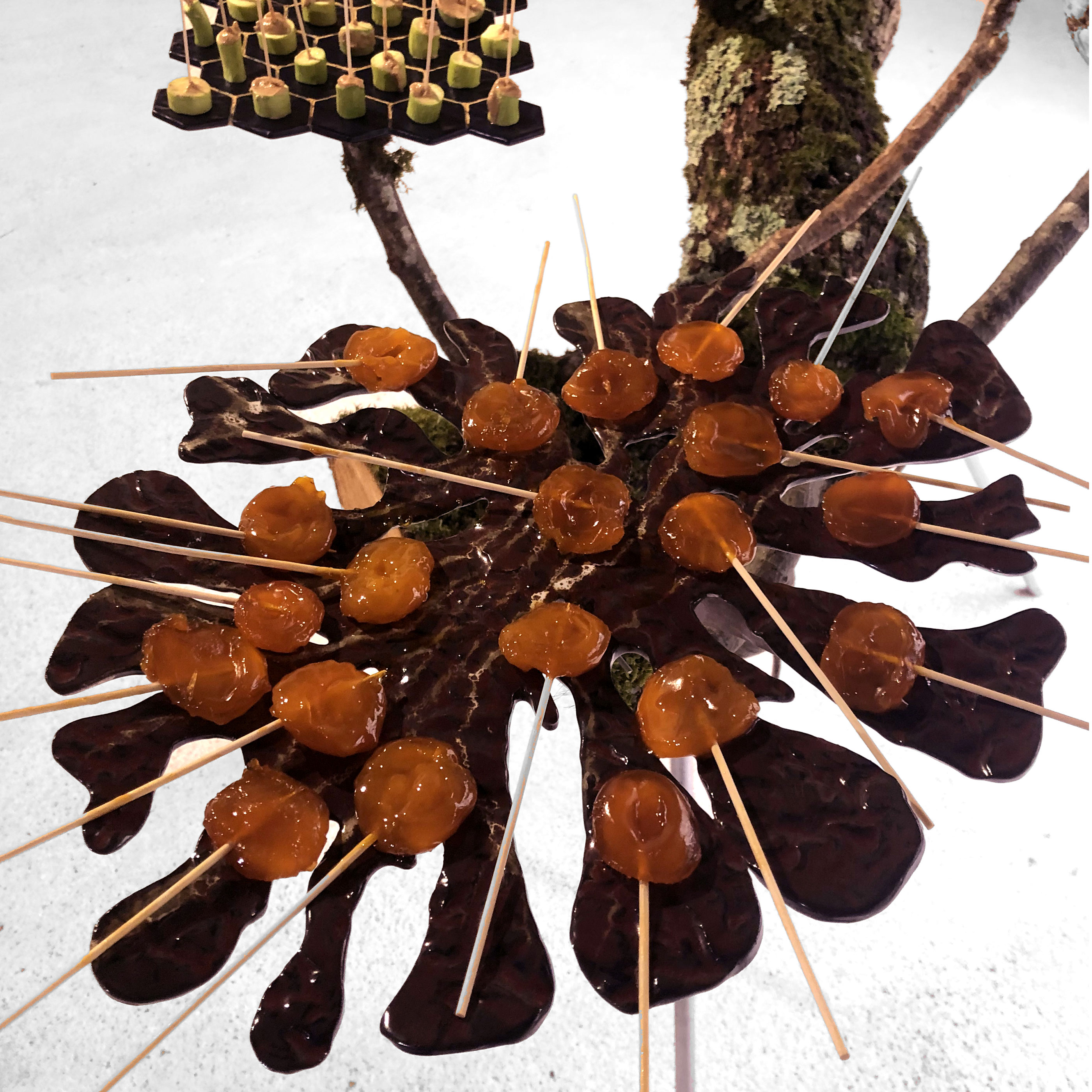 Des segments de troncs d’arbres maintenus à l’horizontale portent des céramiques plantées sur des branches représentant des espèces potagères en pleine évolution. Ces sculptures d’hybrides sont utilisées comme supports pour des bouchées végétariennes : Jaunes d’œufs marinés dans la sauce soja, Mesclun au raifort sur un médaillon de chocolat amer, tomates cerises remplies de jus de radis noir, carottes cuites dans une décoction de gingembre thaïlandais…