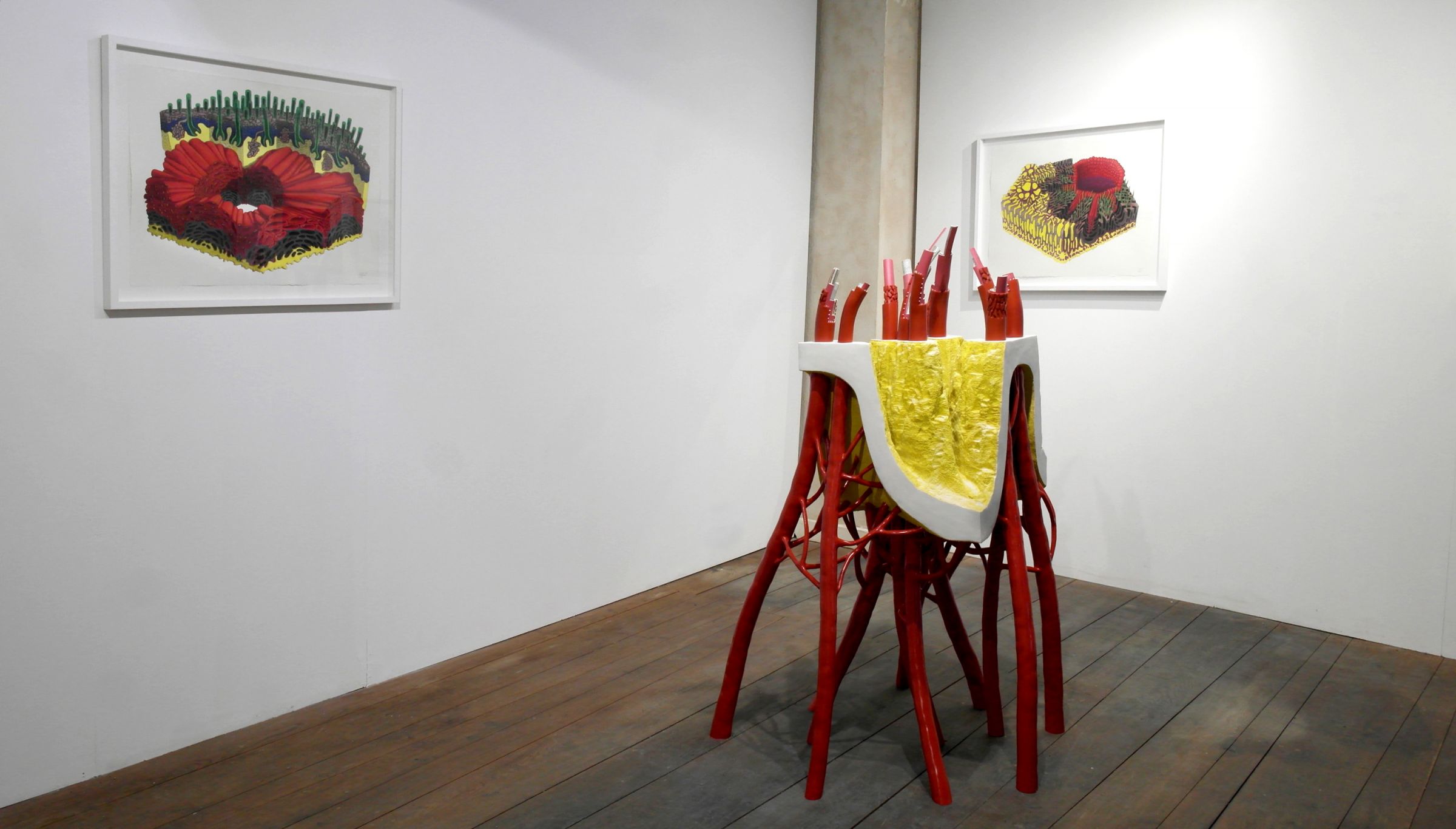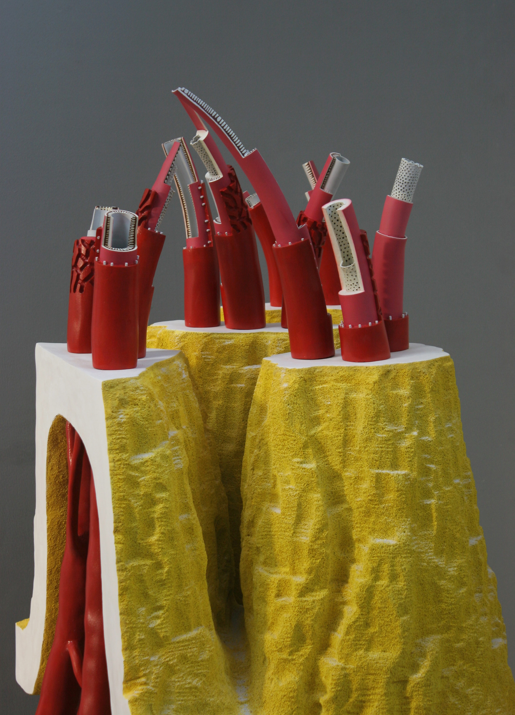 Béton cellulaire, résine époxy, tubes pvc et matériaux divers.