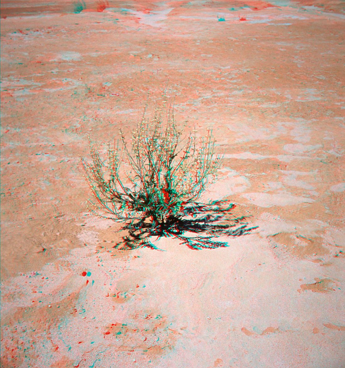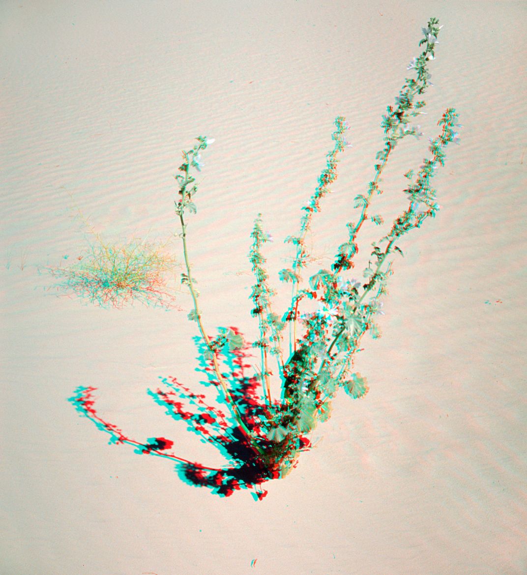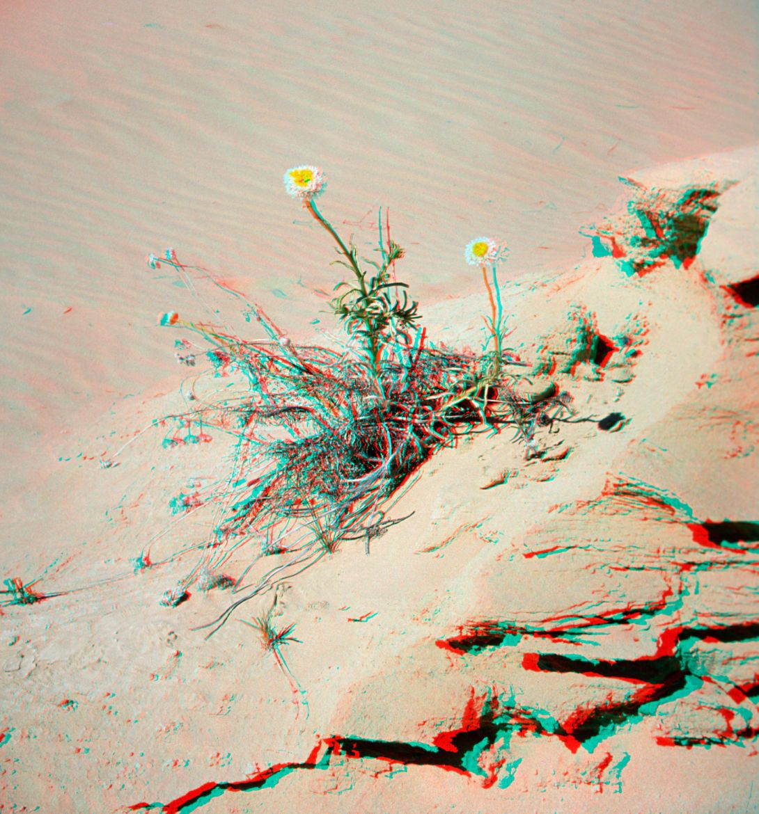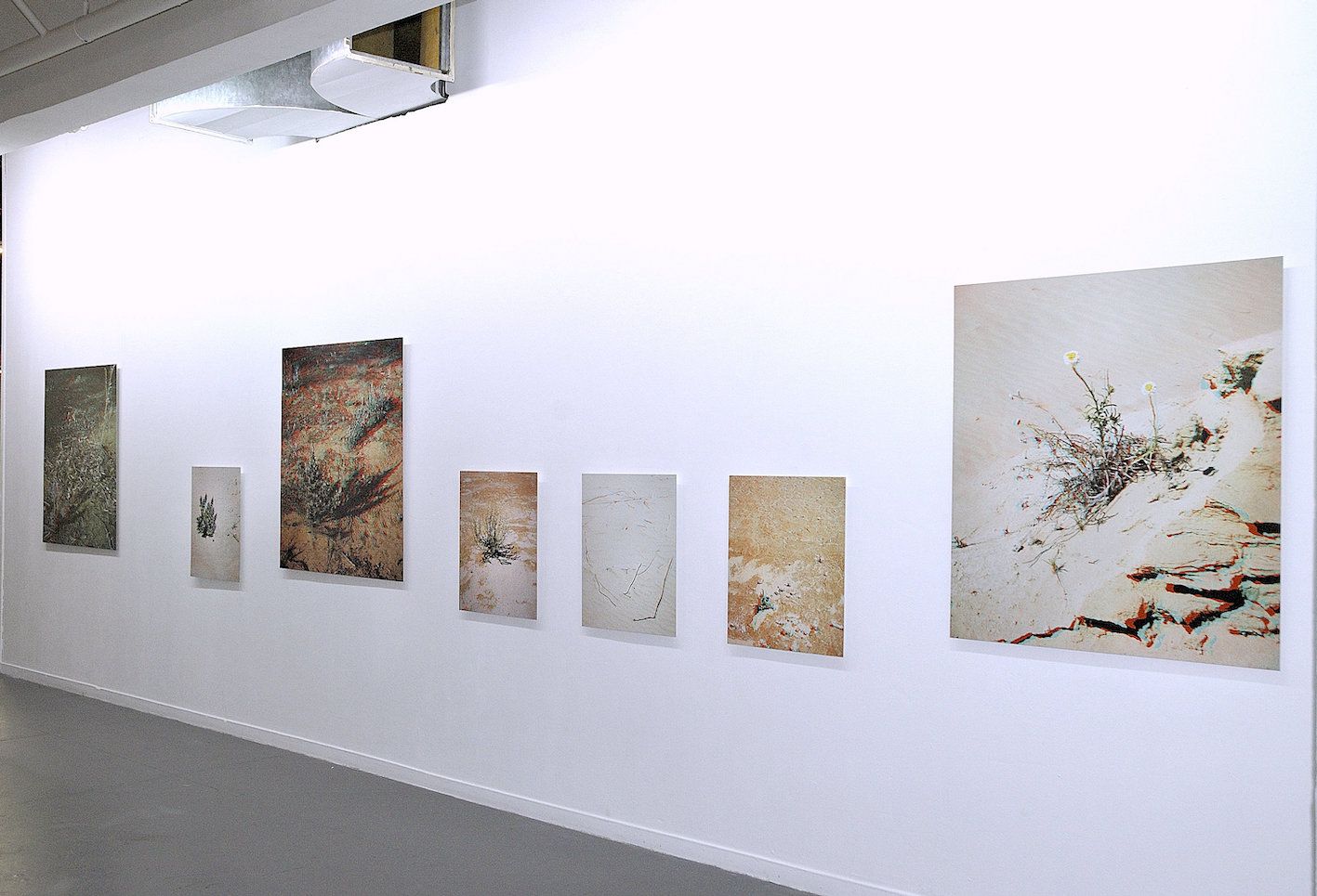 Ces photographies en relief présentent petites plantes, vivant dans le désert australien baptisé Lake Mungo, ancien lac asséché il y a 20000 ans. Ce site représente une source d’informations archéologiques emblématiques de l’évolution de la vie australienne. Les traces de présence aborigène y sont les plus anciennes découvertes jusqu’à maintenant (50000 ans), et sont demeurées constantes jusqu’à nos jours malgré la désertification radicale. Les petites plantes photographiées à ras le sol, sous leur apparente fragilité, traduisent cette capacité tenace à trouver les ressources pour survivre en milieu apparemment hostile.