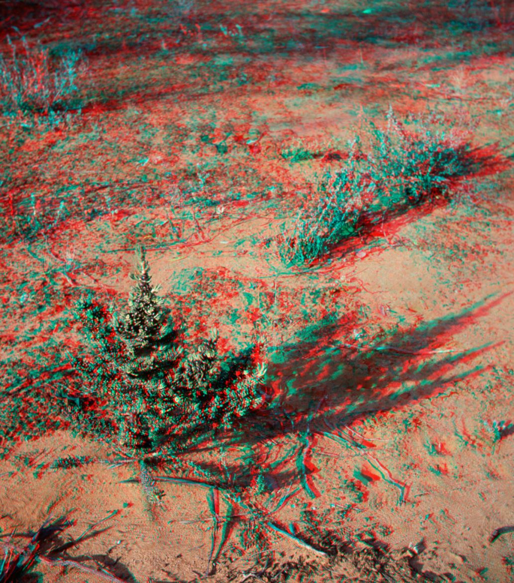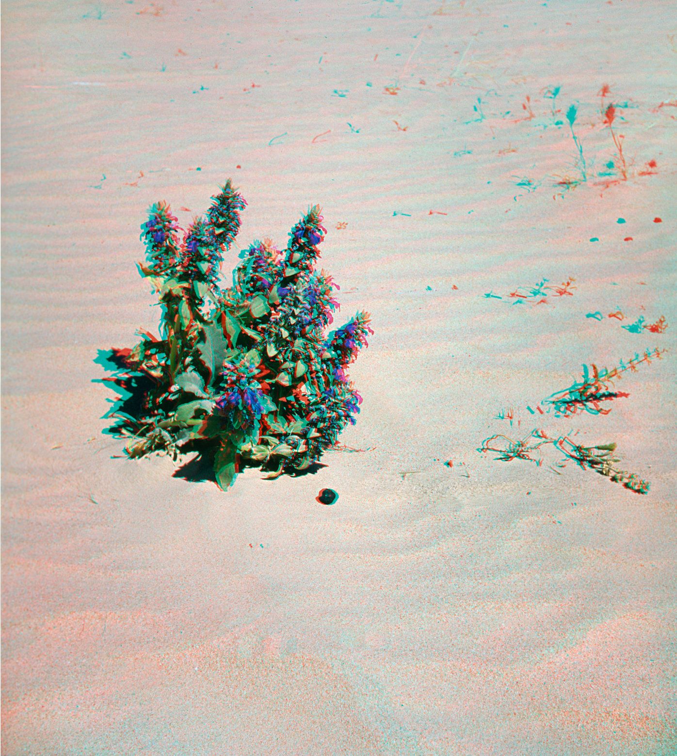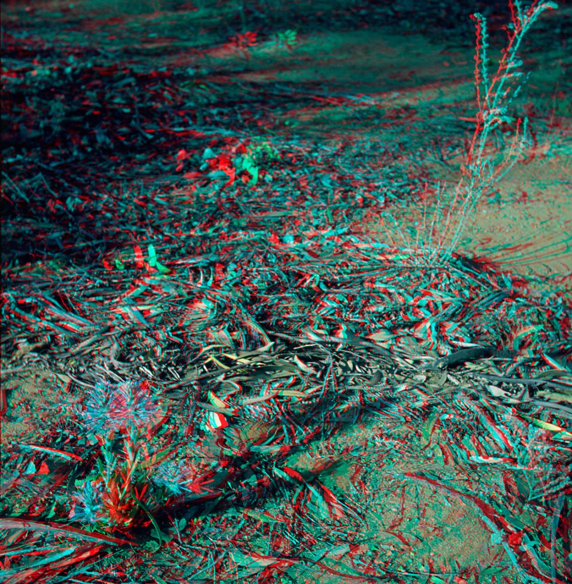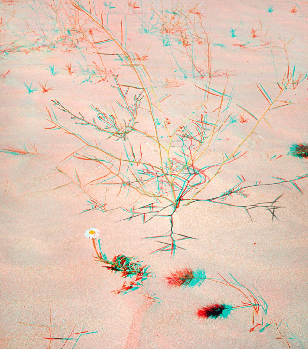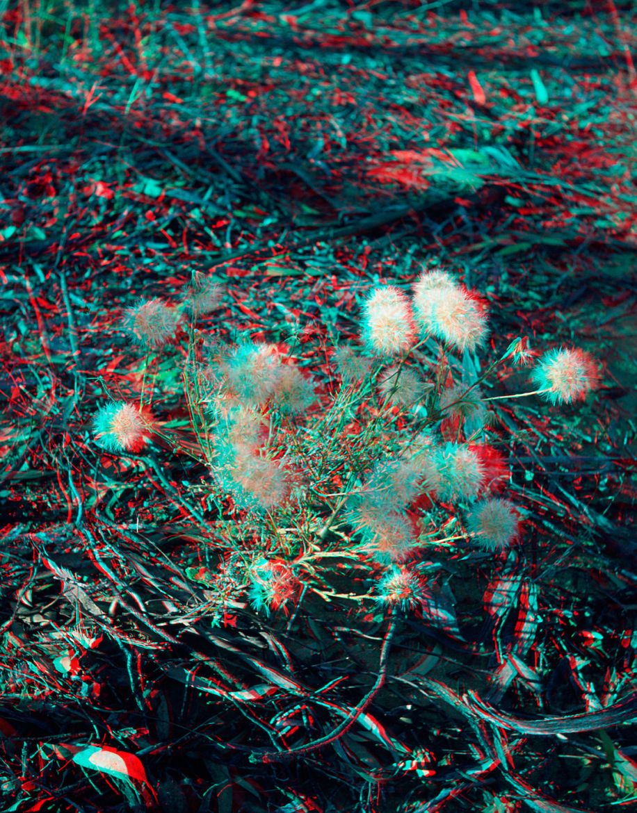Ces photographies en relief présentent petites plantes, vivant dans le désert australien baptisé Lake Mungo, ancien lac asséché il y a 20000 ans. Ce site représente une source d’informations archéologiques emblématiques de l’évolution de la vie australienne. Les traces de présence aborigène y sont les plus anciennes découvertes jusqu’à maintenant (50000 ans), et sont demeurées constantes jusqu’à nos jours malgré la désertification radicale. Les petites plantes photographiées à ras le sol, sous leur apparente fragilité, traduisent cette capacité tenace à trouver les ressources pour survivre en milieu apparemment hostile.