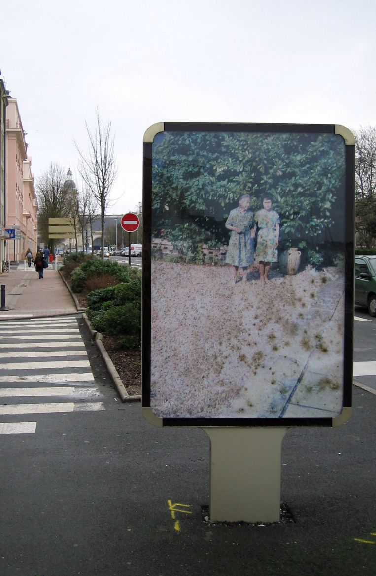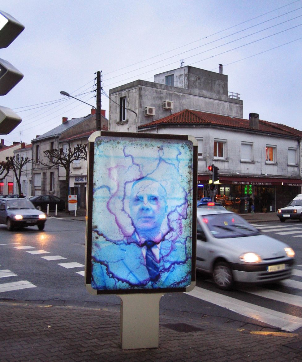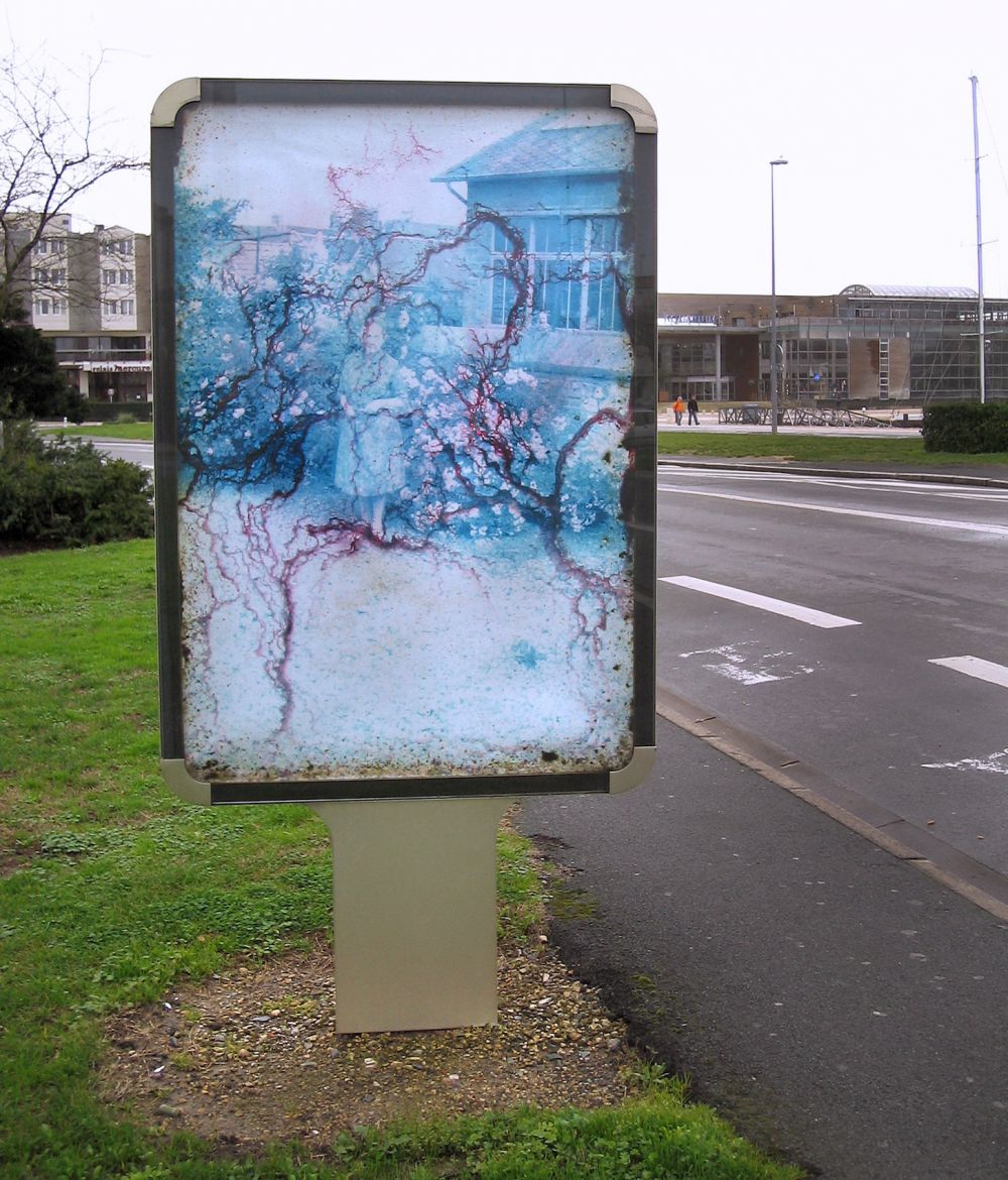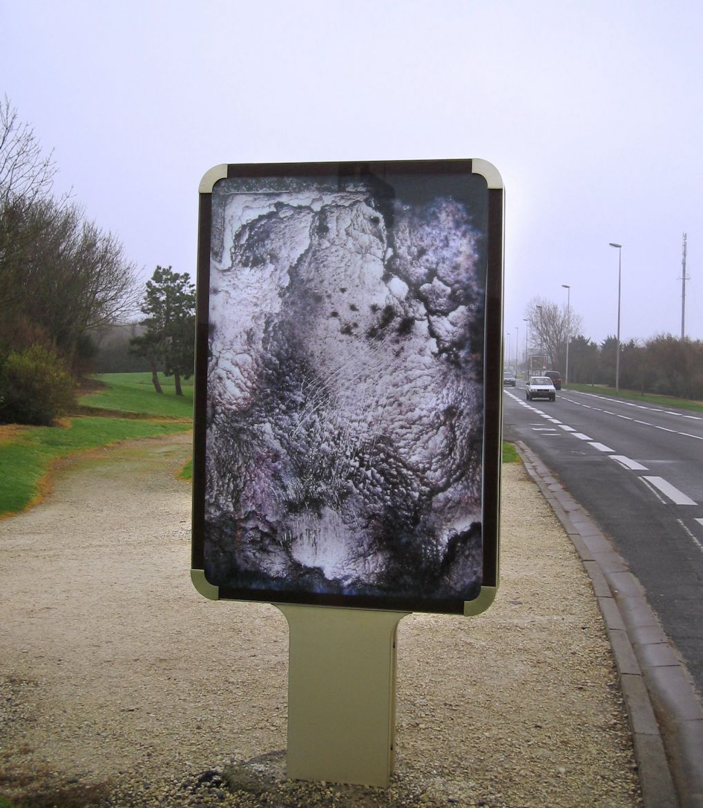 Cette série a été réalisée à partir d’un ensemble de diapositives verticales trouvées (photos- souvenir de paysages, portraits d’ancêtres) dans un état de dégradation important, parfois jusqu’à disparition de l’image initiale. L’émulsion est altérée par l’humidité et le développement de moisissures. La transformation produite par l’activité des moisissures donne une profondeur aux images, comme une 3e dimension. L’image semble incarnée et inscrite dans une durée, celle du processus de transformation. Des tirages sont exposés dans le mobilier urbain (sucettes Decaux, abris bus), emplacement réservé aux images publicitaires avec lesquelles elles opèrent un contraste maximum.