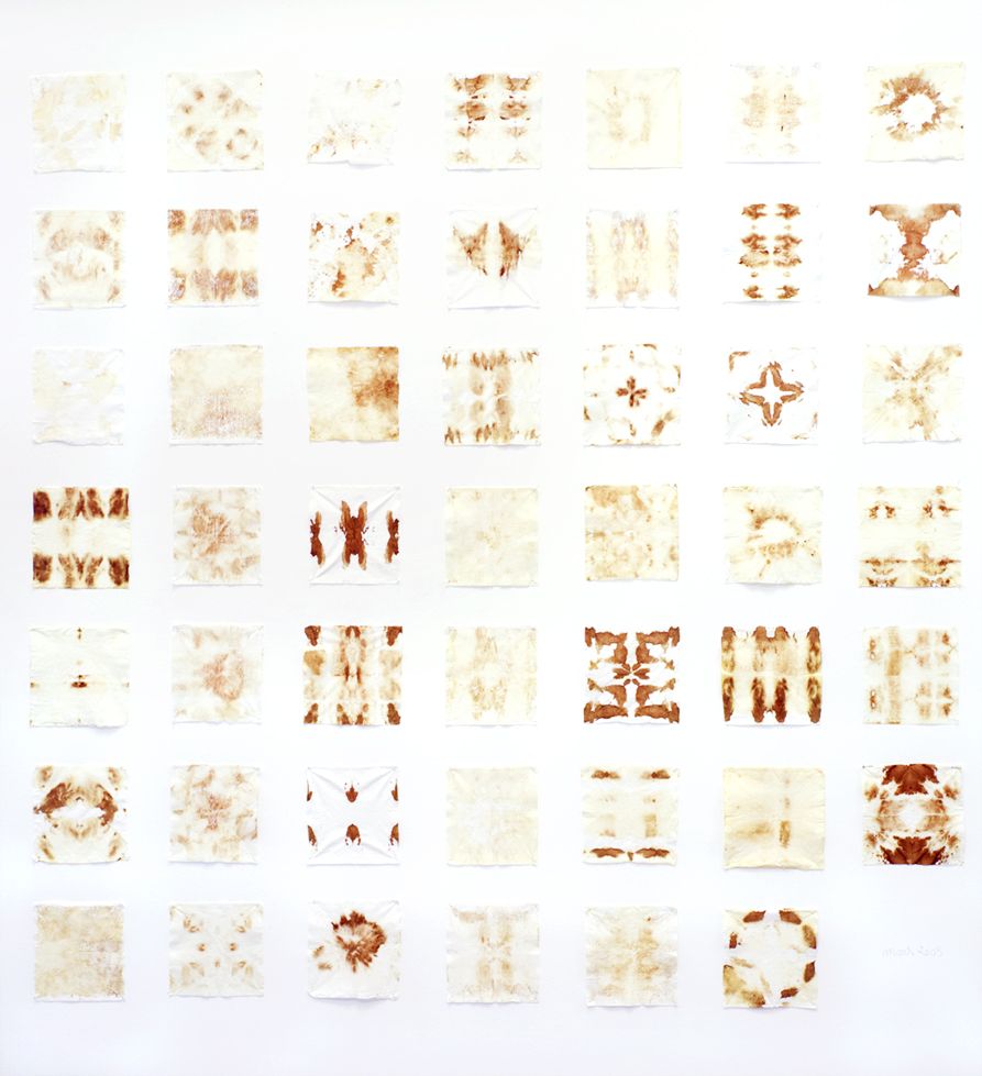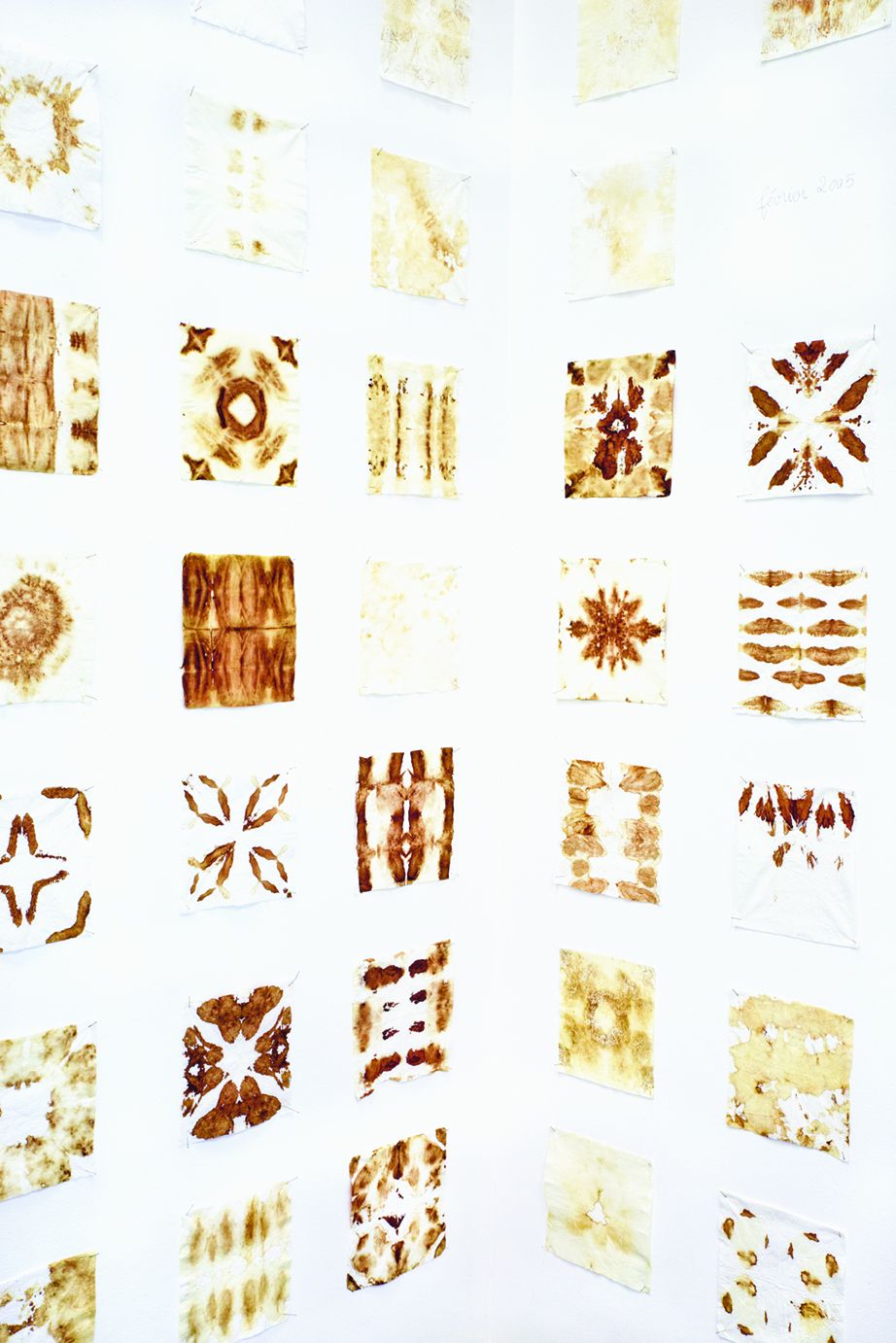 Cette activité a lieu durant les menstruations, à chaque cycle. Elle consiste en l’utilisation de petits mouchoirs en papiers pliés au moment des règles, qui remplacent les serviettes et les tampons hygiéniques. Une fois imprégnés, les mouchoirs sont dépliés et épinglés au mur. L’ensemble représente actuellement une série d’environ 450 mouchoirs classés par mois, et constitue une forme de journal intime des cycles du corps et de l’activité artistique. Chaque mois, le nombre et l’intensité de l’imprégnation des mouchoirs varient en fonction du flux mais aussi en fonction de ma disponibilité. Dans l’idée d’un recyclage productif de ce flux mensuel qui signifie lui-même l’absence de production du corps, cette activité permet de transformer une perte en ressource. Il s’agit de retrouver une activité picturale primordiale, critique. L’aspect décoratif des mouchoirs recouvrant les murs, sorte de papier peint aux motifs répétitifs, nous renvoie avec ironie aux travaux féminins des magazines, ainsi qu’à la véritable finalité pratique des objets d’art.